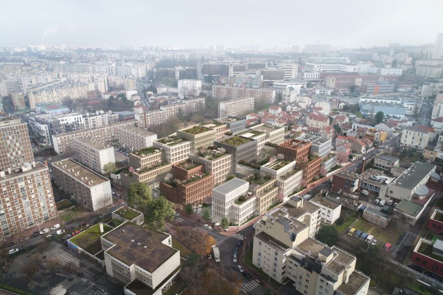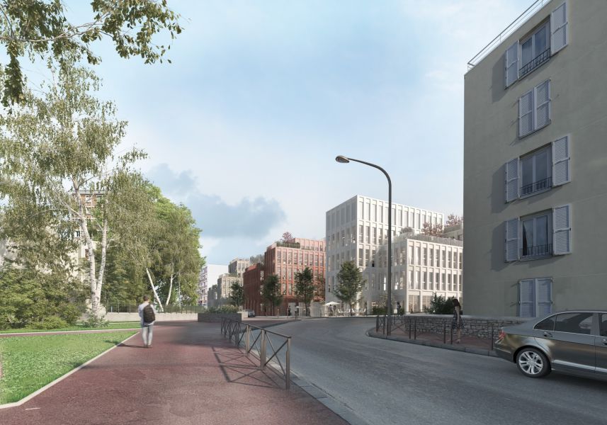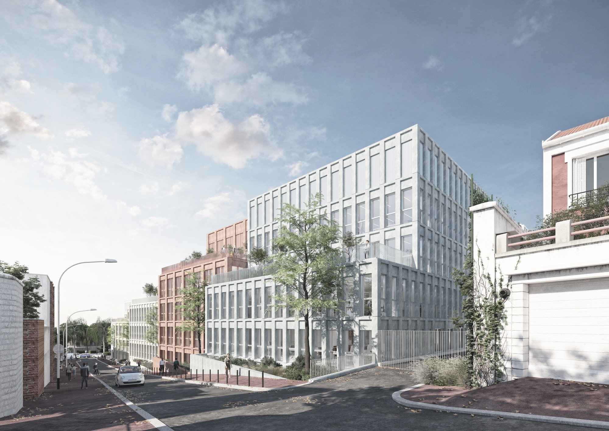 The site sits in the steep slope of the Bièvre Valley in the south-eastern suburbs of Paris. An awareness of the specific geography of the site is at the heart of this project for offices, and is revealed through transparencies and dynamic visual openings. The entire development is organised along three little valleys running north–south, allowing for the organisation of the different buildings and functions across the slope, each parallel to the other. The 11m-height difference across the site implies the creation of an upper ground-floor level at the level of Rue Pascal (G+4) and a lower ground level at Rue du Président Allende.