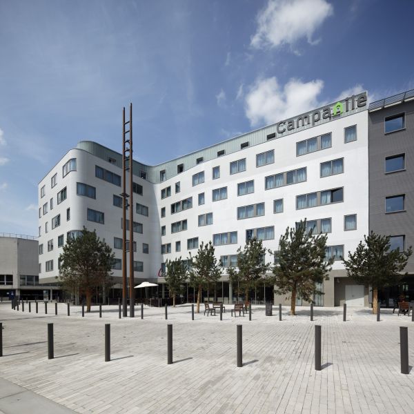 In both function and architecture, the hotel is the first thing met by travellers exiting from the south side of Amiens' Gare de Nord. Largely open onto the public space, its ground floor reads as an extension of the station's forecourt. The main body of the 6-storey building takes the form of a large, curving, concrete sail, rounded at the principal angles so as so soften its massing and recall the stretching curves of the railway tracks that run alongside the space. The choice of white concrete pays homage to Auguste Perret, architect of the station, the Place Alphonse Figuet and the tower. A top floor in backlit, profiled glass highlights the curves of the facade and reinforces the presence of the building at night, a nod at the neon signs that characterise station surroundings. The organic composition of the windows amplifies the dynamism of the facade despite the strict regularity of its structural and functional grid.