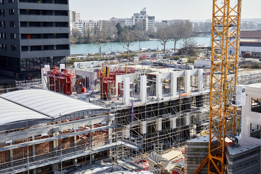 The mixed-use tower (housing and offices), 53 metres tall, contributes to the dialogue between the other recently constructed high-rise buildings in the Confluence district. Our proposal consists of slimming down the form and blurring its edges, in order to blend into the landscape. The base is largely open, in direct dialogue with the public space. The spaces can be adapted for other uses, reversed, and remodelled by means of a rationalised structure.