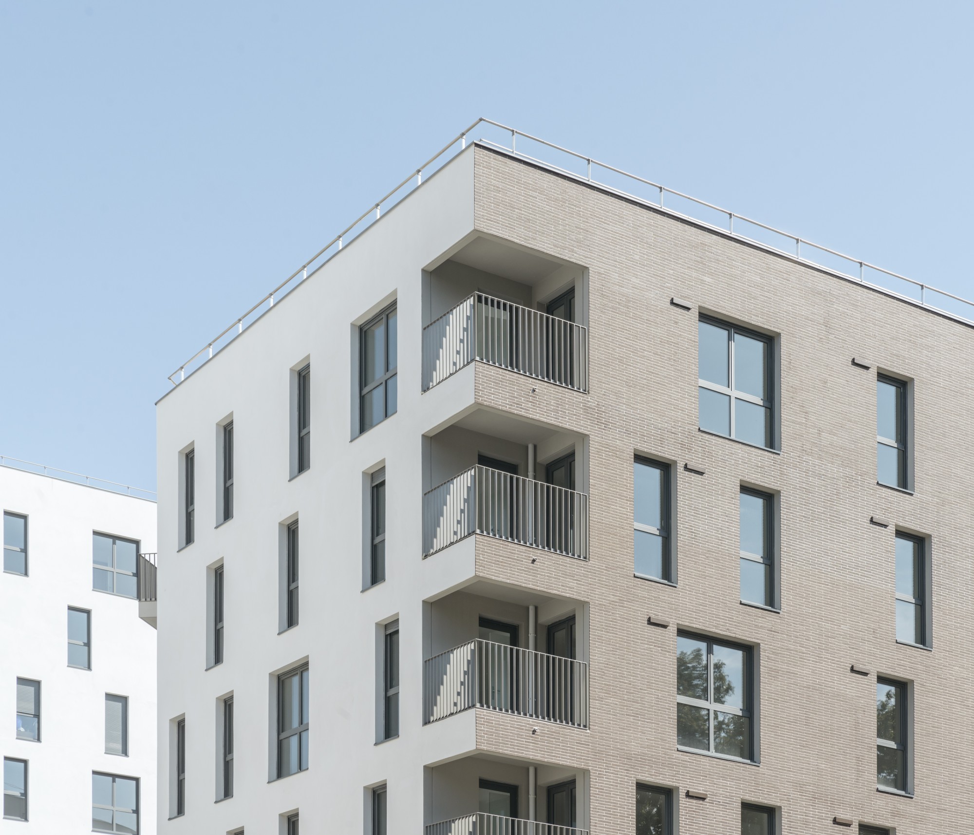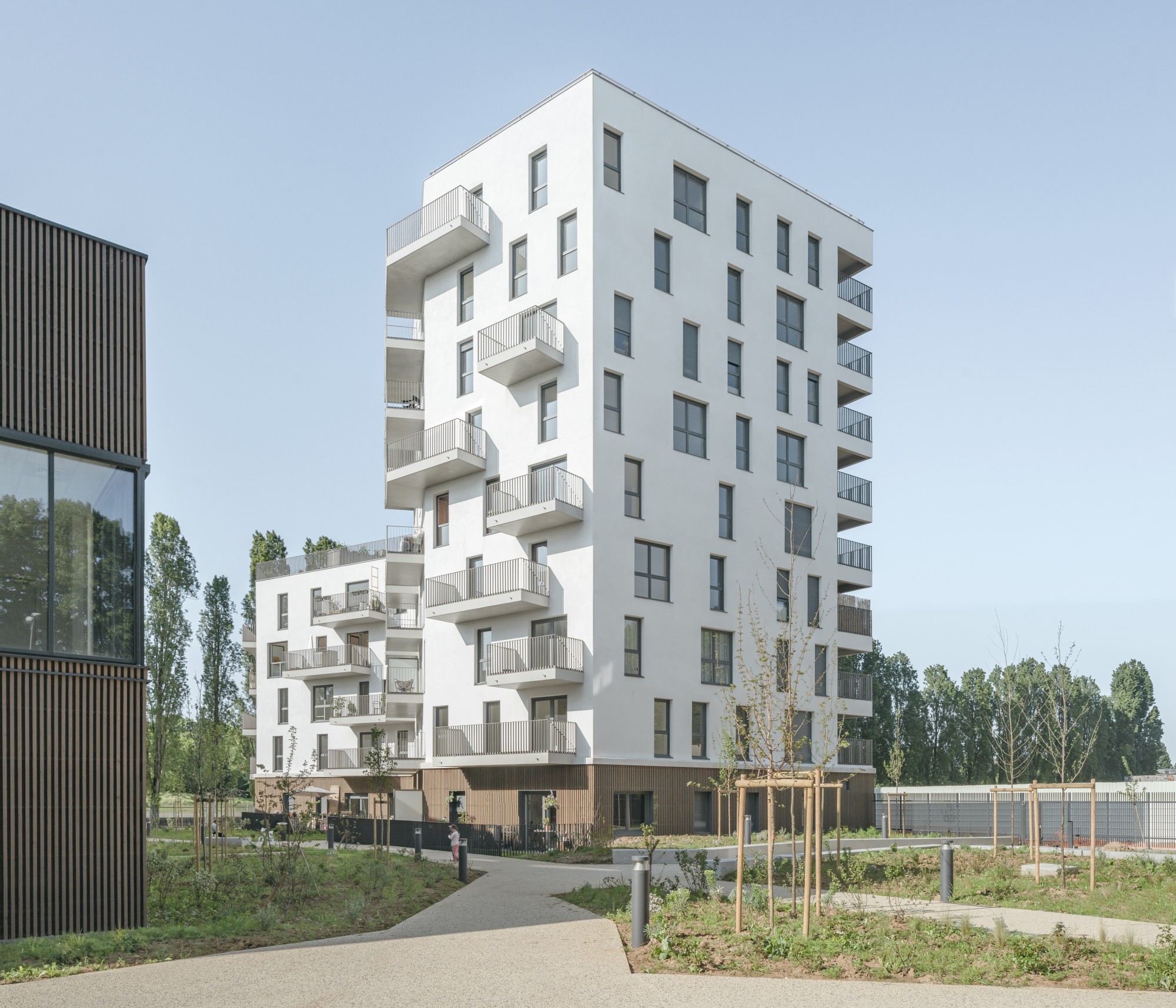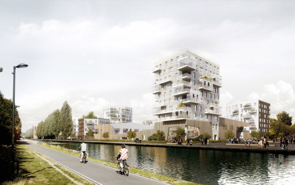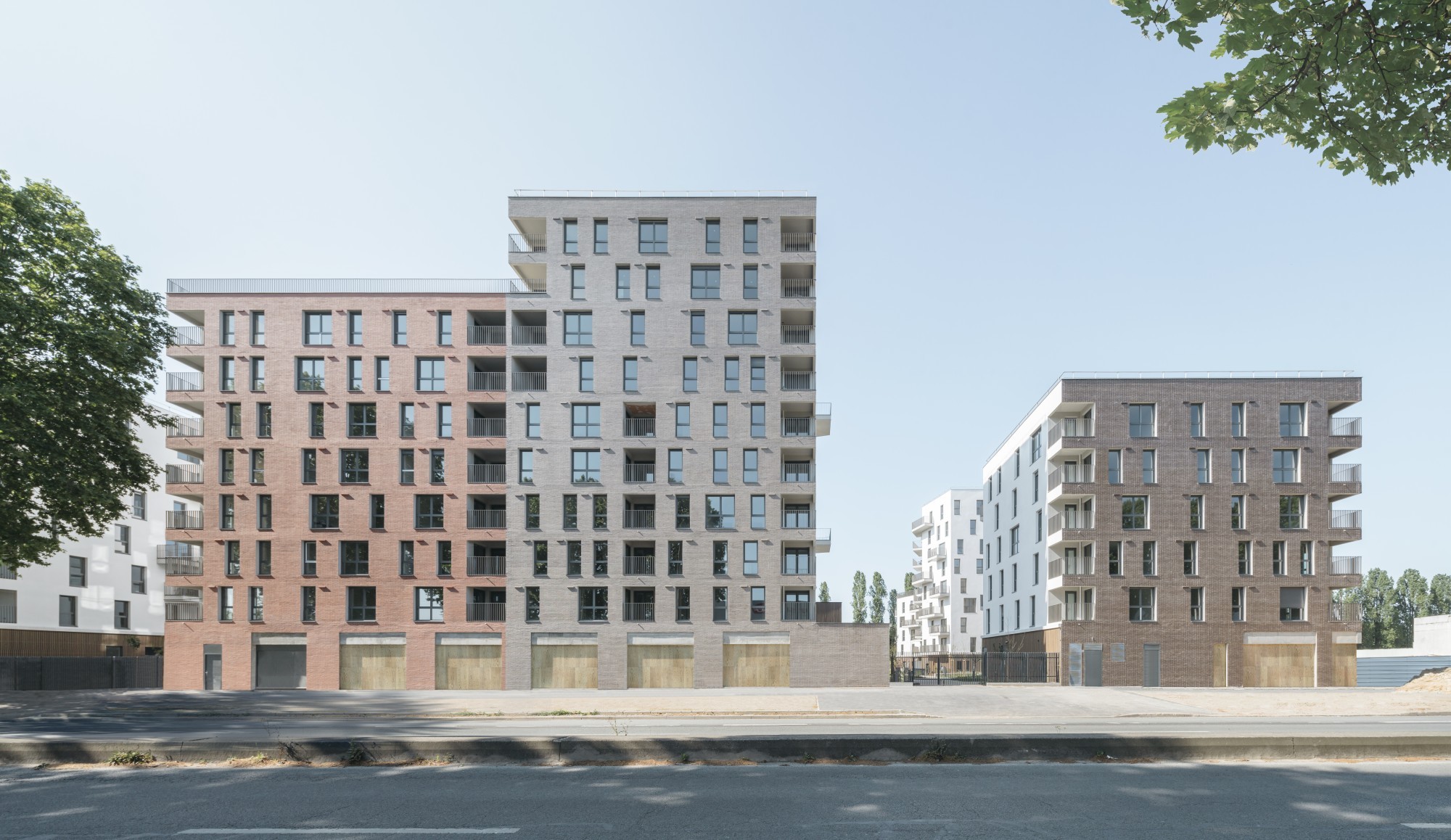 The housing scheme for plot J1 of the Écocité Canal de l'Ourcq development zone is broken down into seven buildings of different heights, arranged over the site in accordance with the urban and landscaping principles established by Devillers & Associés, urban planner for the Écocité development. In order to reinforce the Rue de Paris as an urban thoroughfare, while also sheltering the centre of the city-block from this busy road, our architectural scheme forms a sufficiently solid screen while leaving visual openings through to the canal.