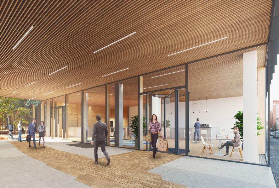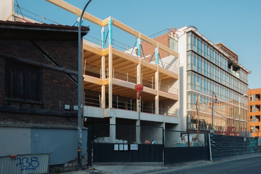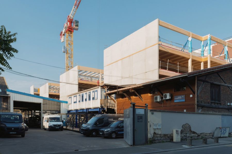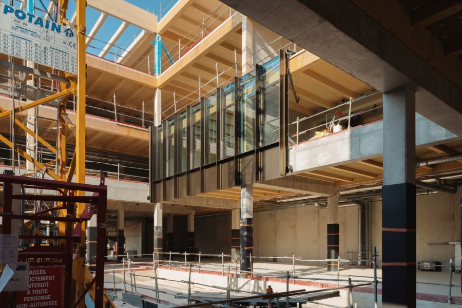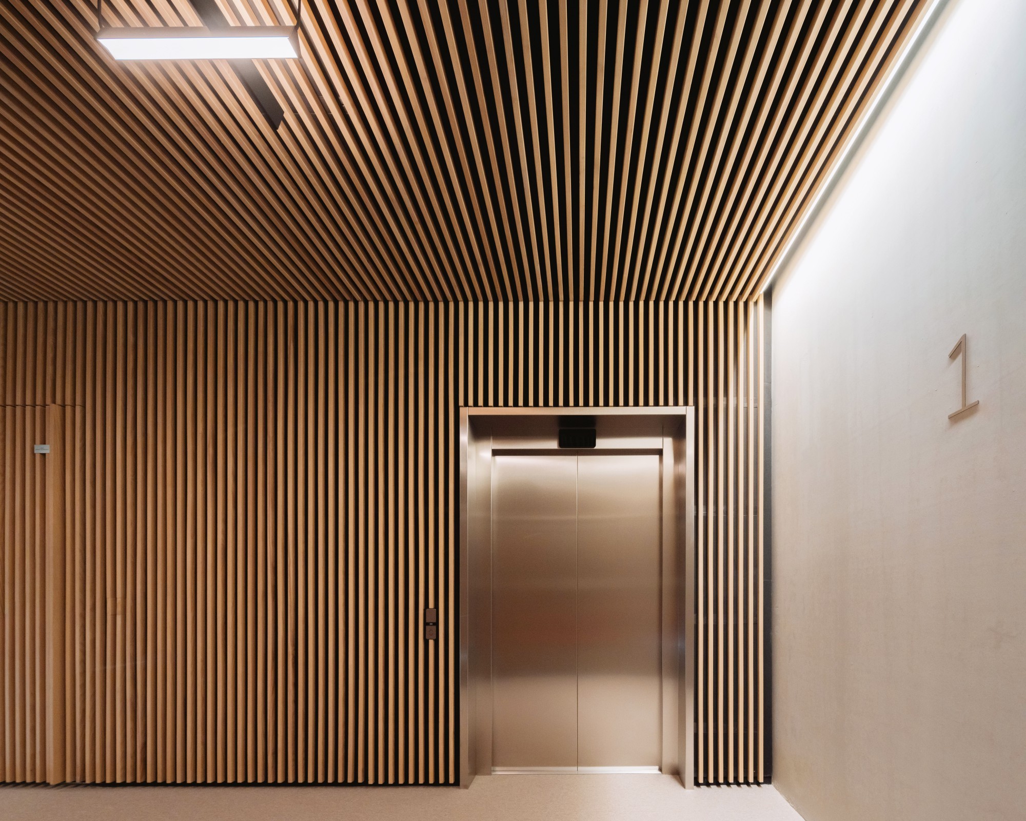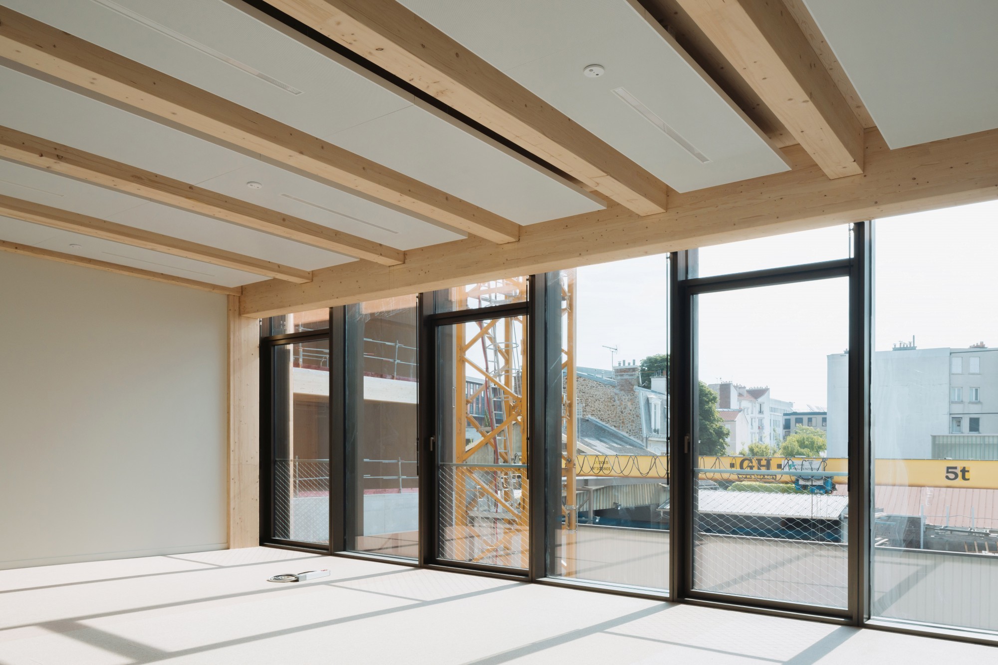 La palette de matériaux est volontairement restreinte, brute et cohérente entre l’extérieur et l’intérieur. Le bois est le fil conducteur partout visible d’un ensemble verre-aluminium-béton. Dans la hauteur, la trame fine de l’enveloppe se prolonge en garde-corps vitré sans lisse haute pour exprimer un couronnement évanescent, accueillant la vie sur les toits.