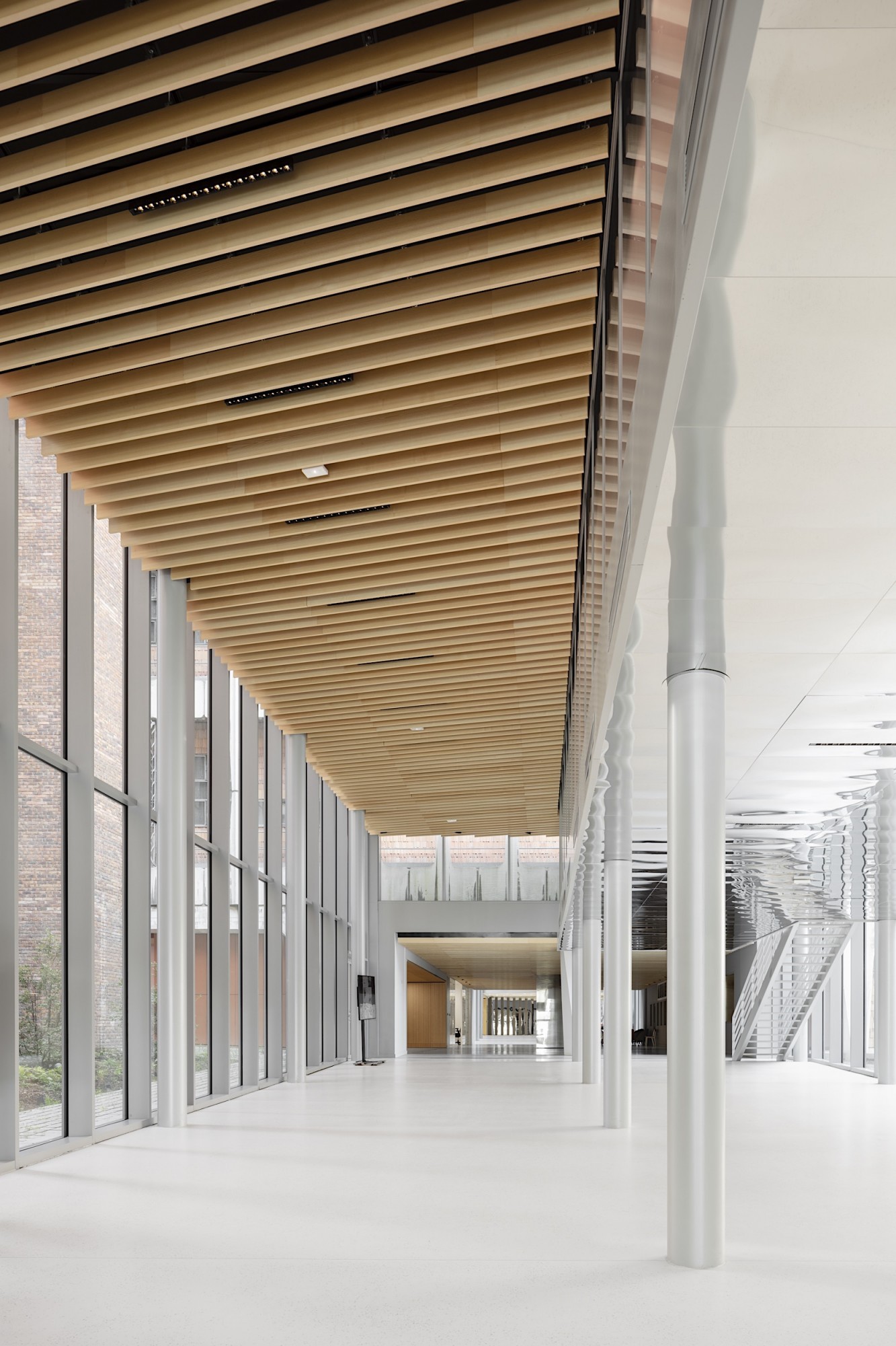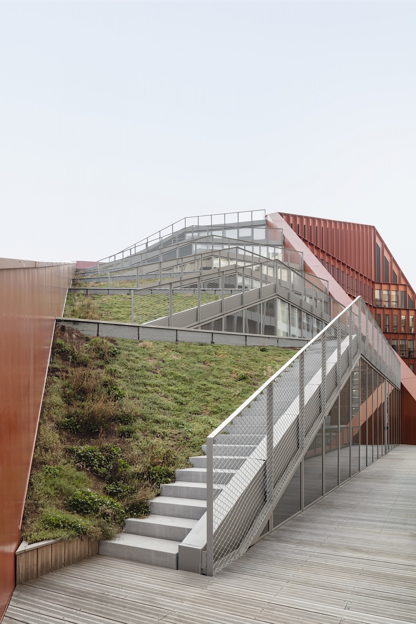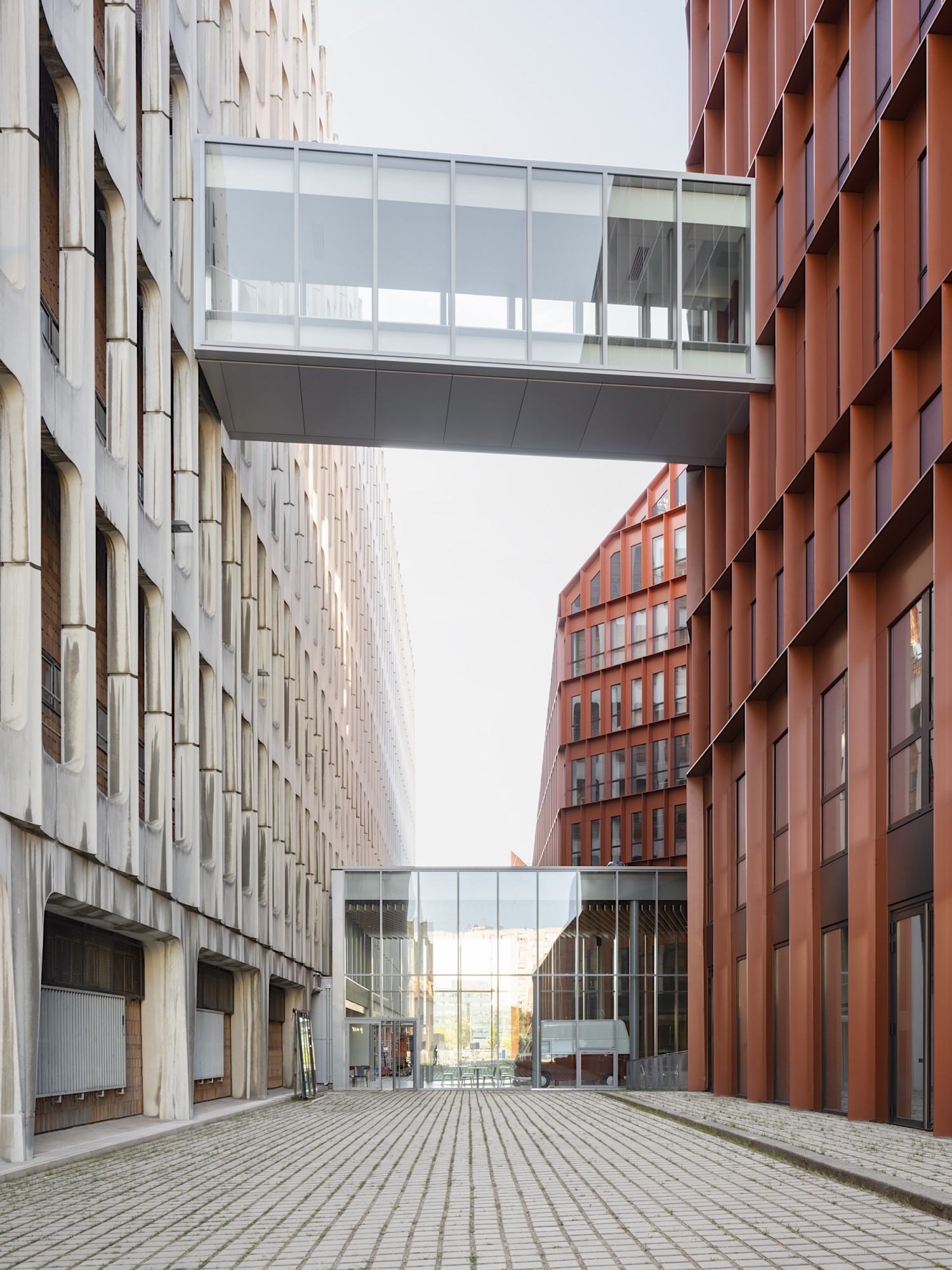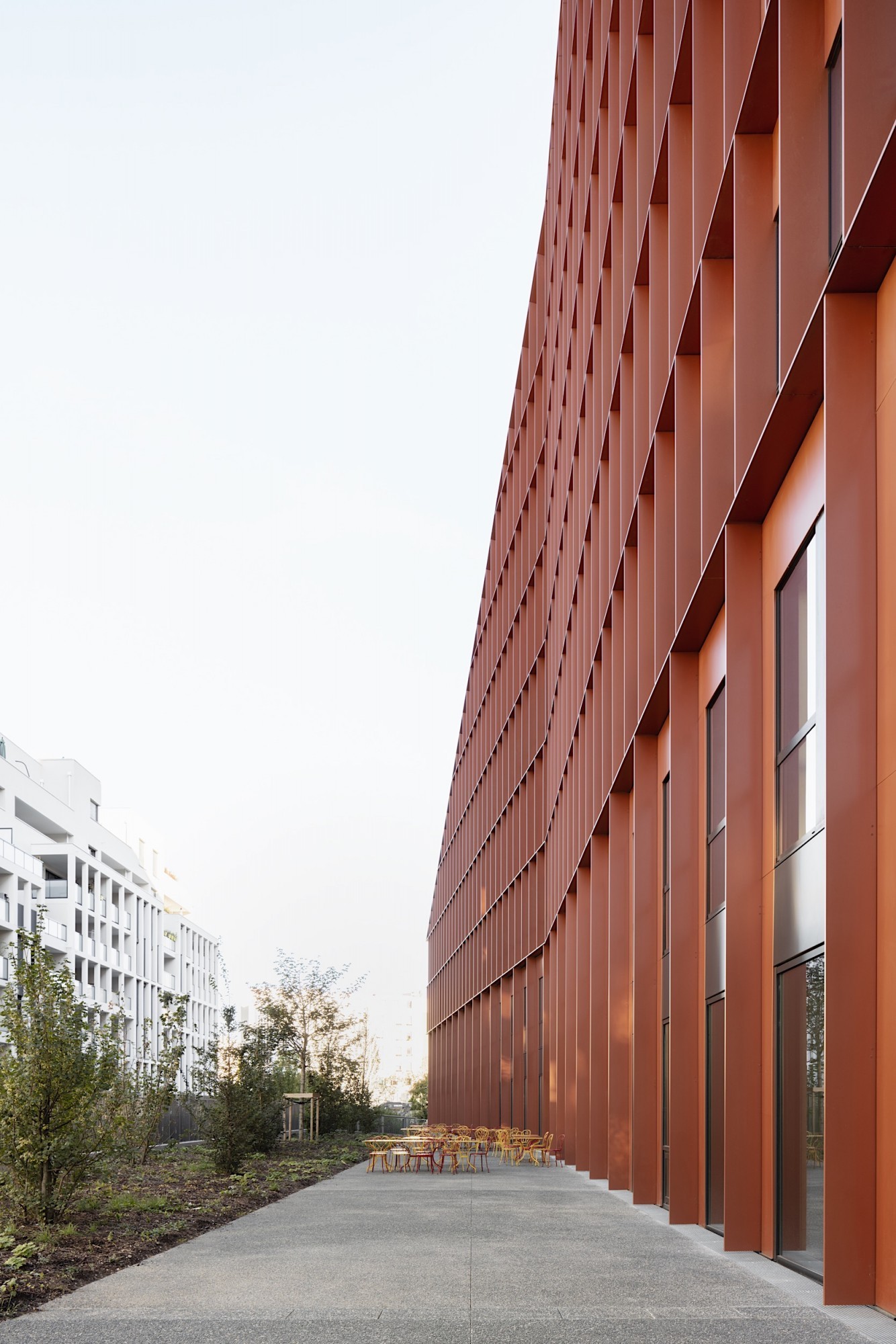Le nouveau siège d’Orange, extension-transformation du central téléphonique Lacassagne, valorise le bâtiment industriel et redonne une cohérence urbaine à l’îlot, en décomposant le projet en deux volumes « pliés » qui viennent envelopper l’existant. Notre parti-pris à l’échelle du quartier consiste à créer de grandes continuités et une « facilité des sols » pour réduire les symptômes associés à la multiplication des opérations et à la sur-diversification de natures et de textures. Les nouveaux édifices trouvent une harmonie dans la trame homogène des façades (écho au bâtiment existant) et les pans coupés qui sculptent les volumes en dégageant de larges terrasses végétalisées pour les niveaux de bureaux. Le principe de toiture rampante a le double avantage de cadrer l’existant pour le valoriser, et de dégager des vues vers et depuis les logements situés à proximité. L’extension sud sculpte le bâtiment industriel du central technique par ses lignes brisées, le révélant dans sa dimension patrimoniale. La façade en aluminium laqué rappelle la teinte des briques du central, visibles derrière l'exosquelette en béton.