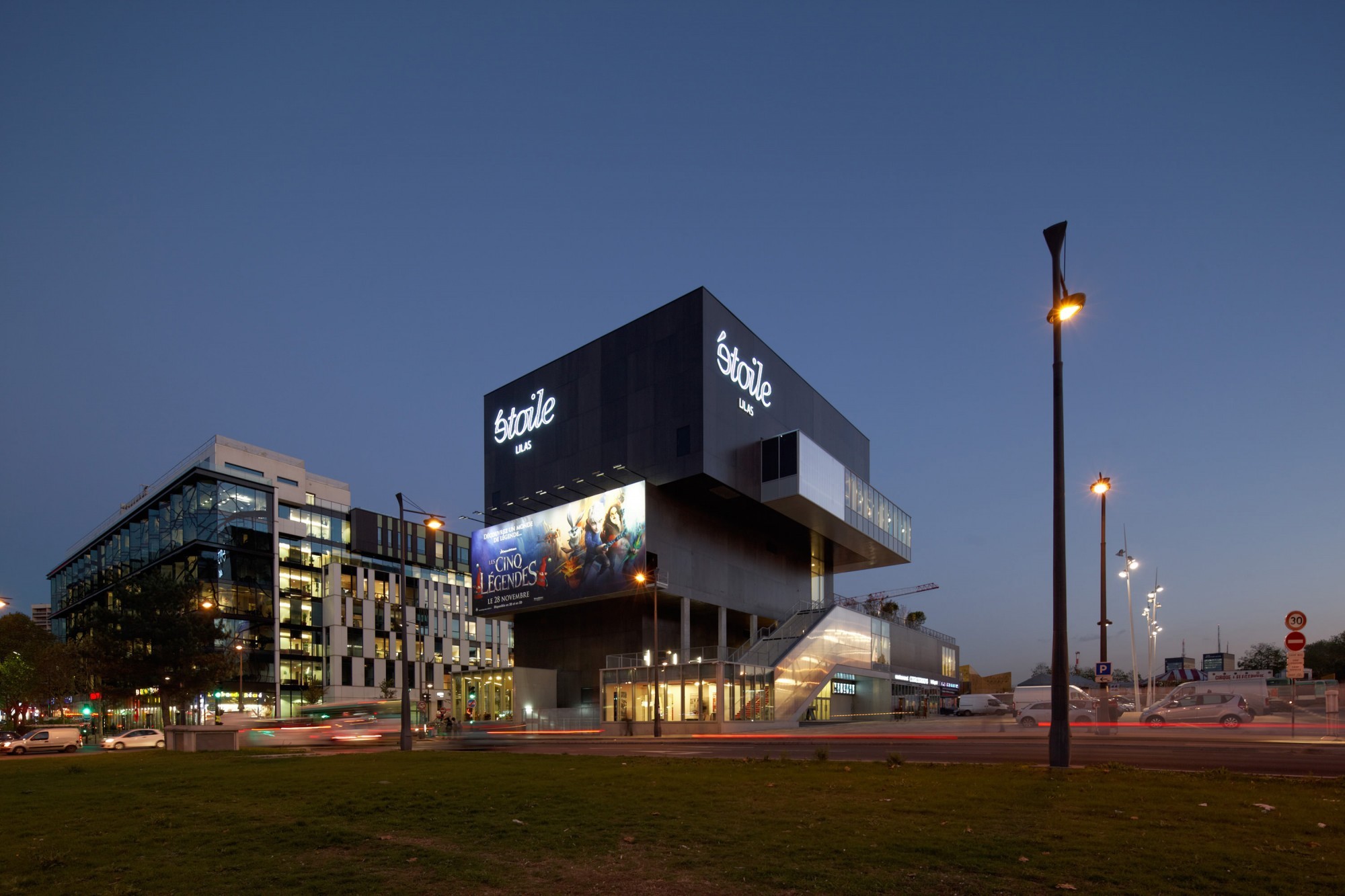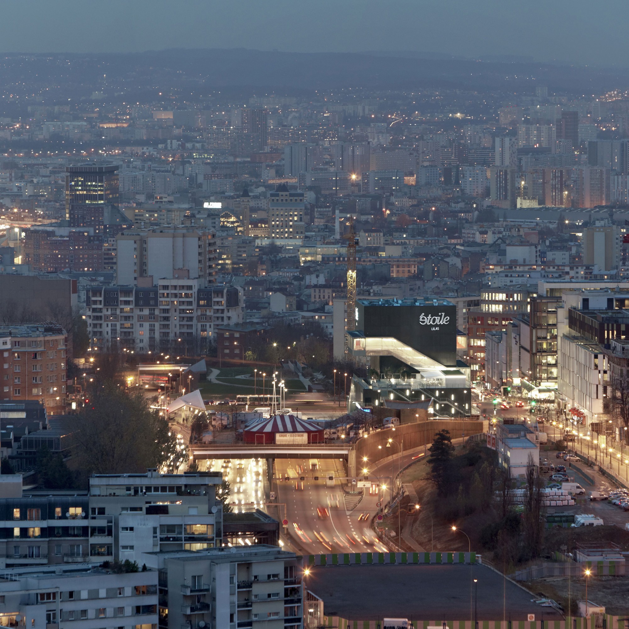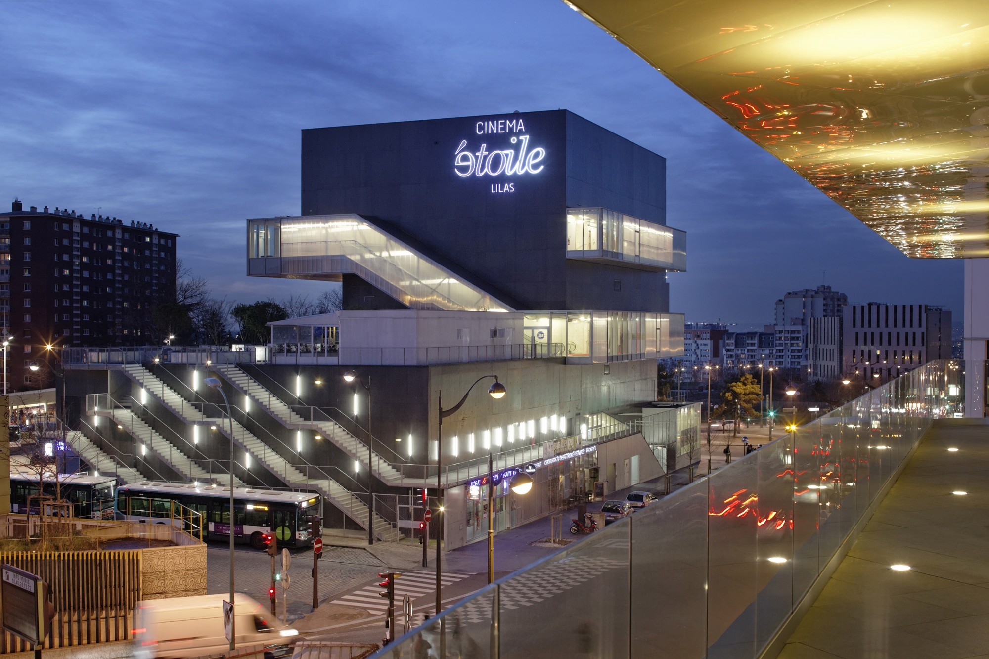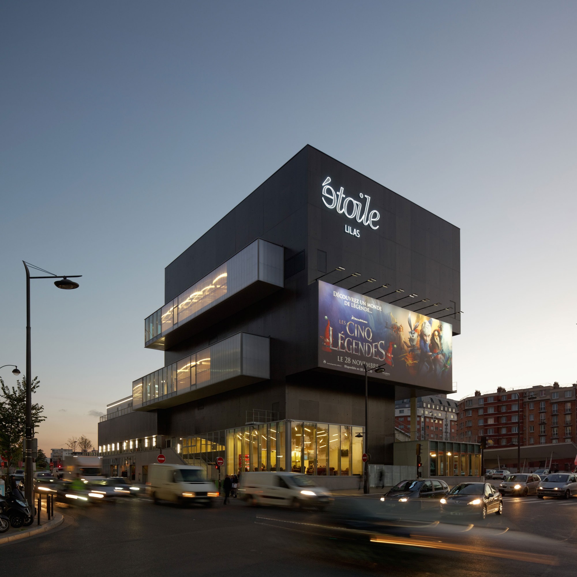 L’Étoile Lilas est conçu comme un cinéma de ville (par opposition au multiplexe de centre commercial en périphérie) : vertical, en dialogue avec son environnement. Nous avons choisi de scinder le bâtiment en deux volumes (cinéma et commerces) pour rendre l’espace public du parvis indispensable au passage de l’un à l’autre : au nord, un volume haut et compact dans la continuité des gabarits élevés de l’avenue de la Porte des Lilas ; au sud, un volume plus bas qui dégage la perspective et qui s’articule avec les hauteurs plus faibles du Cirque Électrique.