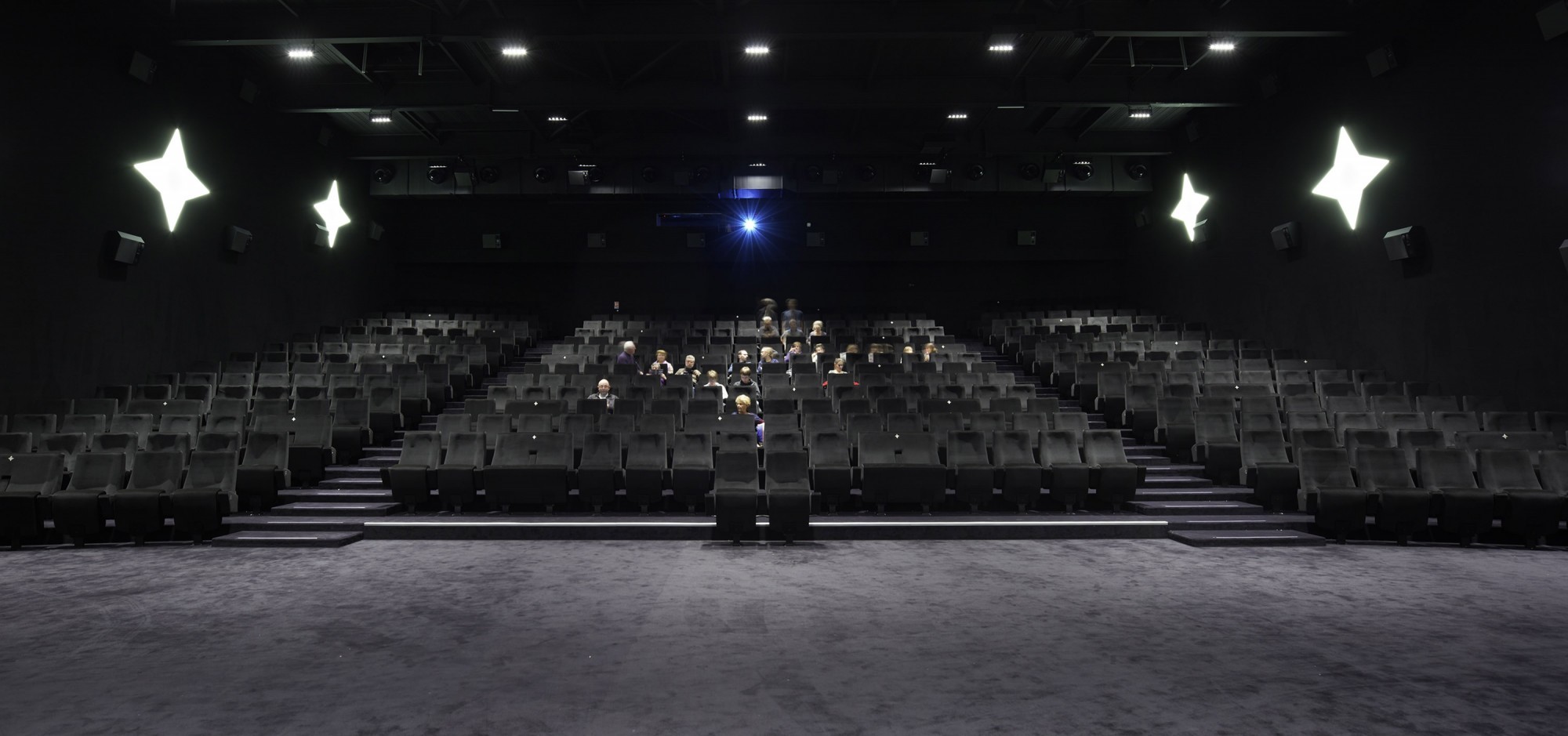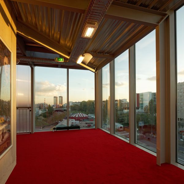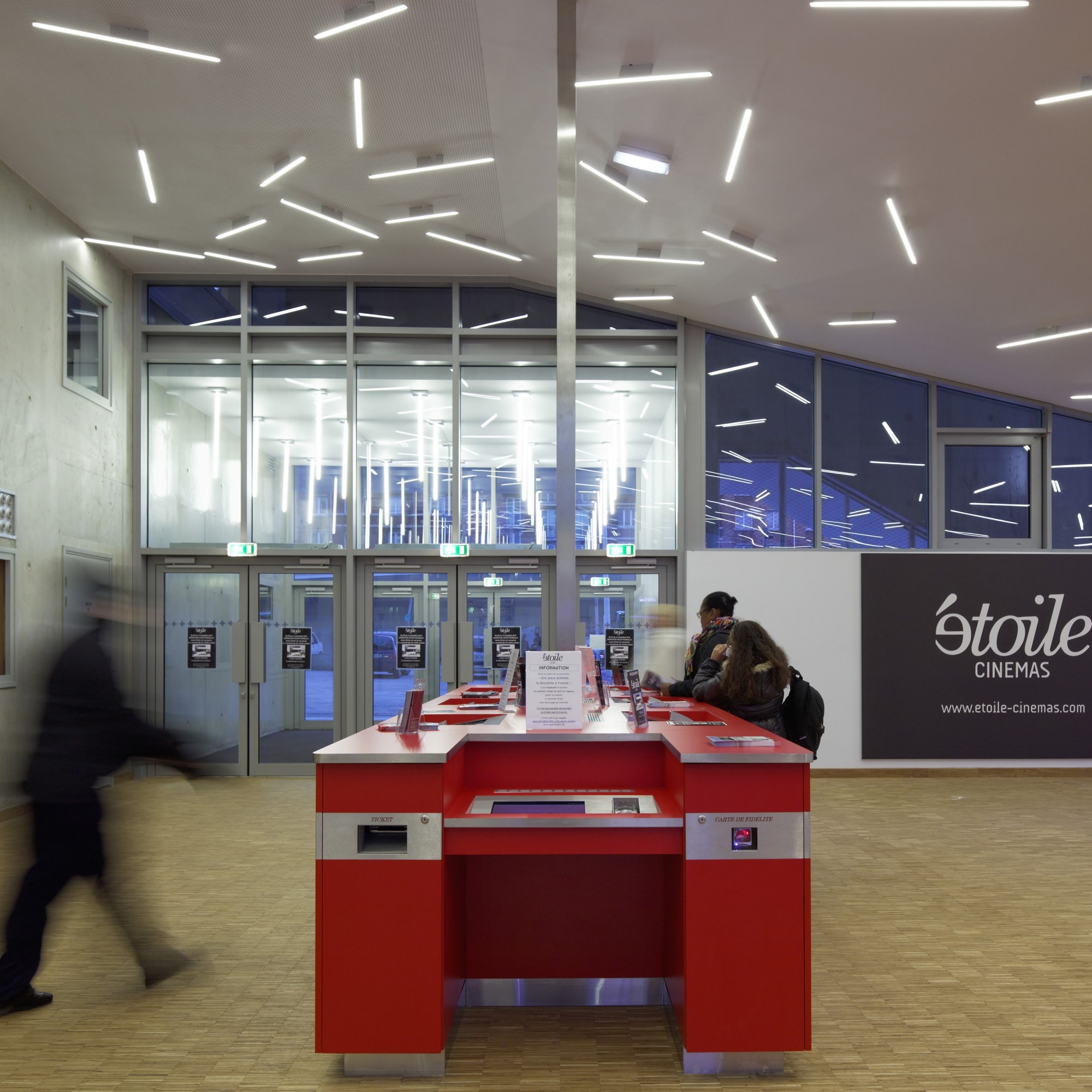 Le hall d’entrée prolonge le parvis sous le volume des salles. Les trois salles de la superstructure sont suspendues au-dessus de cet espace piranésien, empilées en ordre croissant de capacité (pyramide inversée) pour libérer un espace décroissant dédié aux circulations. Quatre autres salles sont enfouies en infrastructure afin de libérer un maximum de surface de plein pied avec le parvis pour l’accueil et les commerces. La multiplication règlementaire des dégagements et circulations est exacerbée pour produire une multitude de scénarios de parcours d’accès et de sortie, chacun décomposé en séquences panoramiques qui cadrent autant de vues proches ou lointaines sur la ville.