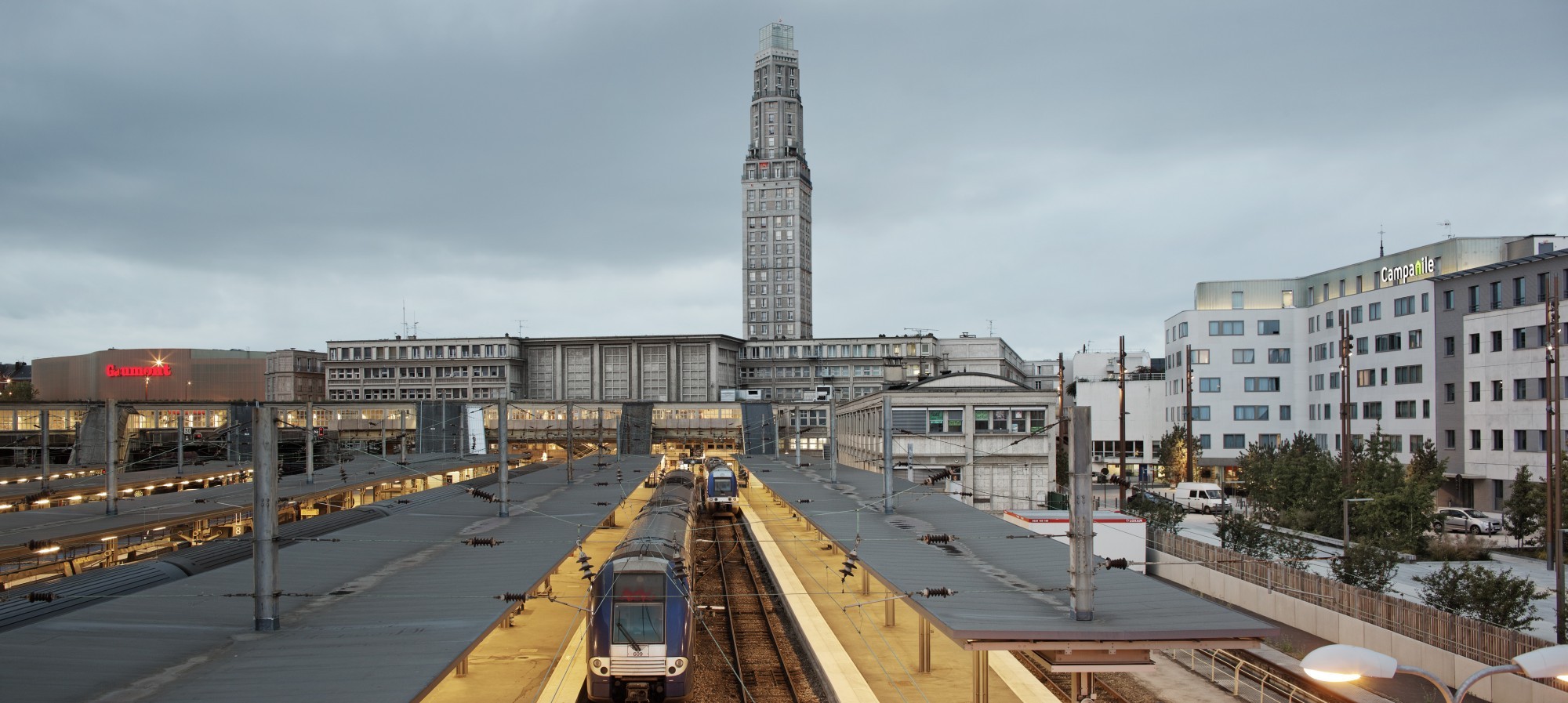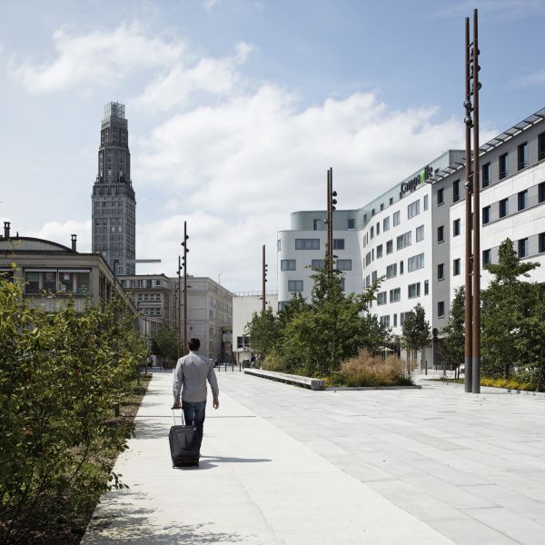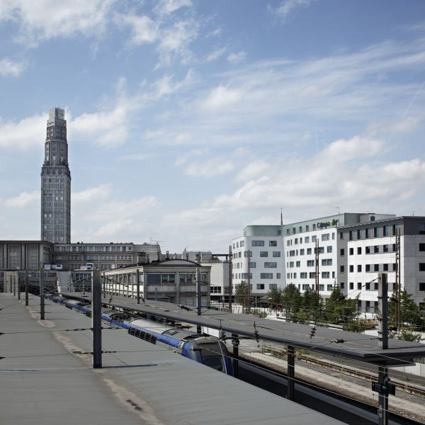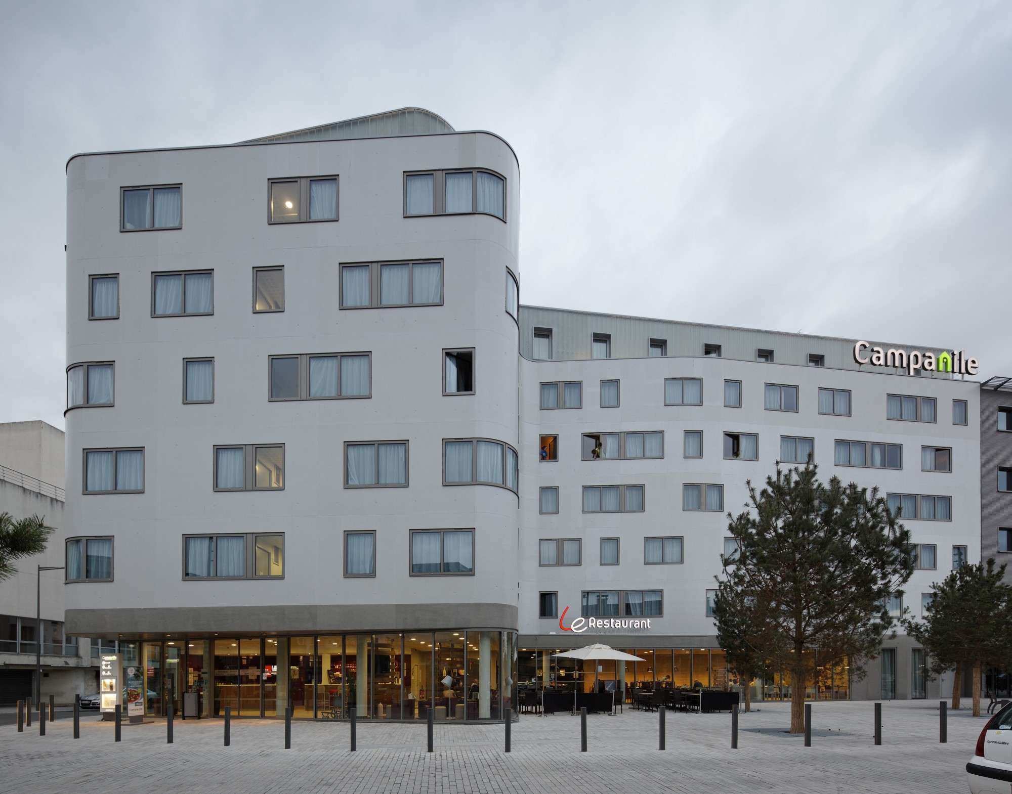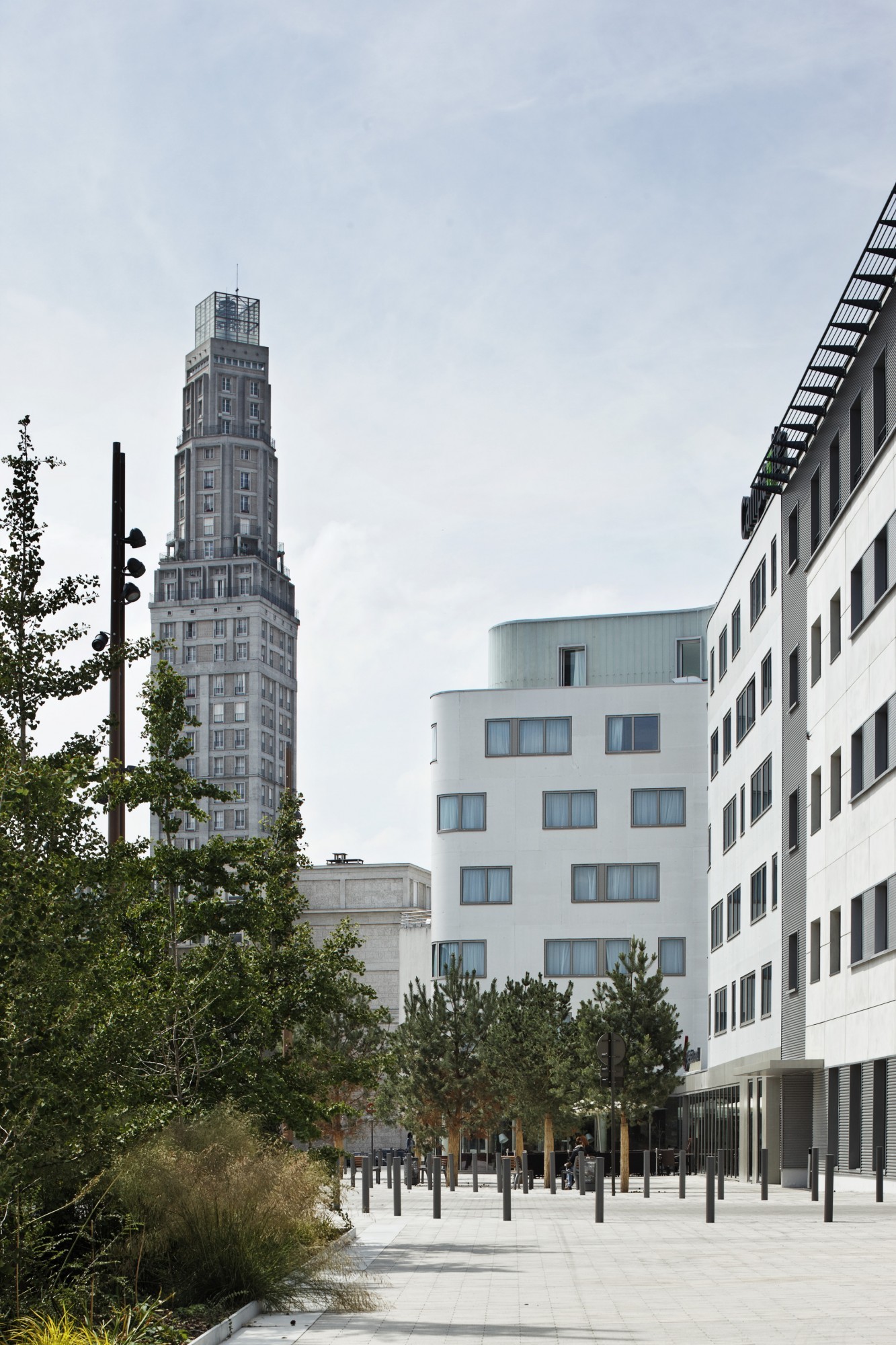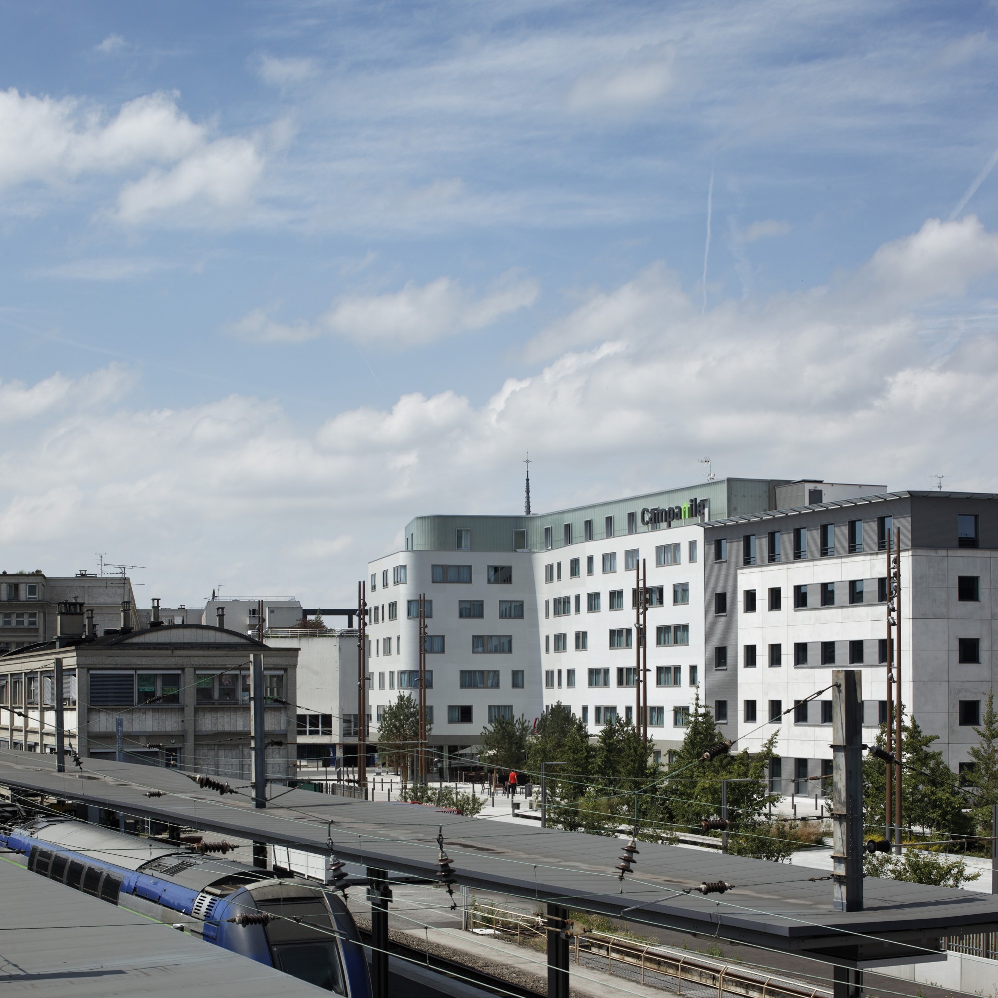 L’hôtel est par sa fonction et son architecture, le premier repère des voyageurs quittant la « Gare du Nord » par le sud. Le rez-de-chaussée, largement ouvert sur l’espace public, se veut le prolongement du parvis. Le corps principal érigé à R+5 prend la forme d’un grand voile de béton courbé et cintré sur les principaux angles afin d’adoucir la volumétrie et de faire écho aux courbes tendues des voies ferrées qui longent la place. Le béton blanc rend hommage à l’œuvre d’Auguste Perret : la gare, la place Alphonse Fiquet et la tour. Un dernier niveau d’attique traité en verre profilé et rétroéclairé souligne les courbes de la façade et renforce la présence du bâtiment la nuit, en référence aux enseignes lumineuses caractéristiques des quartiers de gares. La composition organique des ouvertures amplifie quant à elle la dynamique de la façade malgré la stricte régularité de sa trame structurelle et fonctionnelle.