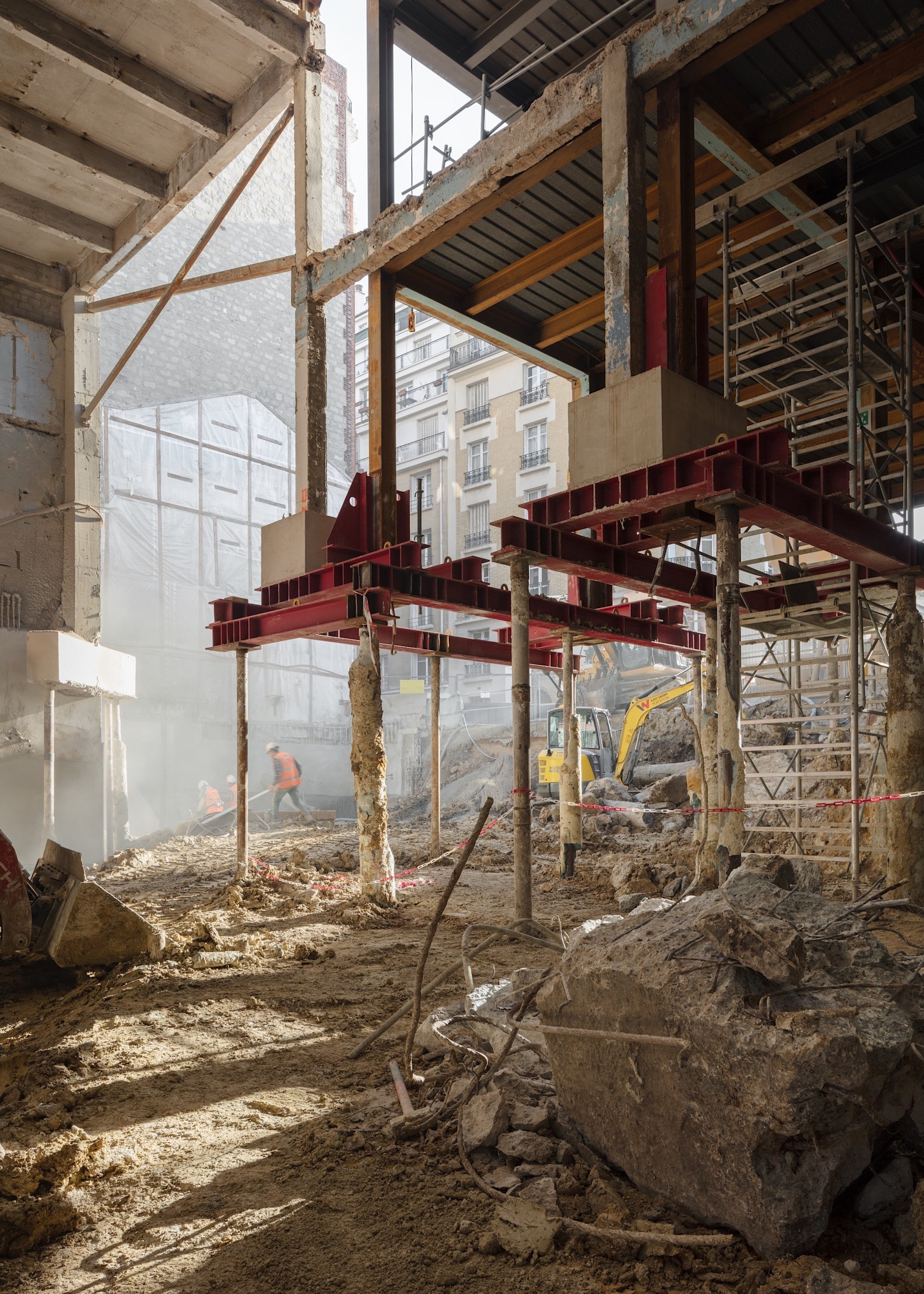La création d’un niveau entier à rez-de-jardin en creusant le sous-sol de l’actuel entrepôt permet de limiter la compacité du projet et de créer une surélévation fine et élégante sur rue. Reportage photo de l'existant à transformer ici.