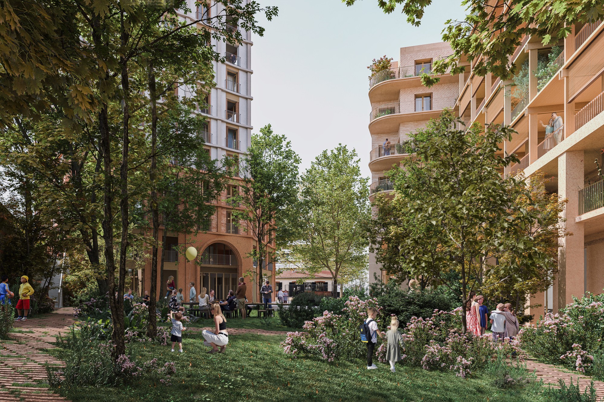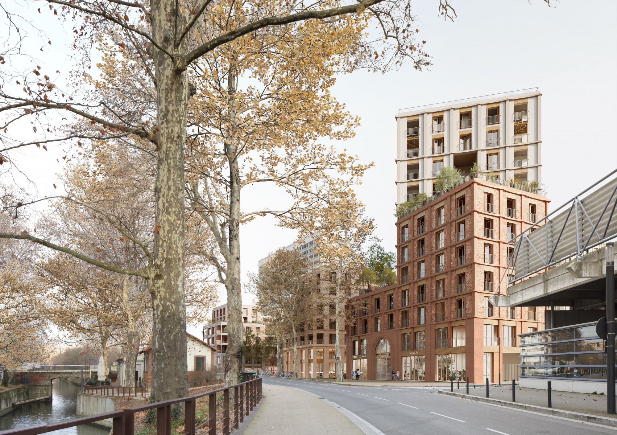 Les façades et volumes du nouvel îlot empruntent aux éléments patrimoniaux qui l’entourent : architecture toulousaine, esprit de faubourg, bords du Canal du Midi. Sur l'Avenue de Lyon, le front bâti régulier reprend la trame des faubourgs et forme un socle surplombé de deux émergences dont le facettage s’adresse aux différentes infrastructures en présence. La connexion urbaine s’exerce aussi par l’implantation d’un archipel de programmes thématiques autour de la solidarité et de la mixité entre acteurs locaux, habitants, populations précaires et hôtes ponctuels.