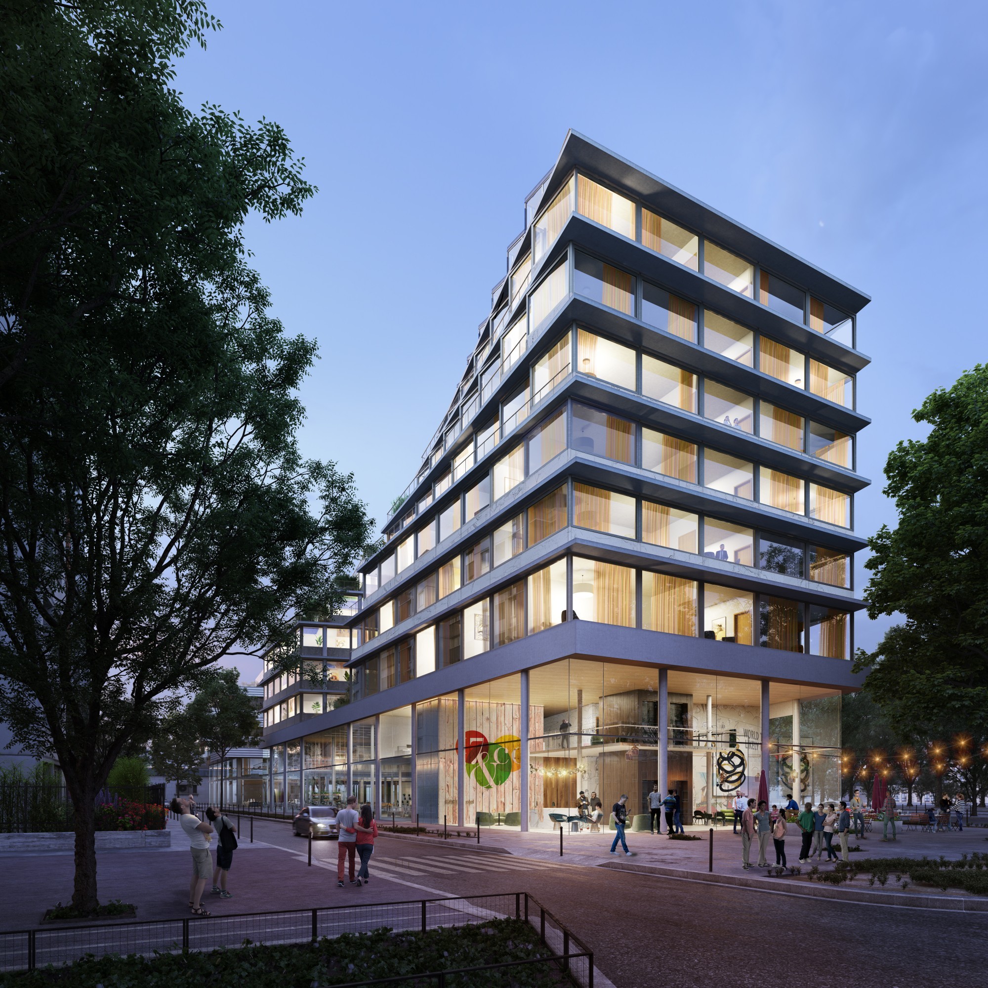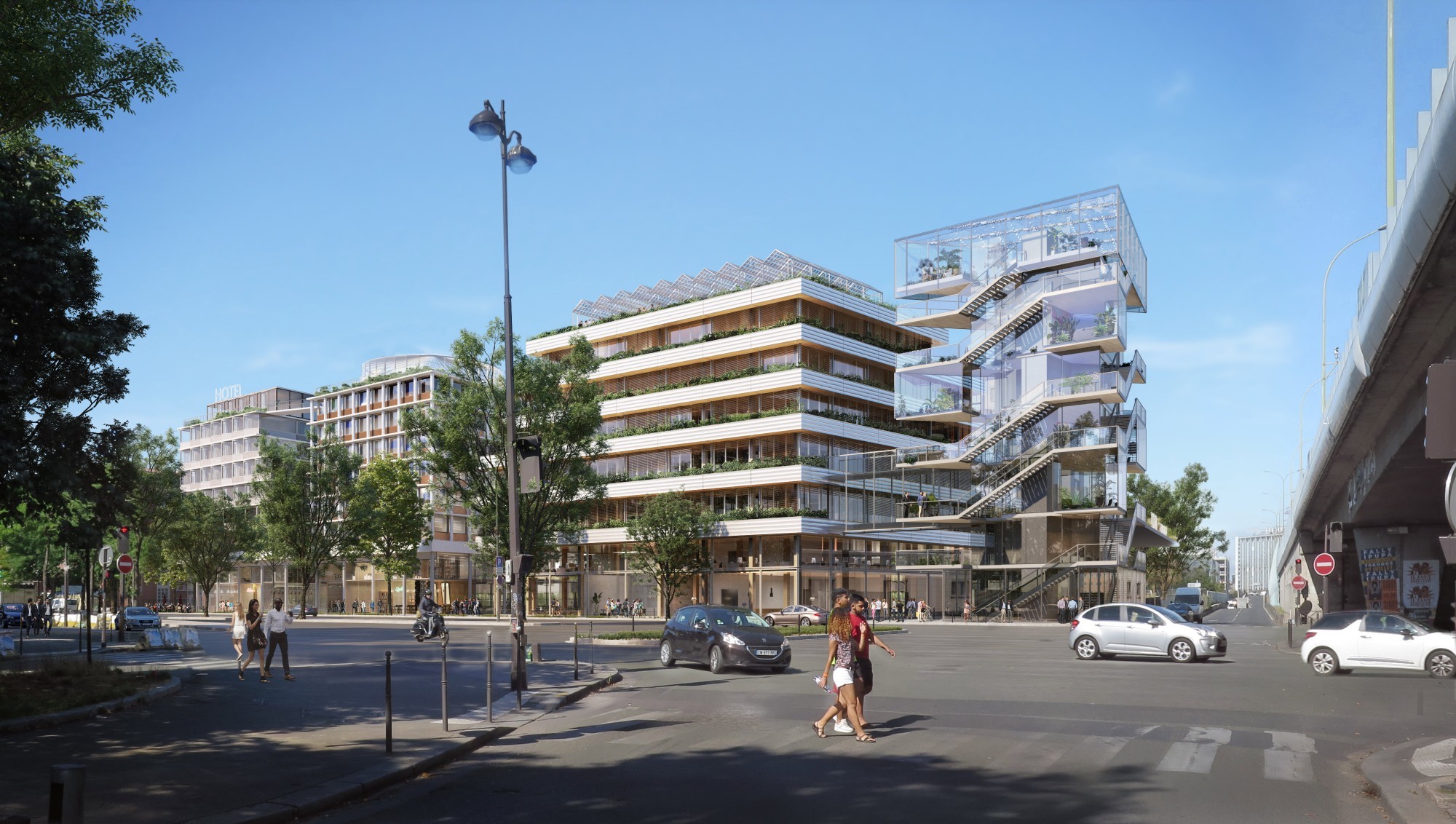 Etiré entre le boulevard des Maréchaux et la Porte de Saint-Ouen, le projet est bâti sur un parking existant de 500 places (conservées). Il intègre un pôle de mobilité multi-service basé sur une stratégie de rupture de charge (conciergerie, mise à disposition de vélos, voitures partagées, stationnement mutualisé). Par sa programmation hybride d'hôtellerie innovante, bureaux, ateliers de fabrication et loisirs, 17&CO redensifie l’avenue de Saint-Ouen sous forme d'un pôle de destination en lien avec les Puces. Recréer les alignements nous permet de structurer le site et d’adresser les rez-de-chaussée pour activer l'avenue. La forme urbaine est pensée en rapport avec la barre de logements pour la valoriser et la désenclaver. L'îlot est rendu poreux par des traversées, des ouvertures et des espaces publics ou semi-publics à rez-de-chaussée comme dans la hauteur. En termes d'espaces extérieurs, la géométrie trapézoïdale de la parcelle permet aussi d’aménager de grandes terrasses en façade ouest. Pour créer une attraction visible de loin et profiter des vues métropolitaines offertes par le site, les toitures sont aménagées avec un sky bar, une salle de sport et une serre événementielle. En proue sur le Périphérique enfin, la tour de karaoké ponctue la séquence publicitaire de l'autoroute urbaine par un bâtiment signal réversible loisirs/bureaux.