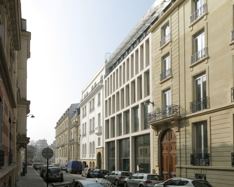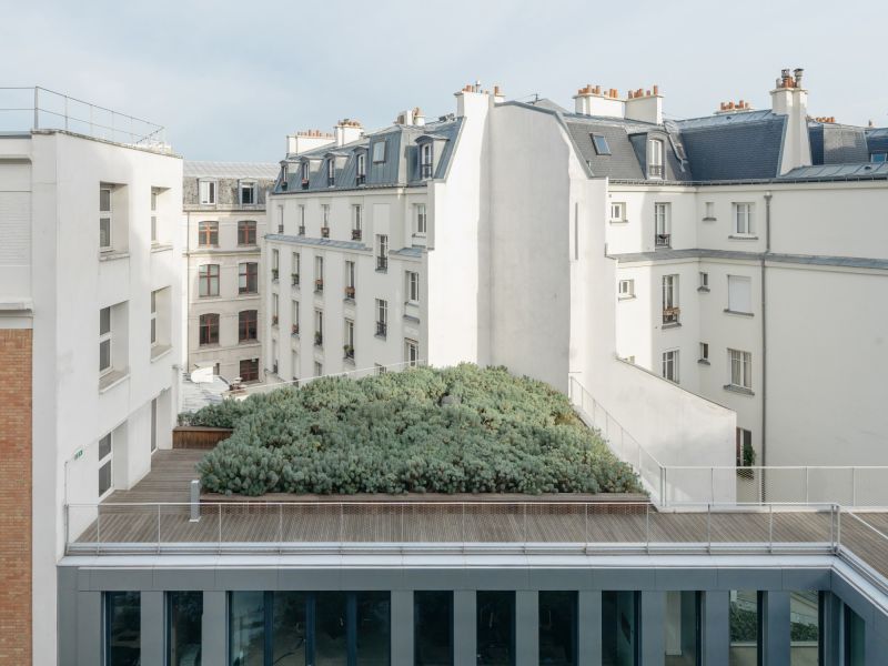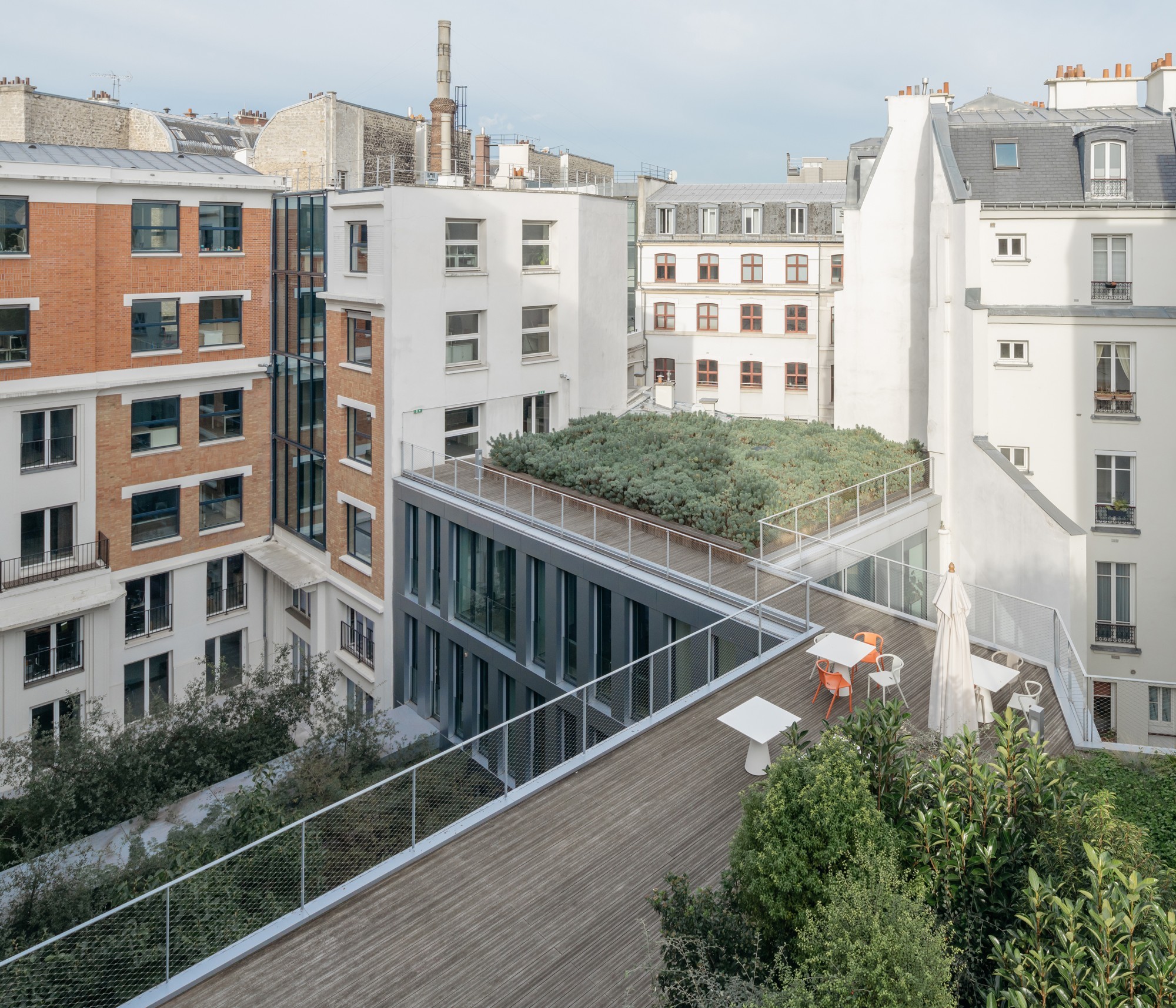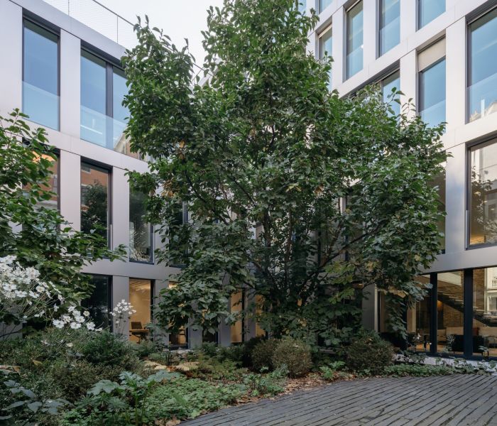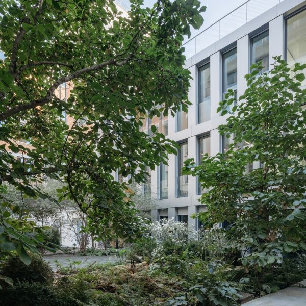 Cette restructuration donne un supplément d’âme au programme de bureaux. Le projet respecte l’histoire des immeubles existants et leur redonne les qualités urbaines souhaitées à l’origine de la construction, en les rendant plus fonctionnels, avec des circulations adaptées aux usages d’aujourd’hui et de demain. Nous choisissons de conserver l’hôtel particulier au n°5, de le réhabiliter et de le réaménager. Le n°7, qui présente peu d’intérêt patrimonial et dont les altimétries de plancher sont incompatibles avec une réunion fonctionnelle avec le n°9, est en partie démoli. Le bâtiment sur rue du n°9 est conservé. Ses ailes sur cour, mal connectées, sont démolies afin de libérer de l’espace en cœur d’îlot. Ces démolitions nous permettent de recréer une articulation des volumes sur la rue. La création d’une grande cour rectangulaire à cheval sur les trois parcelles offre une meilleure respiration vers le nord tout en marquant l’unité de l’ensemble autour d’un jardin. Enfin, les nouveaux noyaux de circulation sont conçus et placés de façon à libérer les espaces de travail, à optimiser les zones dédiées, à rationaliser les flux et à permettre une connexion entre les trois immeubles à différents niveaux.
