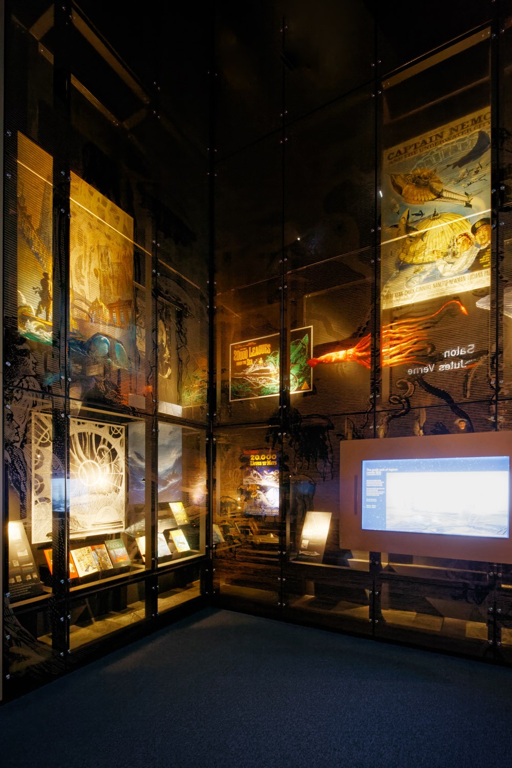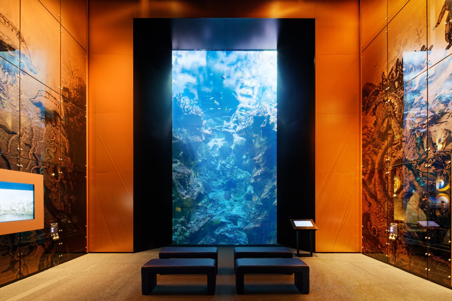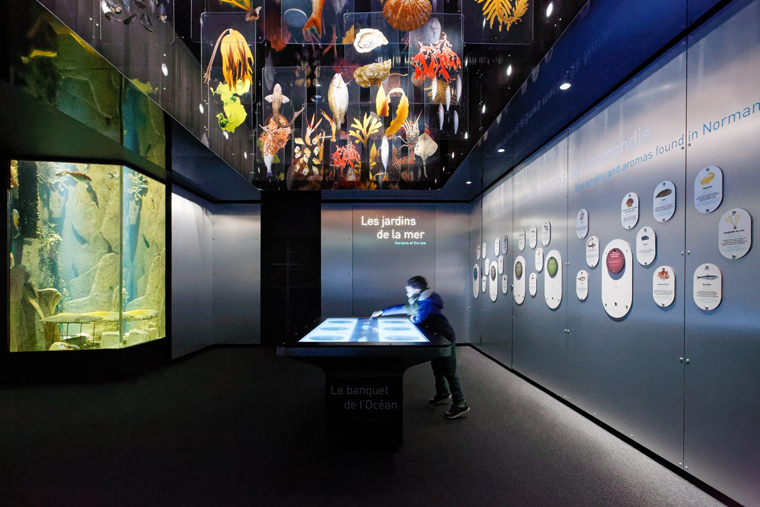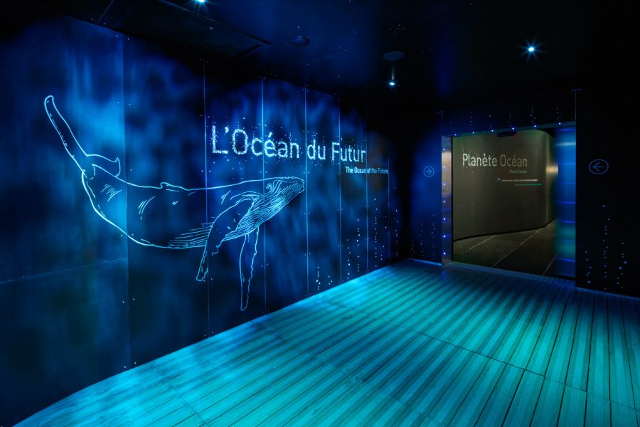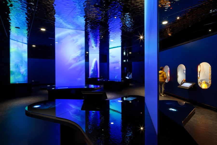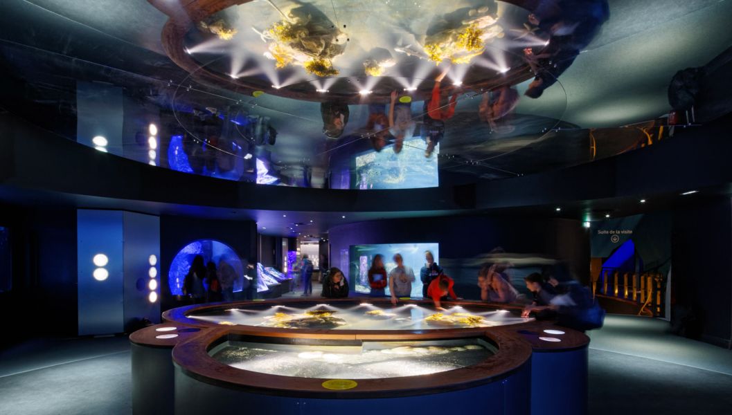 Le Pavillon des expositions permanentes de la Cité de la Mer est un bâtiment situé le long du célèbre sous-marin Le Redoutable. Réalisé en 2002 par les architectes Studio Milou, il s'agit d'un espace muséographique sur 3 niveaux, conçu pour accueillir 1 000 visiteurs. Pour mettre en valeur les aquariums, moderniser le parcours scénographique et offrir un meilleur cadre de travail aux équipes du musée, nous transformons intégralement les espaces intérieurs. En support aux propositions scénographiques de notre partenaire Pascal Payeur, nous enrichissons la palette de matériaux, avec notamment des plaques d’inox bosselé qui renforcent l'effet d'immersion au cœur du concept de la visite. Quelques modifications architecturales sont aussi nécessaires sur le bâtiment existant : le parcours commence désormais à R+2 par la montée d’un grand escalator à la mesure du plus haut aquarium d’Europe, l’entrée est modifiée pour éviter les circulations en chicane et maîtriser davantage les ambiances lumineuses ; certains planchers sont démolis pour créer des vues en pied et du recul, comme dans le nouveau salon Jules Verne, en double hauteur face à l’aquarium.