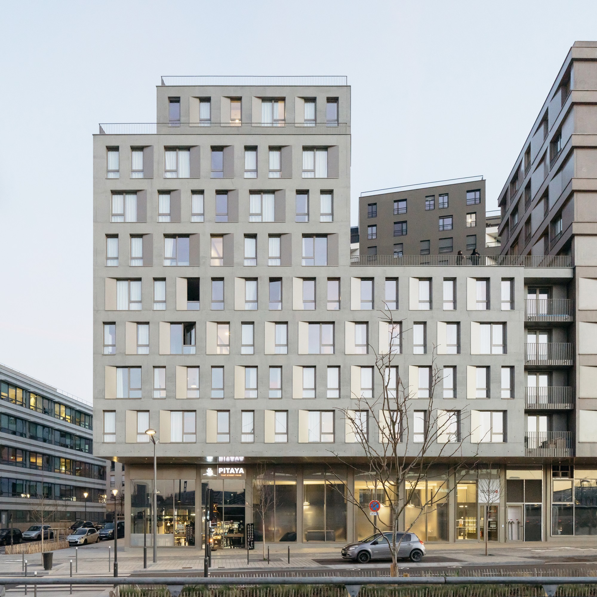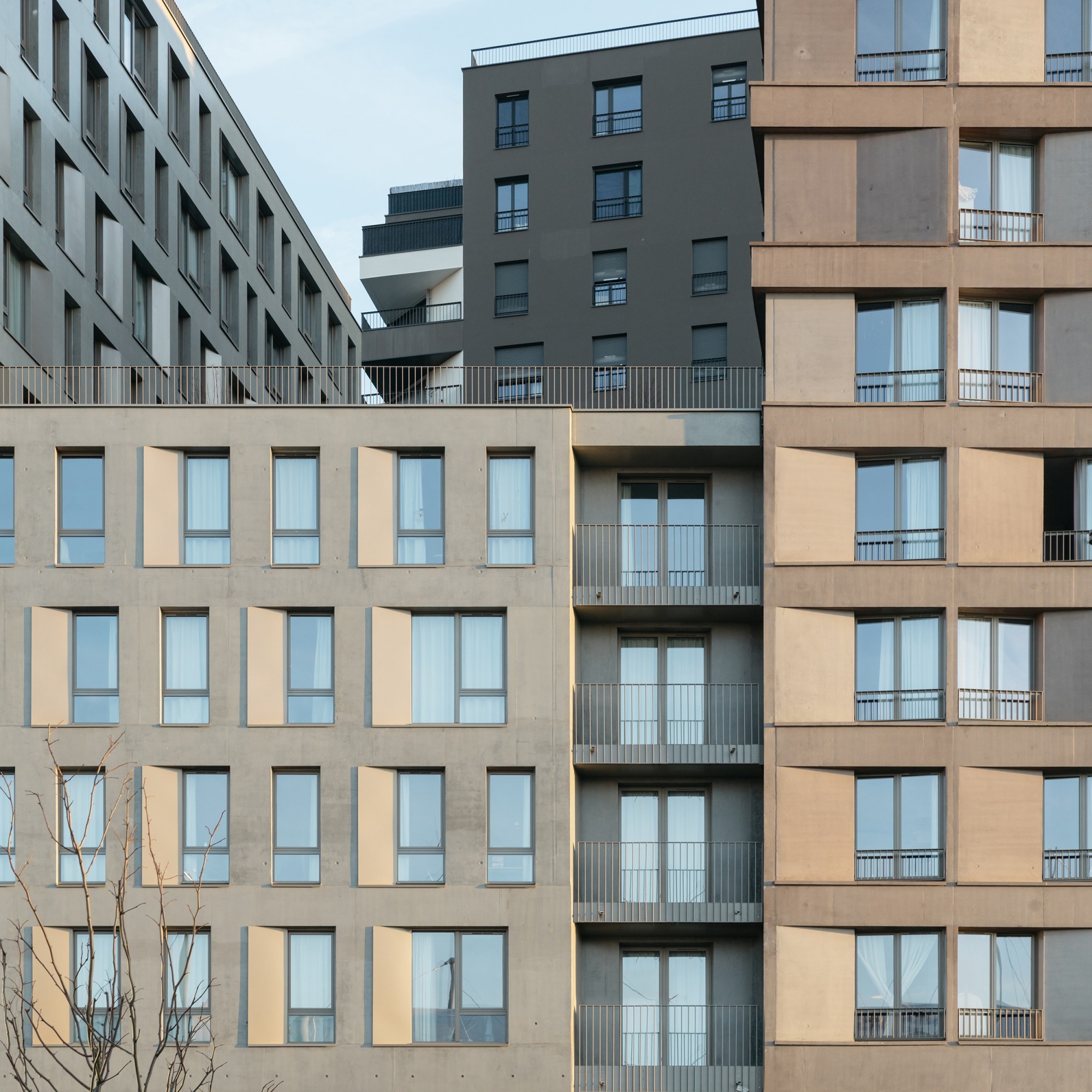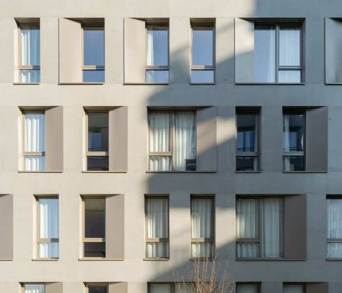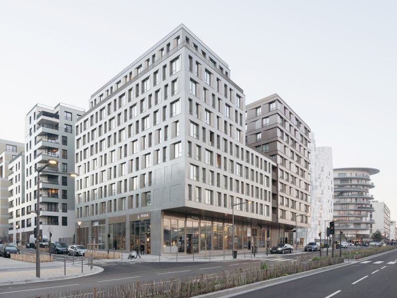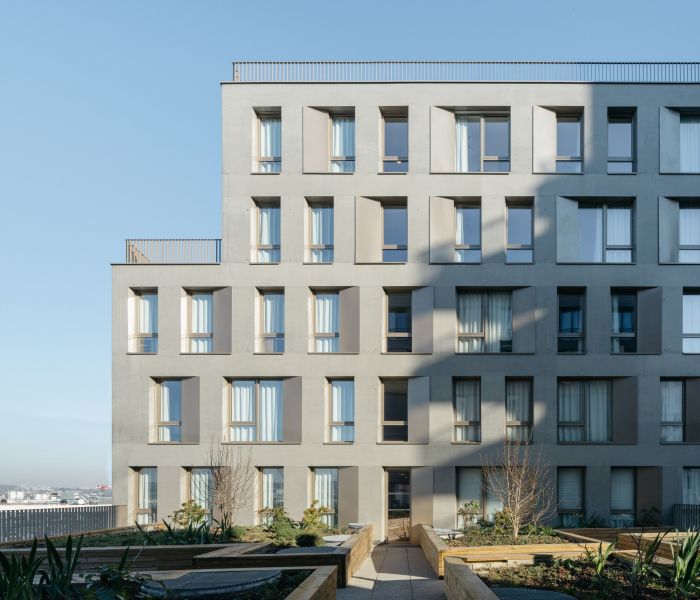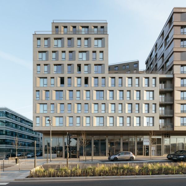 Les volumétries épannelées créent des espaces généreux : duplex, doubles hauteurs, terrasses et loggias habillées de bois. Tous les appartements ont vue sur une canopée de jardins au sol et en hauteur. Les deux résidences mutualisent leur fonctionnement, avec des circulations et services partagés à rez-de-chaussée (salle de petit déjeuner, cafétéria, laverie, salle de sport, logement du gardien) et en hauteur (grande terrasse commune au R+5). Les halls sont des espaces traversant, transparents et de grande hauteur qui expriment avec le concept paysager de perméabilité du cœur d’îlot, où se trouvent d’ailleurs les entrées des nombreux locaux vélos.