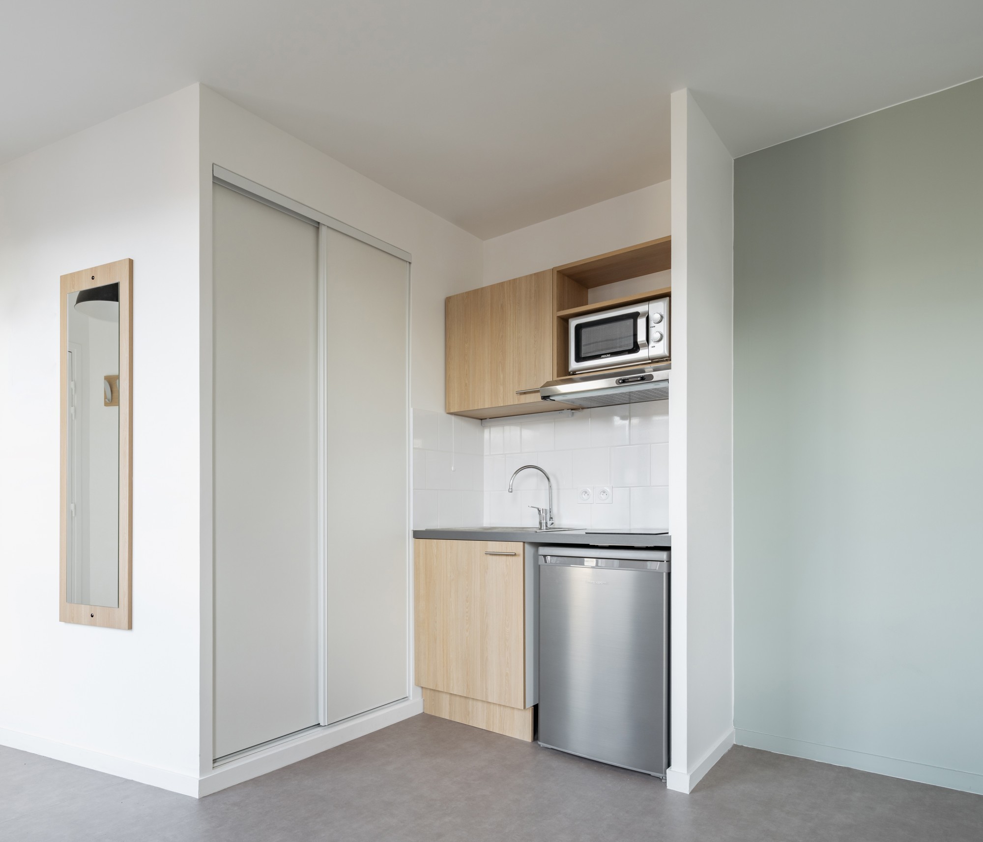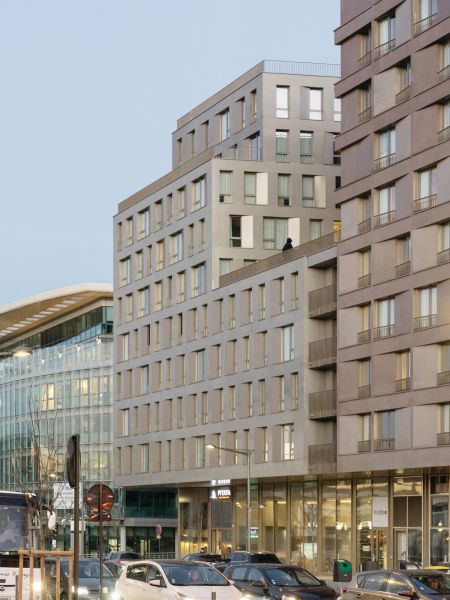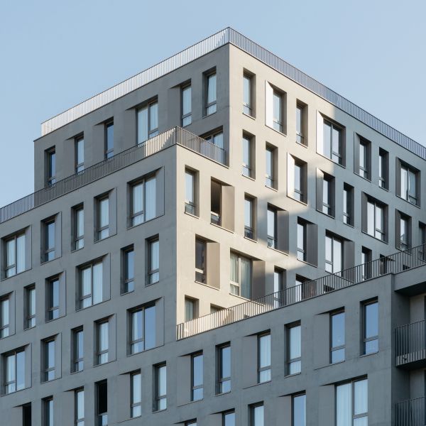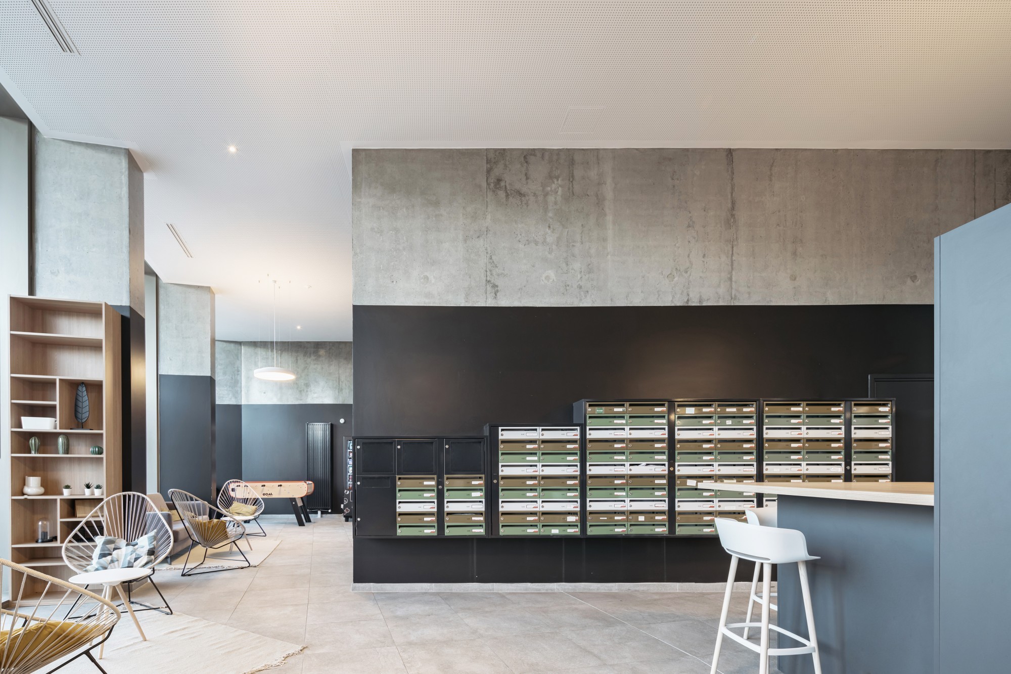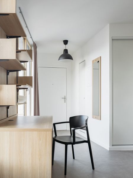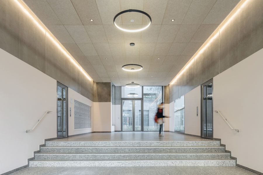 Les volumétries épannelées créent des espaces généreux : duplex, doubles hauteurs, terrasses et loggias habillées de bois. Tous les appartements ont vue sur une canopée de jardins au sol et en hauteur. Les deux résidences mutualisent leur fonctionnement, avec des circulations et services partagés à rez-de-chaussée (salle de petit déjeuner, cafétéria, laverie, salle de sport, logement du gardien) et en hauteur (grande terrasse commune au R+5). Les halls sont des espaces traversant, transparents et de grande hauteur qui expriment avec le concept paysager de perméabilité du cœur d’îlot, où se trouvent d’ailleurs les entrées des nombreux locaux vélos.