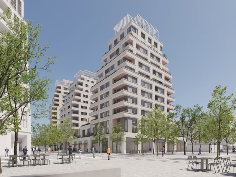 L'agence assure la coordination du macro-lot C de la ZAC Gratte-Ciel Centre-Ville, réinterprétation de l'emblématique quartier bâti par Môrice Leroux dans les années 1930. Le projet prolonge et densifie l'avenue Henri Barbusse dans la perspective de l'Hôtel de Ville, sous la direction des urbanistes ANMA. La co-conception s'est organisée autour d'ateliers menés pendant 15 mois suite à la concertation avec les riverains et futurs usagers. Notre bâtiment dit B2 est un immeuble mixte en R+13 de 32 logements en BRS (bail réel solidaire) développés au-dessus de deux niveaux de commerces. Sur la parcelle d'angle de 16x26 m, la volumétrie asymétrique induit une façade plus large sur la rue de Pressensé, que nous proposons de découper pour conserver une échelle domestique, appropriable dans le nouveau quartier. Un escalier extérieur occupe la faille, marquant l'entrée des logements en référence directe aux Gratte-ciel historiques de Leroux. Les plans d’étages sont cruciformes : l’escalier au nord, les ascenseurs et autres gaines au centre, afin de libérer les quatre angles et d'obtenir la quasi-totalité des logements bi-orientés. Les cuisines sont toujours éclairées naturellement et la plupart du temps connectées à l’espace extérieur privatif. Dès que possible les salles de bain sont également disposées en façade, dans un souci constant de ventilation saine, principe cher à la conception hygiéniste du début du XXe siècle.