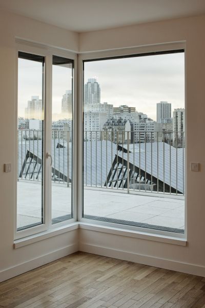 Un noyau unique de circulation vertical composé d’un escalier encloisonné et d’un ascenseur dessert le sous-sol et les six niveaux supérieurs. Les quatre premiers abritent deux petits appartements mono orientés, un deux pièces d’angle et deux T3 traversants aux extrémités. Les 5e et 6e niveaux sont concentrés sur la rue Pajol en adossement sur le pignon du 29. Leurs retraits successifs dégagent de larges terrasses accessibles.