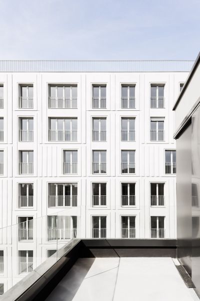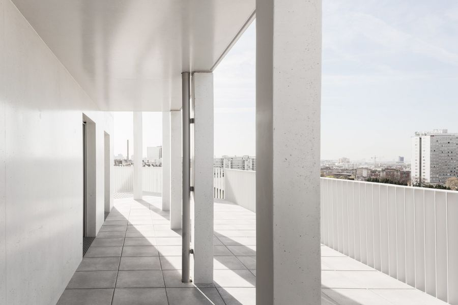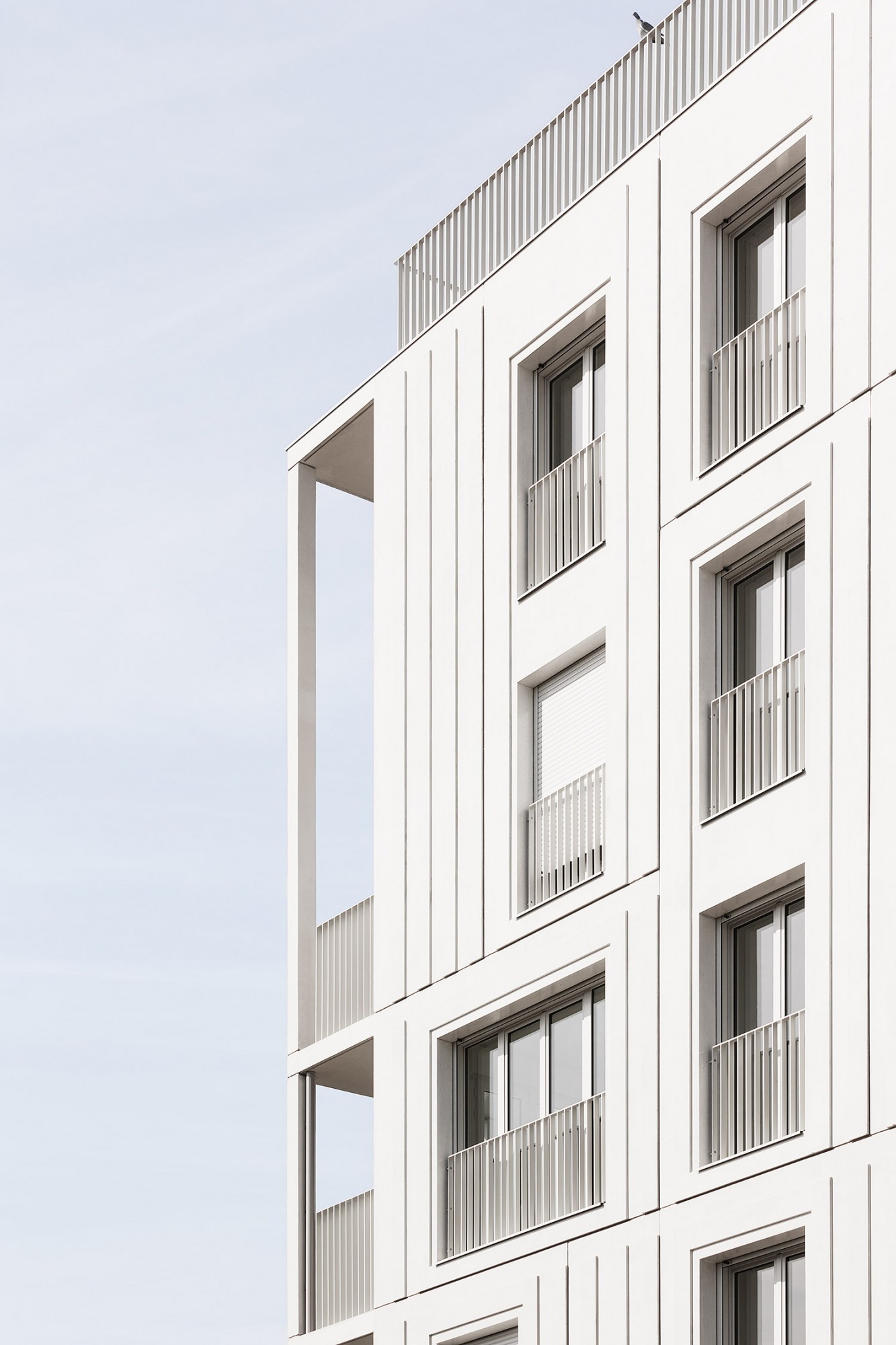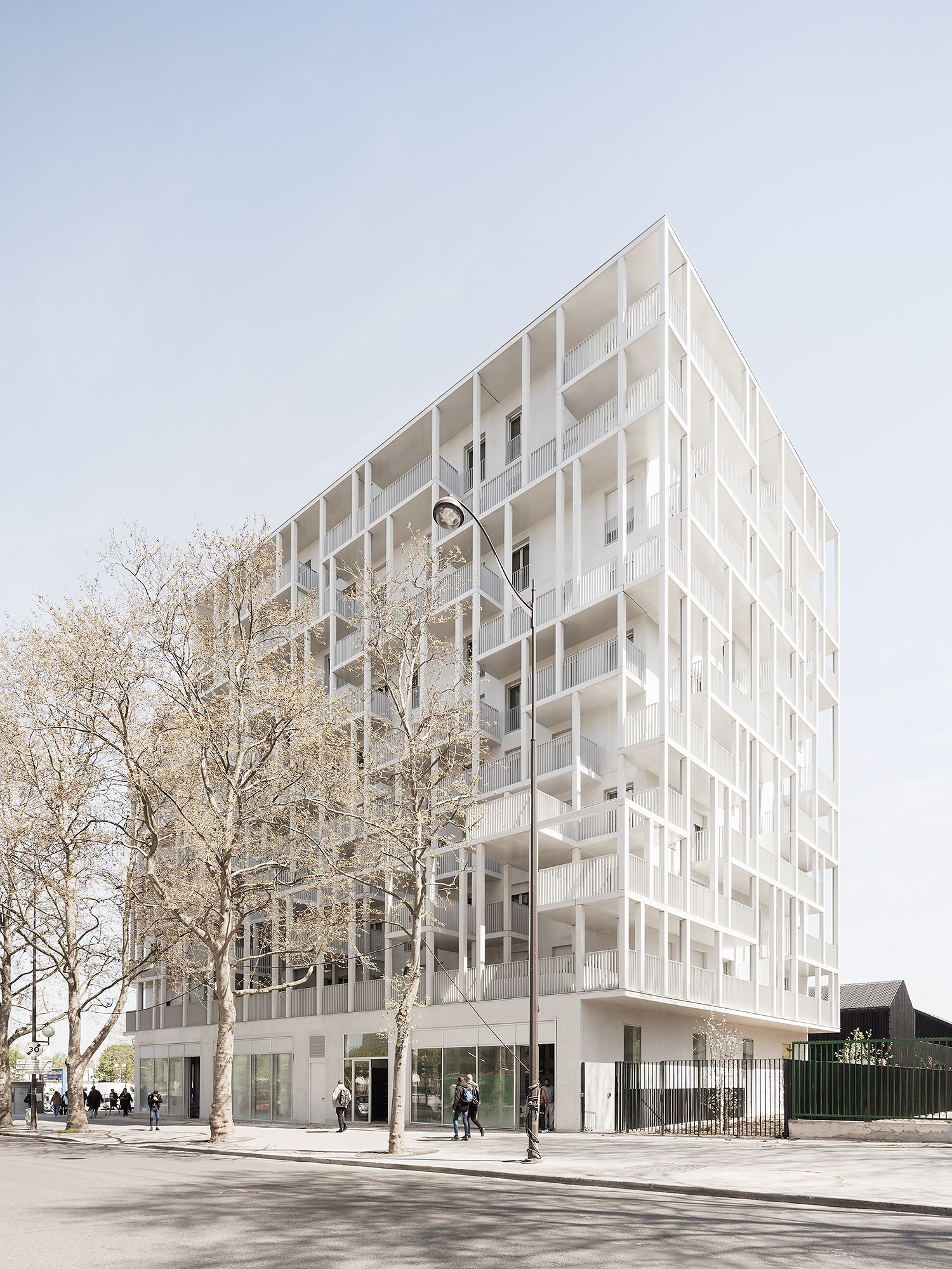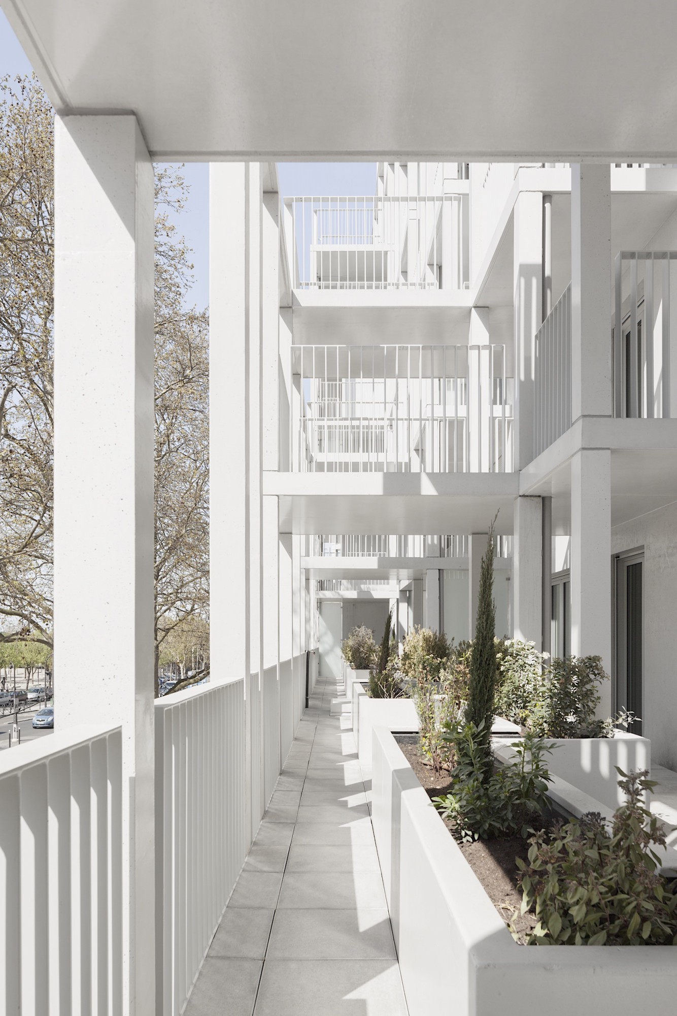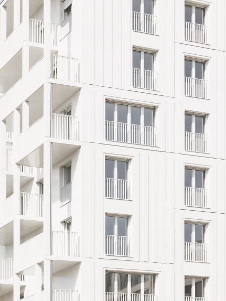 Le bâtiment très compact est étiré par un travail sur une seconde peau légère qui souligne sa verticalité. Selon les principes d’une esthétique façonnée par l’usage, cette résille de balcons, d’apparence aléatoire avec son jeu de simples et doubles hauteurs, est orchestrée sur la trame rationnelle des plans d’étages. Cette disposition en quinconce anime les façades, favorise l’ensoleillement des appartements et rationnalise les surfaces de balcon. Côté jardin, la matrice du béton met en relief une façade plane grâce à un jeu d’ombre et de lumière. Ses aspérités font écho au motif dessiné par la résille des façades sur rue.
