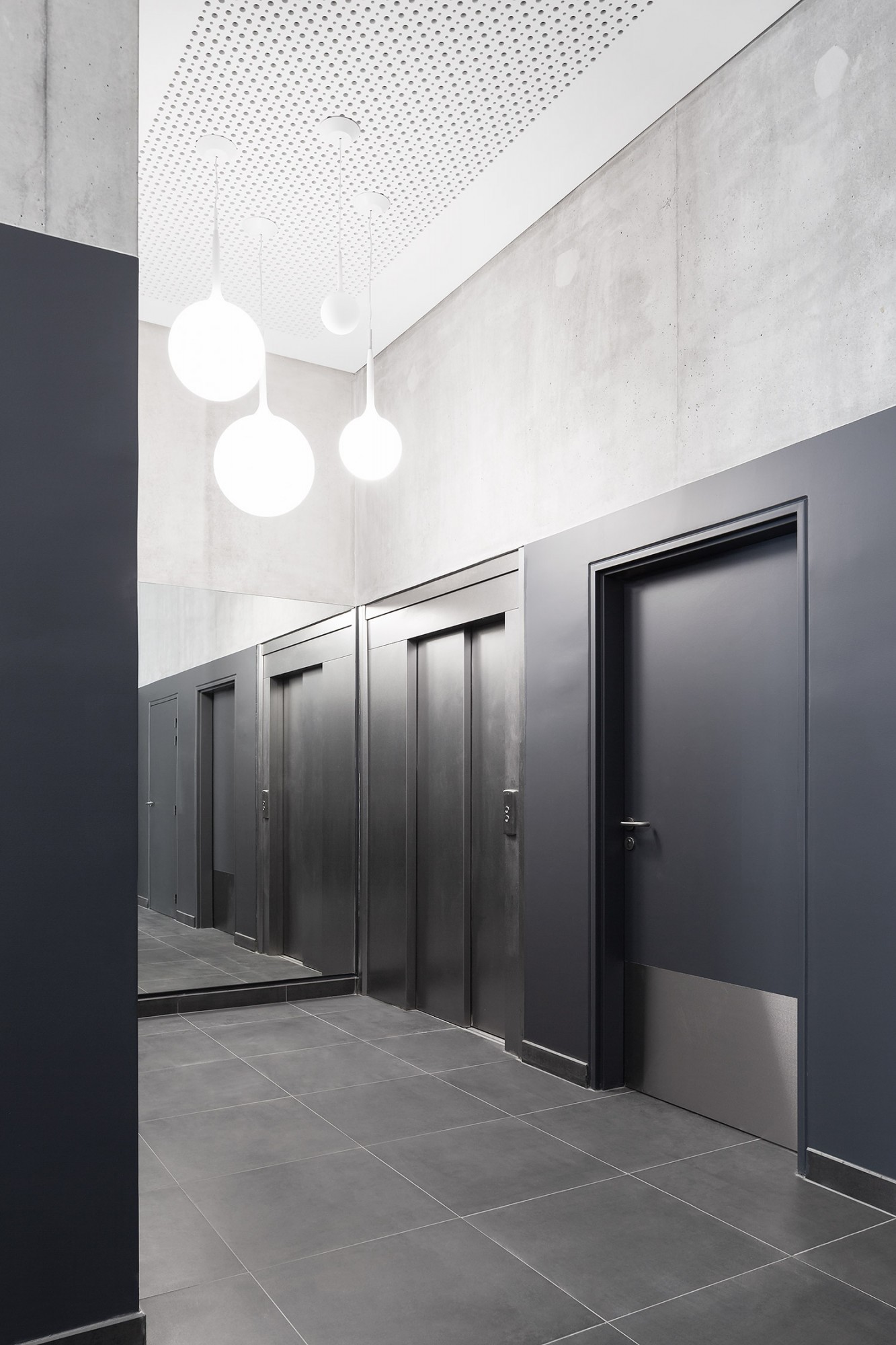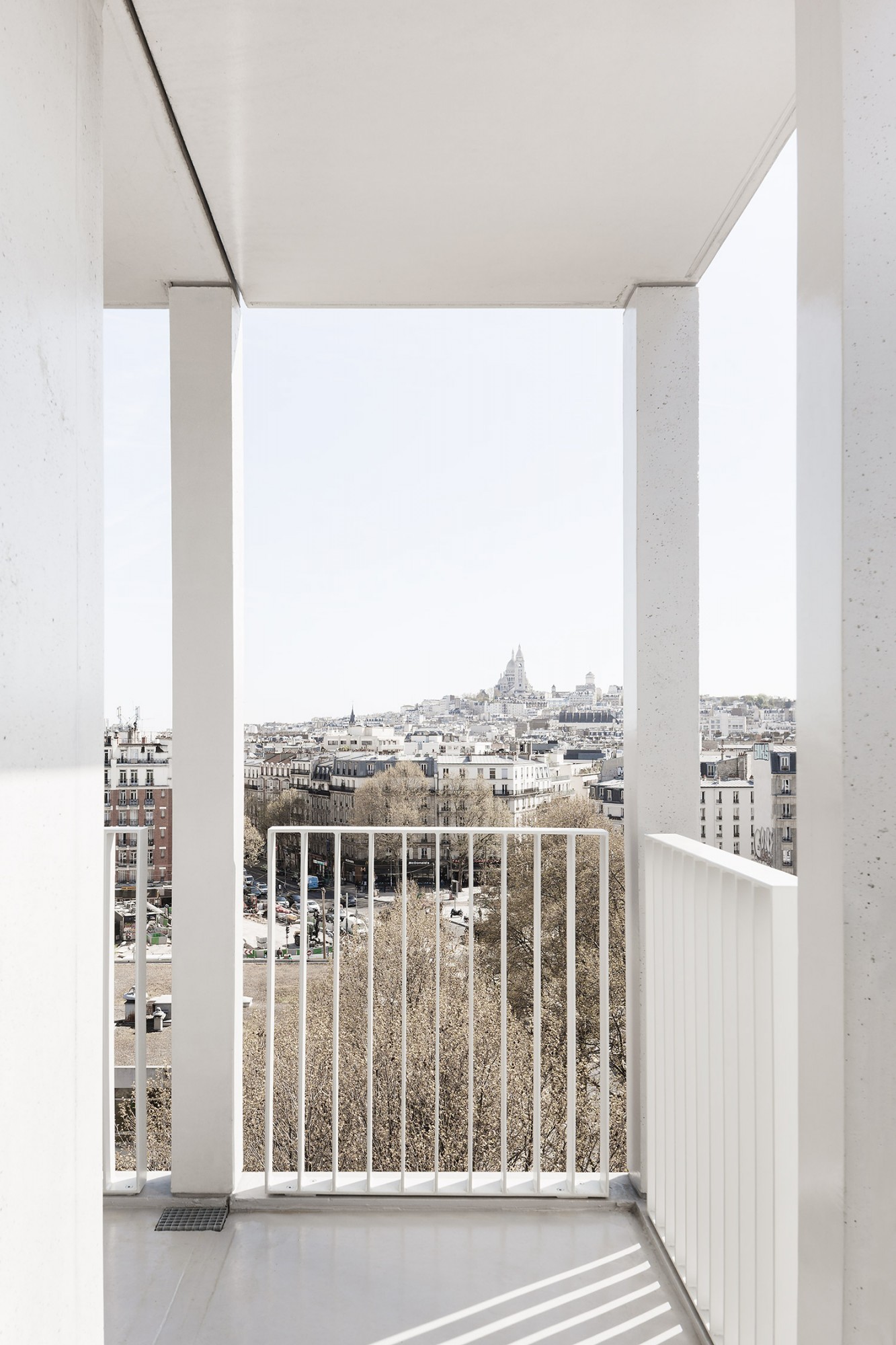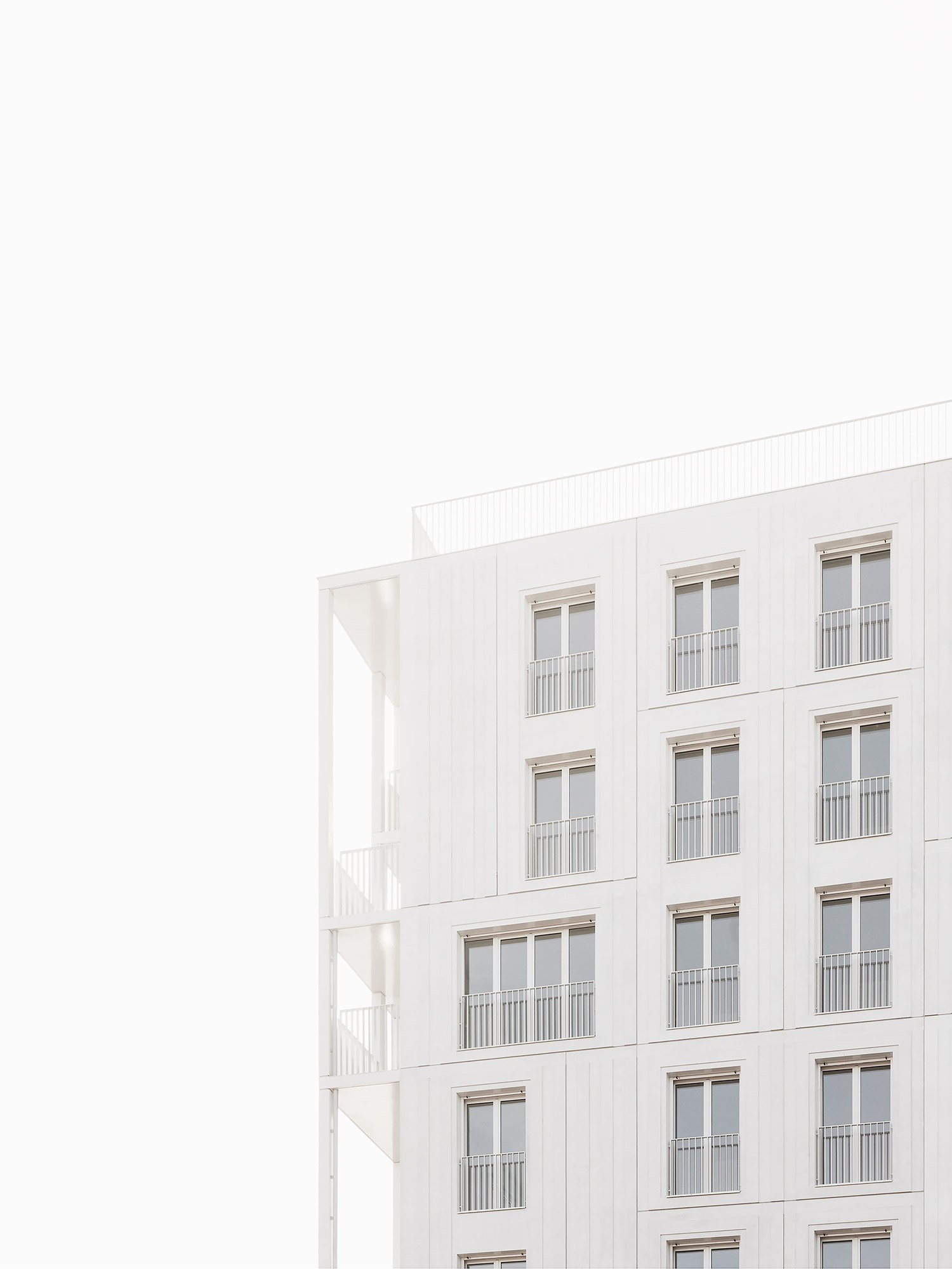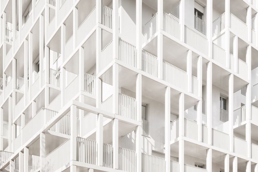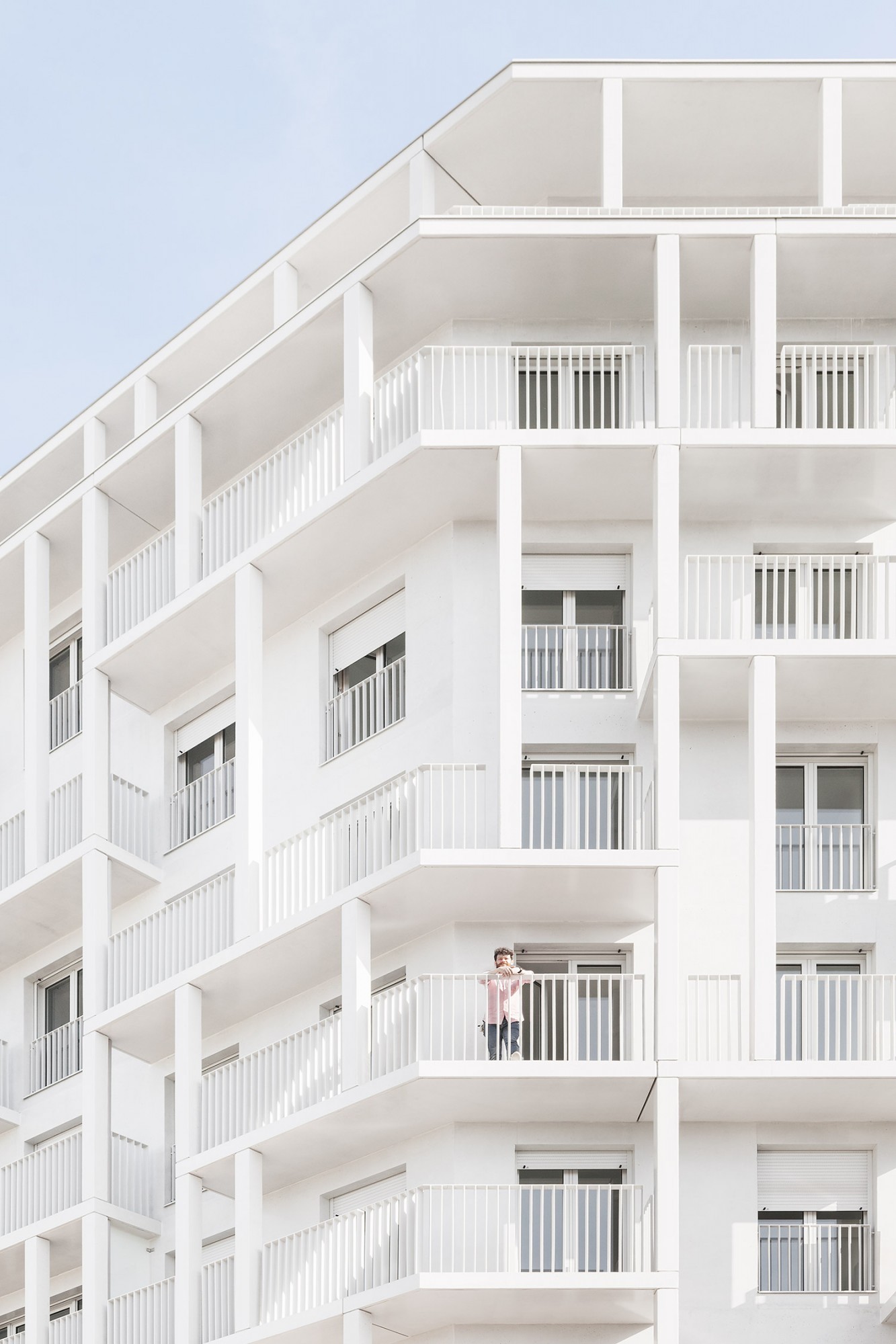 Le bâtiment très compact est étiré par un travail sur une seconde peau légère qui souligne sa verticalité. Selon les principes d’une esthétique façonnée par l’usage, cette résille de balcons, d’apparence aléatoire avec son jeu de simples et doubles hauteurs, est orchestrée sur la trame rationnelle des plans d’étages. Cette disposition en quinconce anime les façades, favorise l’ensoleillement des appartements et rationnalise les surfaces de balcon. Côté jardin, la matrice du béton met en relief une façade plane grâce à un jeu d’ombre et de lumière. Ses aspérités font écho au motif dessiné par la résille des façades sur rue.