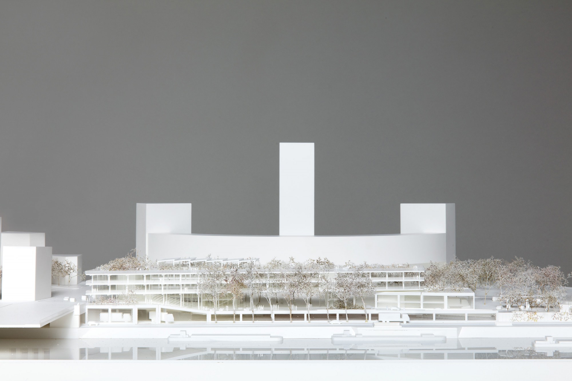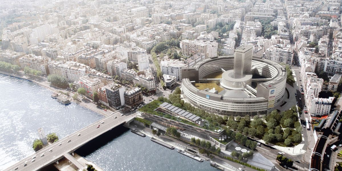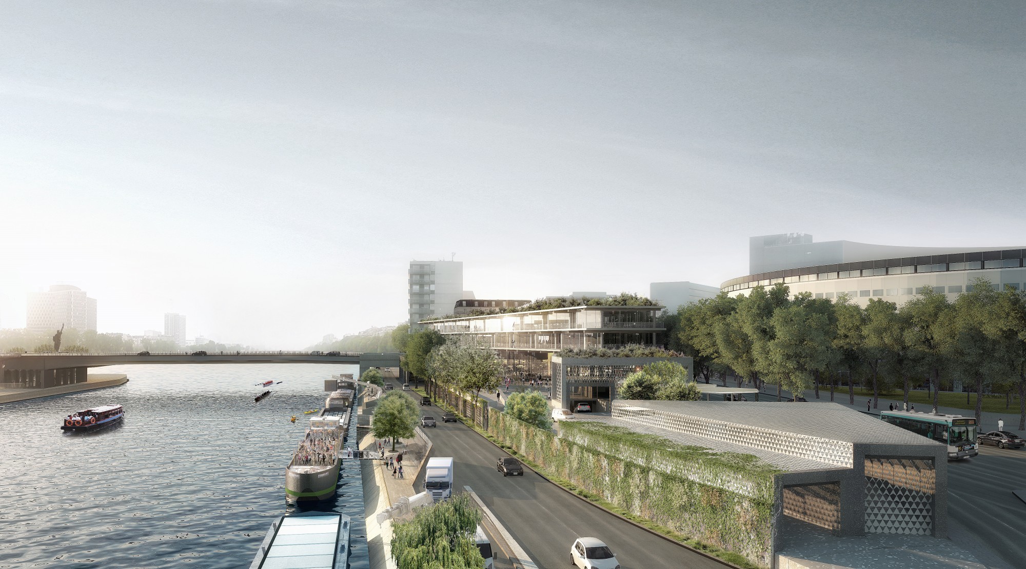 Pour s’intégrer au paysage horizontal des quais, la station multi-énergie est dessinée tout en longueur, aux pieds de la Maison de la Radio à Paris. À la façon d’un bâtiment léger sur pilotis, le pôle d’enseignement supérieur conçu par Hardel Le Bihan se compose de deux plateaux suspendus, prolongés par des balcons filants en belvédère. Ceux-ci sont surmontés d’un pavillon attique ouvert sur sa toiture jardin. Le pôle offre une façade légère et transparente, rythmée par les plis du vitrage qui dialoguent avec l’onde et multiplient les angles de vue panoramique. À l’intérieur, pour porter un nouveau paradigme éducatif basé sur l’entreprenariat, ses plateaux flexibles en ossature bois accueillent diverses formes pédagogiques, dans des espaces d’enseignement et dans un incubateur qui a vocation à assurer la transition des jeunes diplômés vers la vie active, en continuité de ces plateaux. Sa conception lui permet d’atteindre au moment de sa construction la labellisation environnementale E+/C-, la plus exigeante et conforme aux ambitions bas carbone de la Ville de Paris.