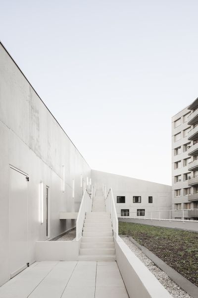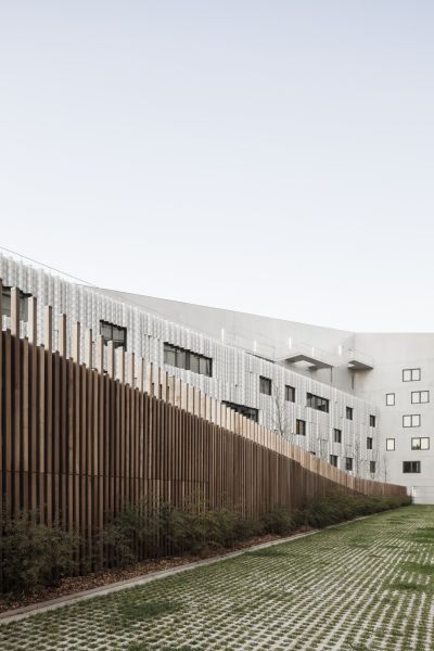 La forme du bâtiment signal, en pointe côté boulevard périphérique, matérialise la présence de la place en contrebas tout en maintenant un niveau bas par égard pour les logements de la barre Borel. La volumétrie du bâti limite la proximité entre les deux entités, par un effet d’enroulement et un désépaississement là où les façades sont les plus proches : à partir du R+4, les chambres ne donnent plus sur les logements.