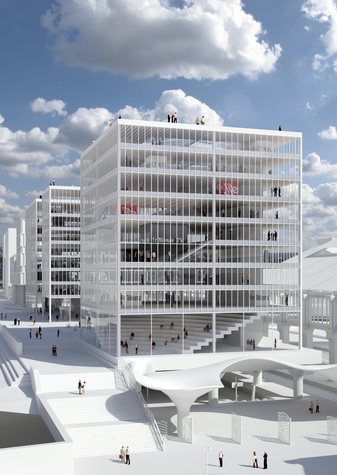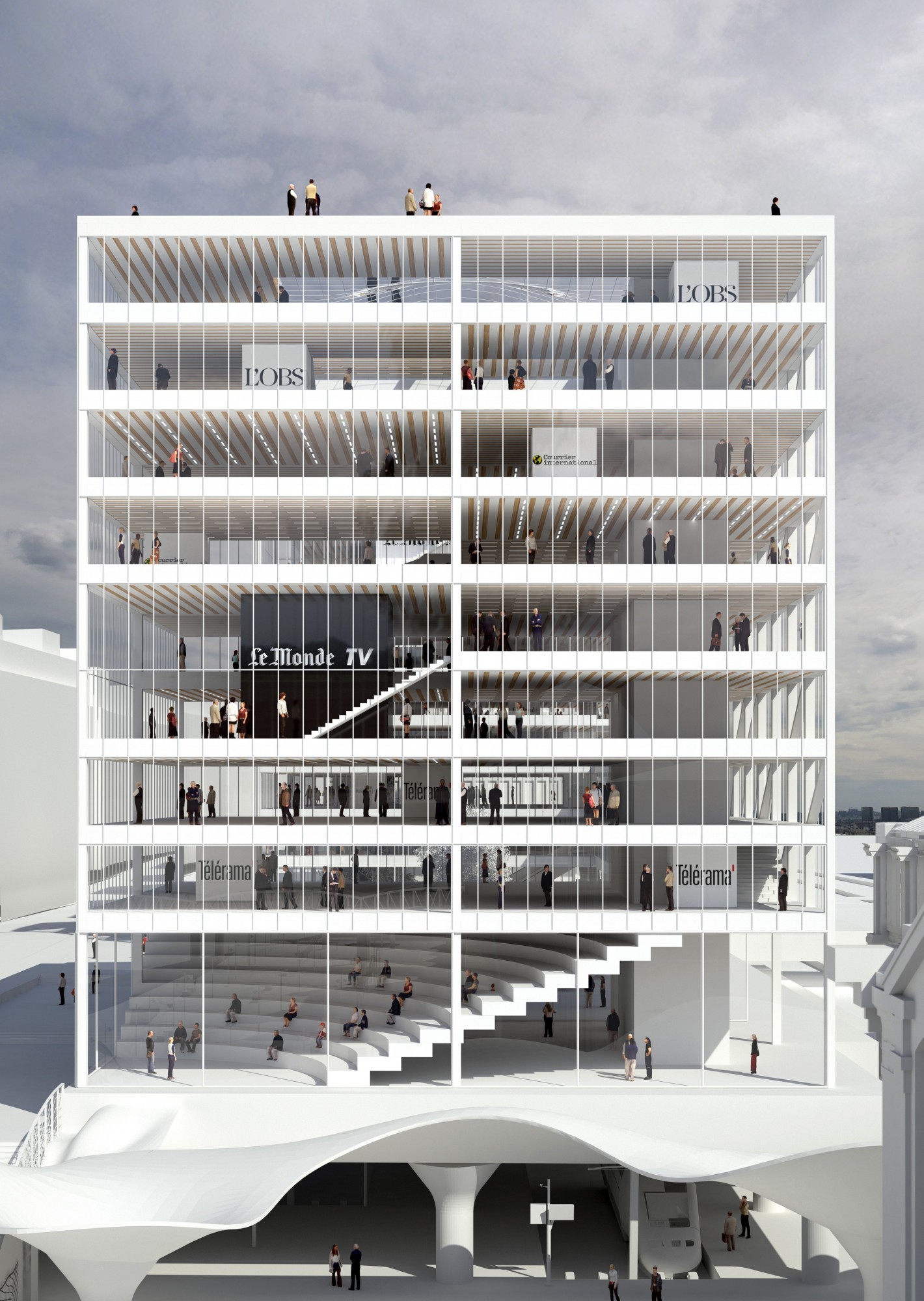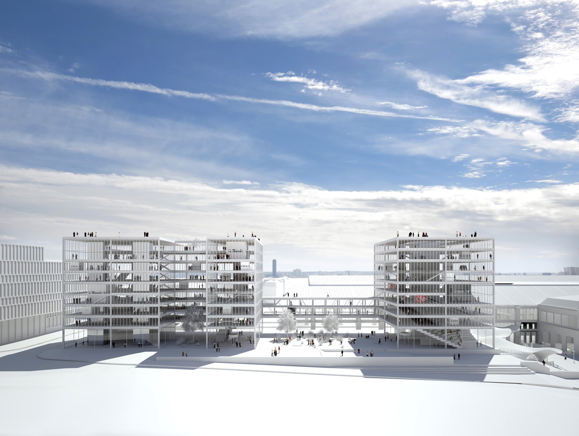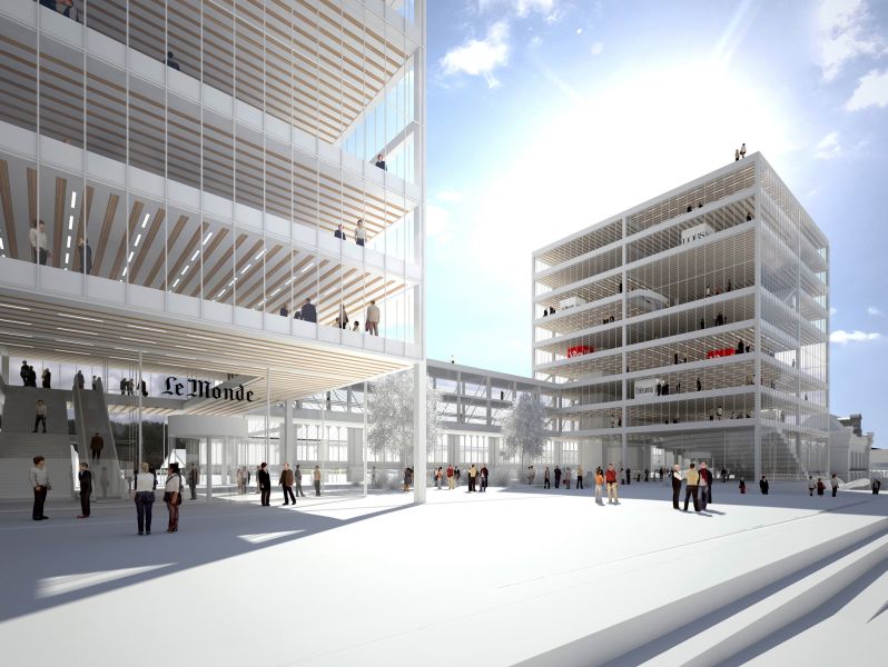 Le Monde souhaitait s’installer dans un édifice susceptible de tenir au cœur de Paris une place analogue à celle qu’occupe le quotidien du soir dans le paysage médiatique français. Ce bâtiment devait donc être un repère et un observatoire, donner du sens à la Ville qui l’accueille, et permettre en retour d’avoir sur elle et sur le monde un point de vue singulier et exigeant. Le site profitant d’une visibilité exceptionnelle, le projet devait d’abord mettre en valeur ses qualités métropolitaines. Sa volumétrie agit ici comme un révélateur de la topographie complexe du site et de la richesse du patrimoine architectural environnant. Mais c’est avant tout depuis les salles de rédaction, du dedans vers le dehors, que nous avons souhaité offrir aux femmes et aux hommes qui font chaque jour Le Monde un cadre qui les stimule. Un bâtiment dans lequel l’information circule sans entrave, où la réflexion puisse se construire dans la sérénité. Un havre protecteur pour les journalistes, propice aux débats, tout en devenant un lieu ouvert aux acteurs de la vie politique, économique et culturelle, comme aux lecteurs des différents titres du groupe.