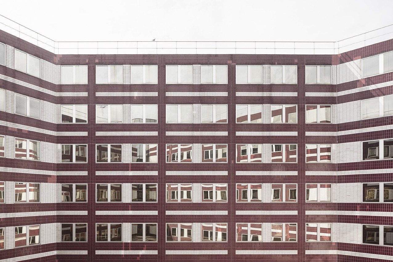 On the facade an inclination is incorporated which lightens the solid panels between glazed openings, while above, the spandrel panels are cut down to allow for more glazing and make the building appear lighter.