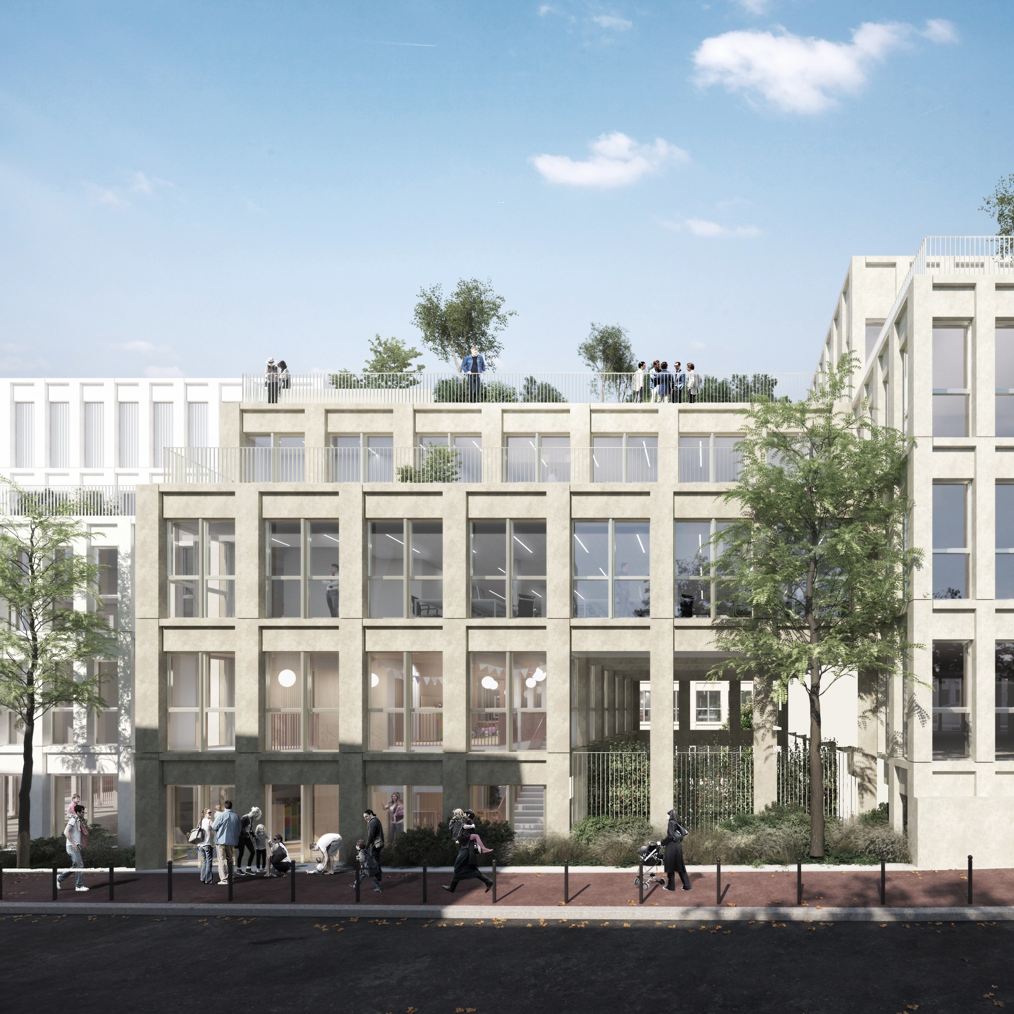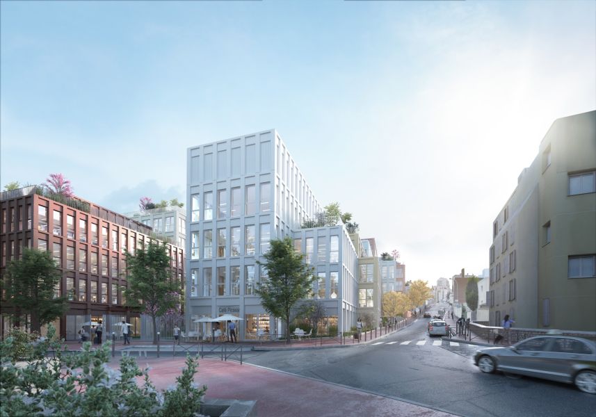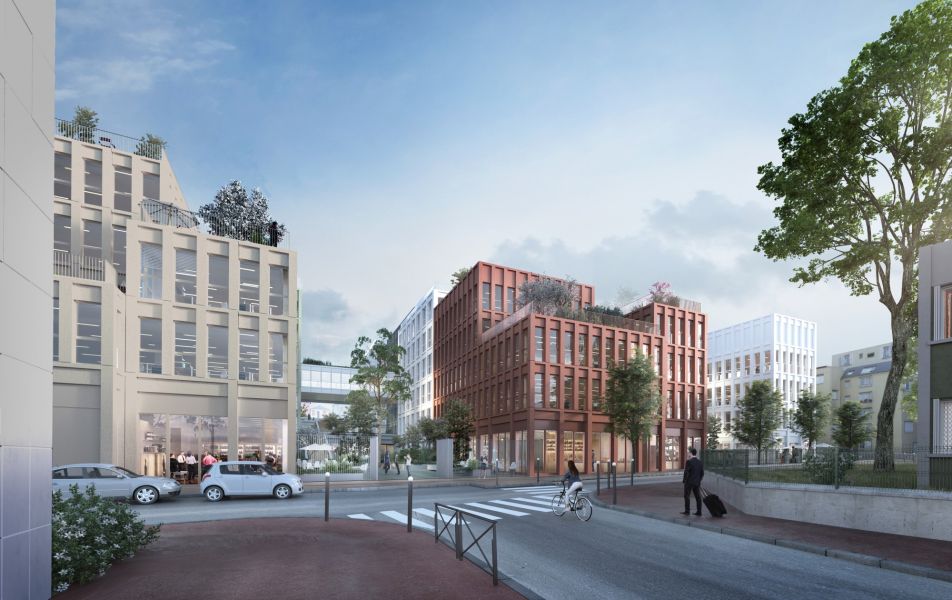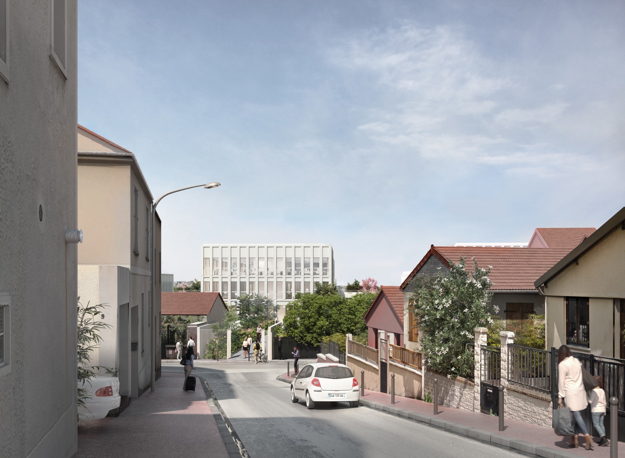 The site sits in the steep slope of the Bièvre Valley in the south-eastern suburbs of Paris. An awareness of the specific geography of the site is at the heart of this project for offices, and is revealed through transparencies and dynamic visual openings. The entire development is organised along three little valleys running north–south, allowing for the organisation of the different buildings and functions across the slope, each parallel to the other. The 11m-height difference across the site implies the creation of an upper ground-floor level at the level of Rue Pascal (G+4) and a lower ground level at Rue du Président Allende.