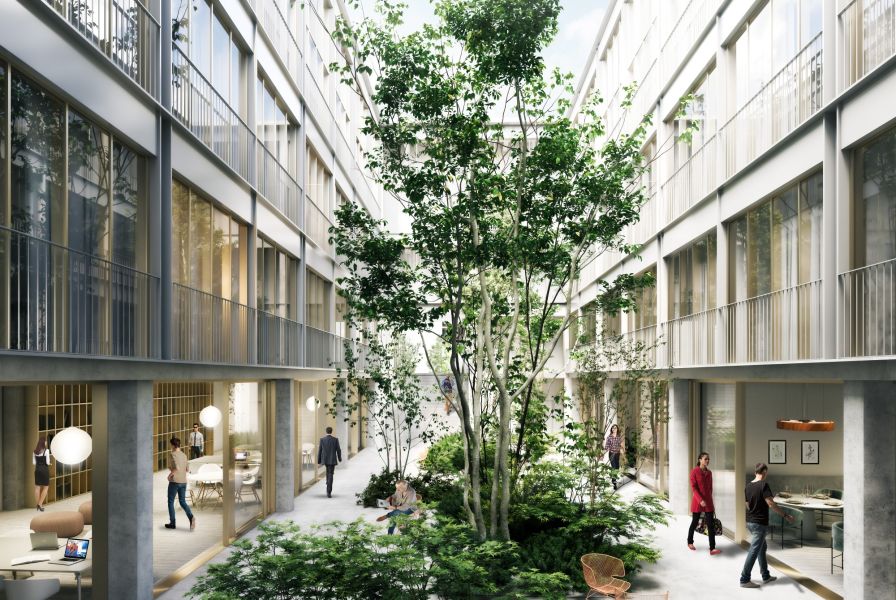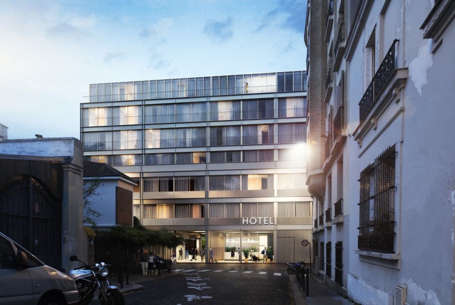 Our practice has won, together with real estate developer Coffim, the competition for the transformation of a former printing house into a hotel in the 20th district in Paris. The site is in the heart of a grassroots, industrial neighbourhood, typical of the East side, Rue de la Cour des Noues. The building will also host a coworking, a cocktail bar and a garden. On the street side, the facade made of concrete panels hides a metallic structure. Our project enlightens the industrial heritage by revealing the existing qualities of the printing house, through a new facade made of steel. Also, the public access to the coworking and patio in the center of the program is at the core of the concept. More picture of the site before transformation here.