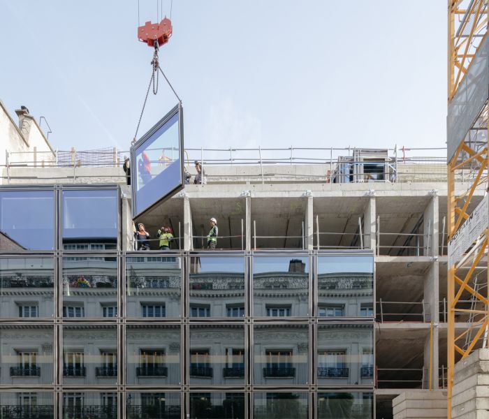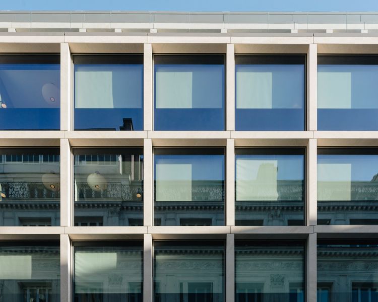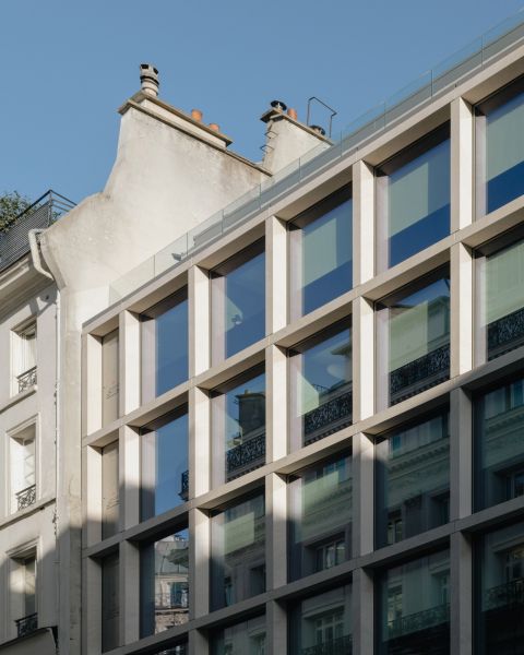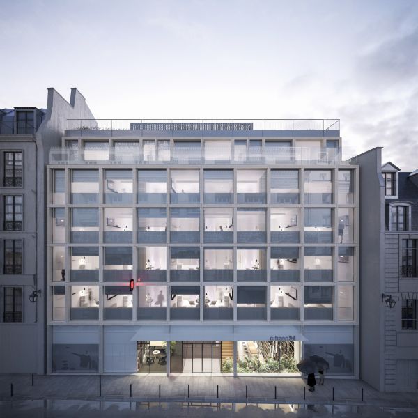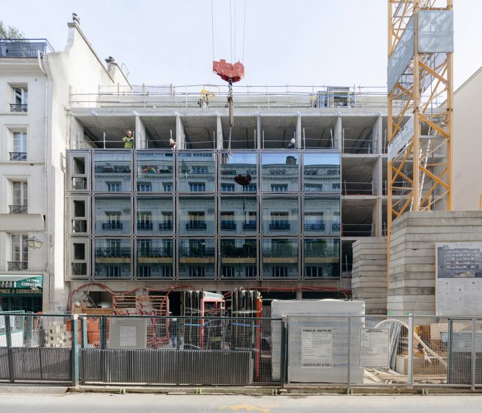 The existing office building is demolished in favor of an 84-room hotel developed on five levels. Part of the low floors are kept as infrastructure, except for a twenty square meter area at the back of the plot, where a charming shade garden blossoms in the open ground. A monumental staircase marks the entrance and leads to a first double-height basement, naturally lit, where the lounge, the bar, the patio and the meeting rooms are located. On the second floor, the furnished rooms are glazed on their entire facade. The window frames are concealed by natural stone frame elements. Thermal solar panels for the production of hot water conceal the technical equipment necessary for the proper functioning of the establishment.