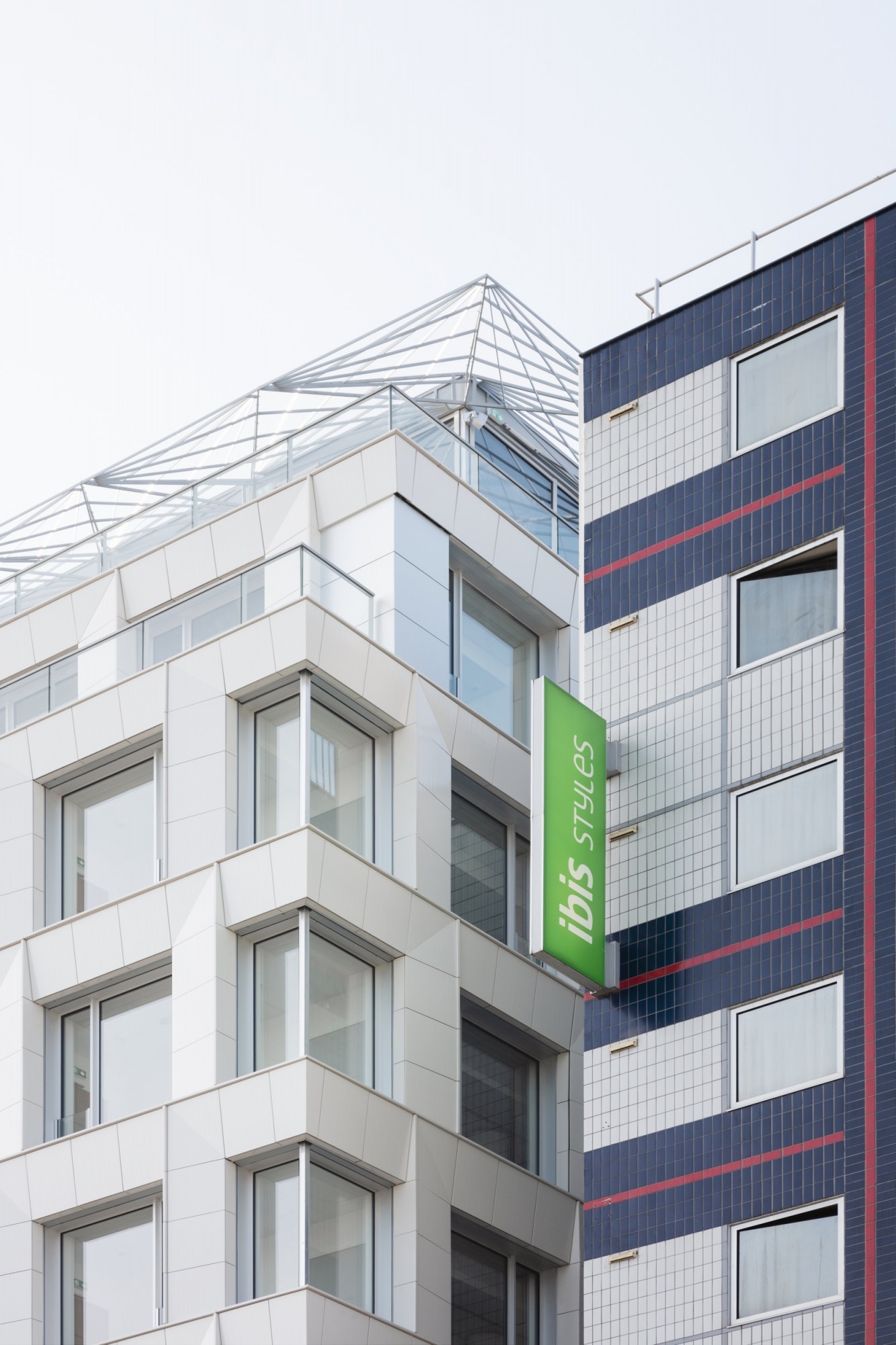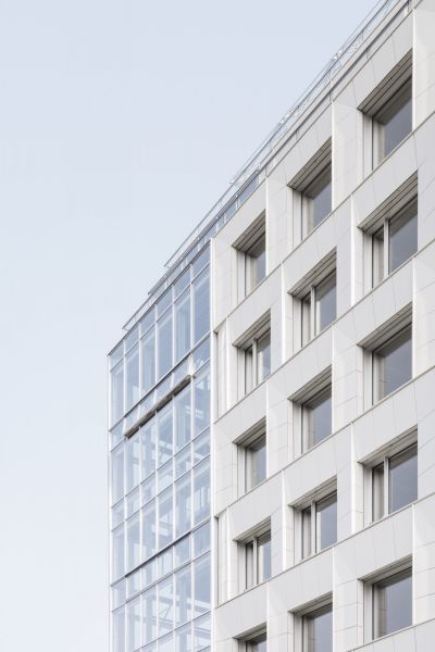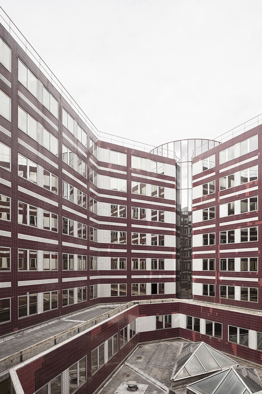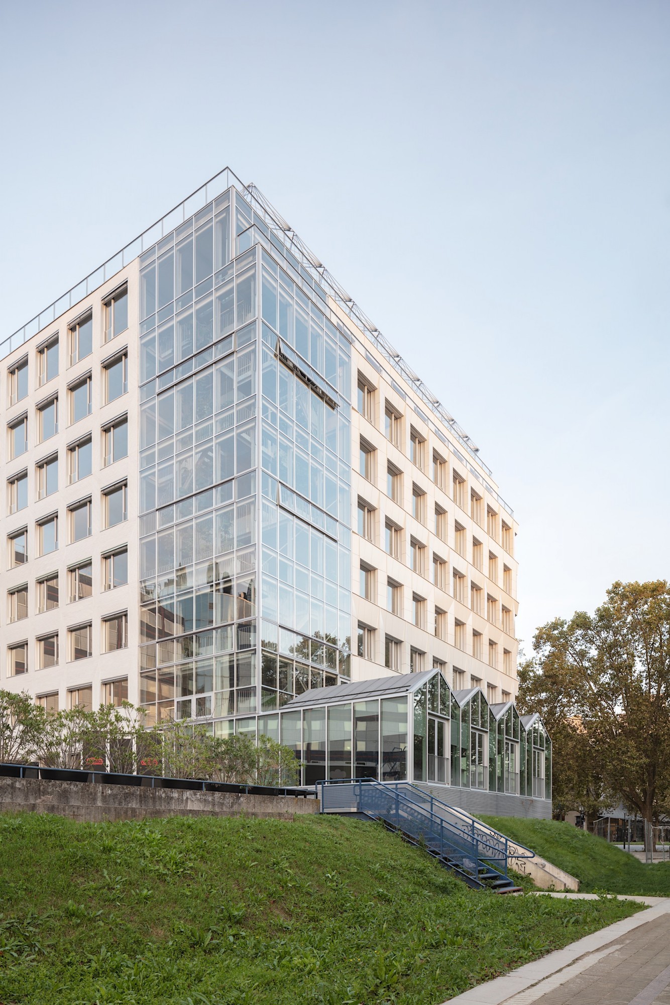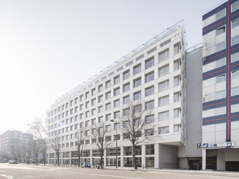 L’immeuble est surélevé à hauteur des saillies des anciens cylindres opaques de circulation, dont les voiles béton sont démolis. Deux angles sont refermés pour créer un grand plateau par étage et offrir de meilleures configurations d’aménagement et une serre agricole de 8 niveaux est créée dans le troisième angle, sur la toiture du restaurant. En façade, les allèges ont été sciées pour élargir la trame, augmenter le clair de vitrage et élancer le bâtiment. La disposition des larges carreaux de céramique émaillée blanche en biais affine visuellement les trumeaux et produit des jeux de lumière et de reflets qui animent la façade.