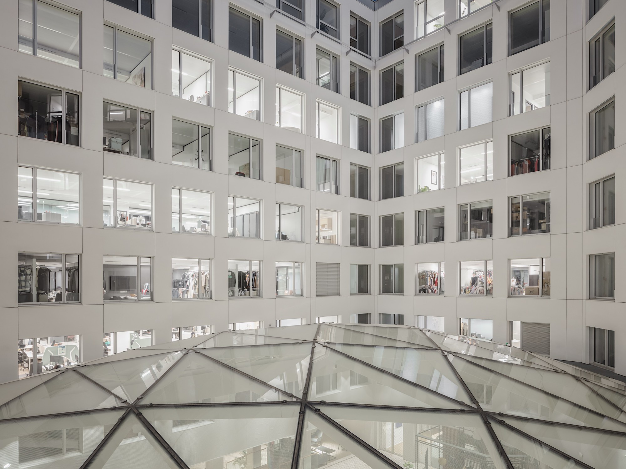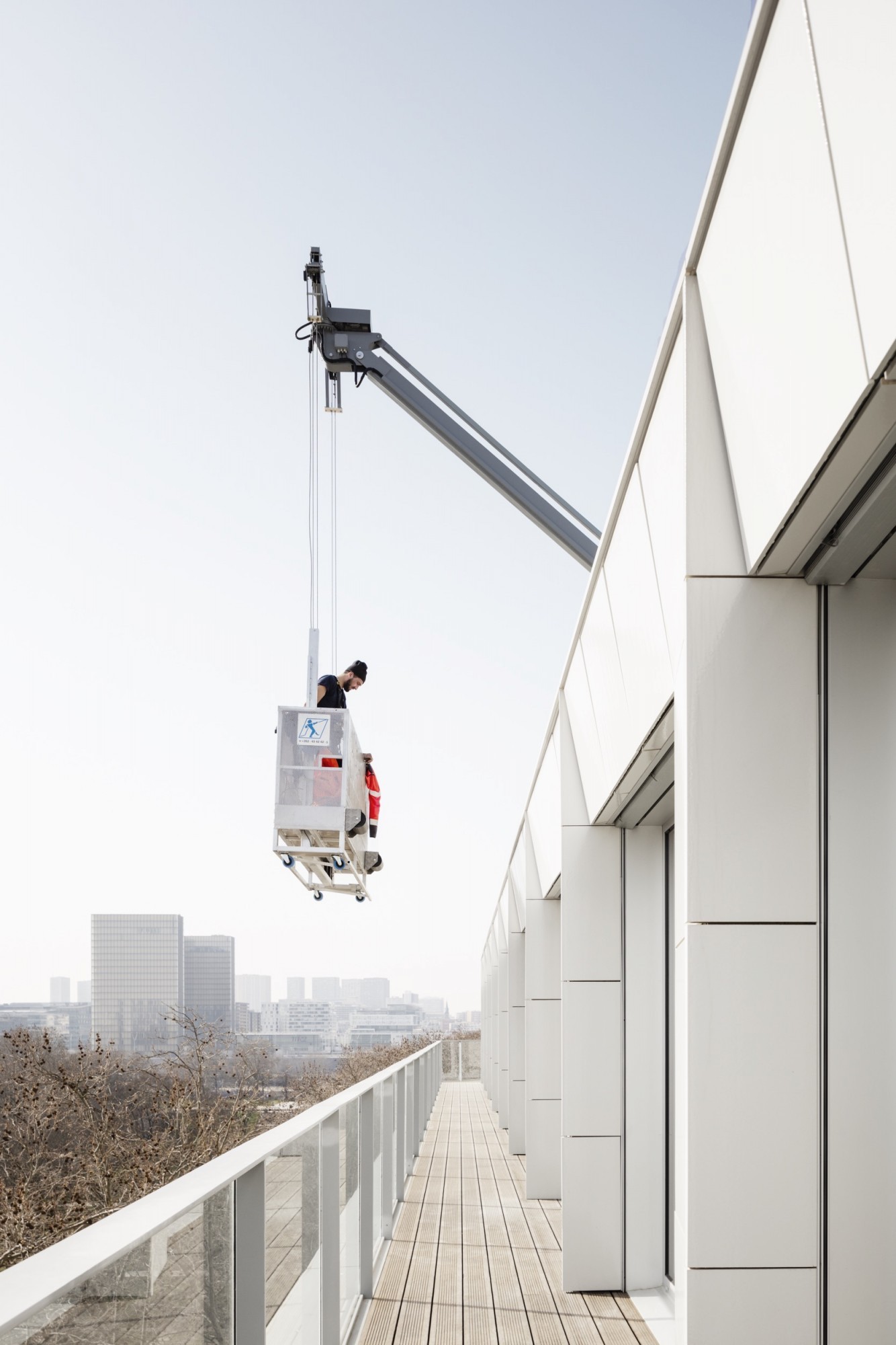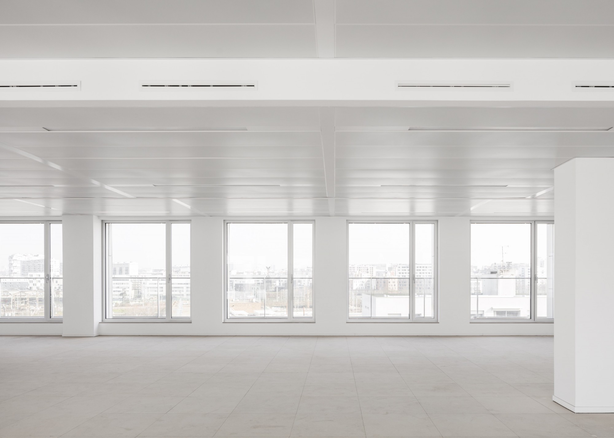L’immeuble est surélevé à hauteur des saillies des anciens cylindres opaques de circulation, dont les voiles béton sont démolis. Deux angles sont refermés pour créer un grand plateau par étage et offrir de meilleures configurations d’aménagement et une serre agricole de 8 niveaux est créée dans le troisième angle, sur la toiture du restaurant. En façade, les allèges ont été sciées pour élargir la trame, augmenter le clair de vitrage et élancer le bâtiment. La disposition des larges carreaux de céramique émaillée blanche en biais affine visuellement les trumeaux et produit des jeux de lumière et de reflets qui animent la façade.