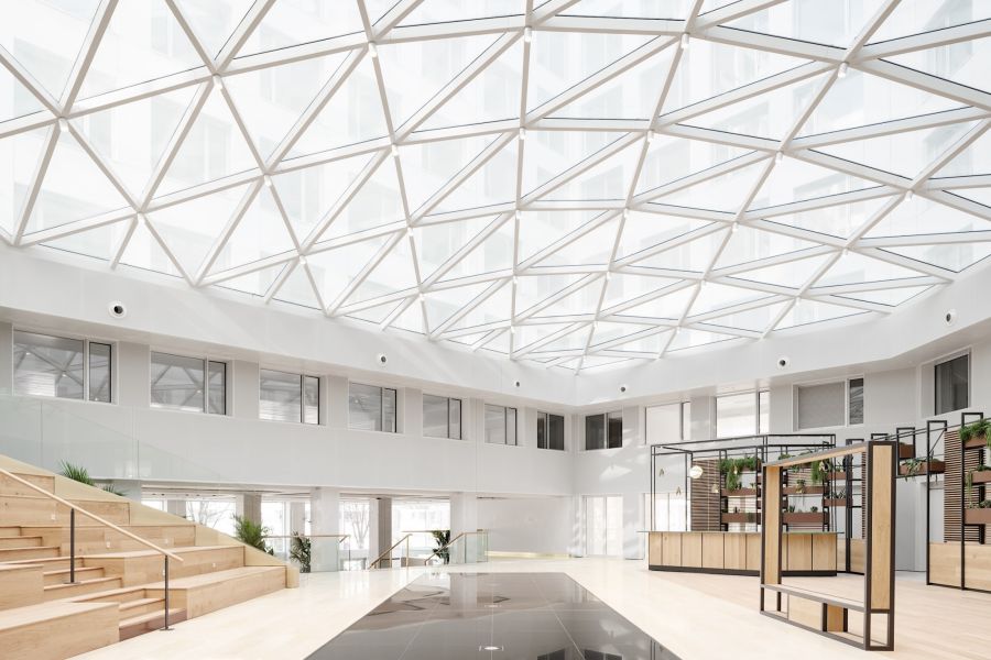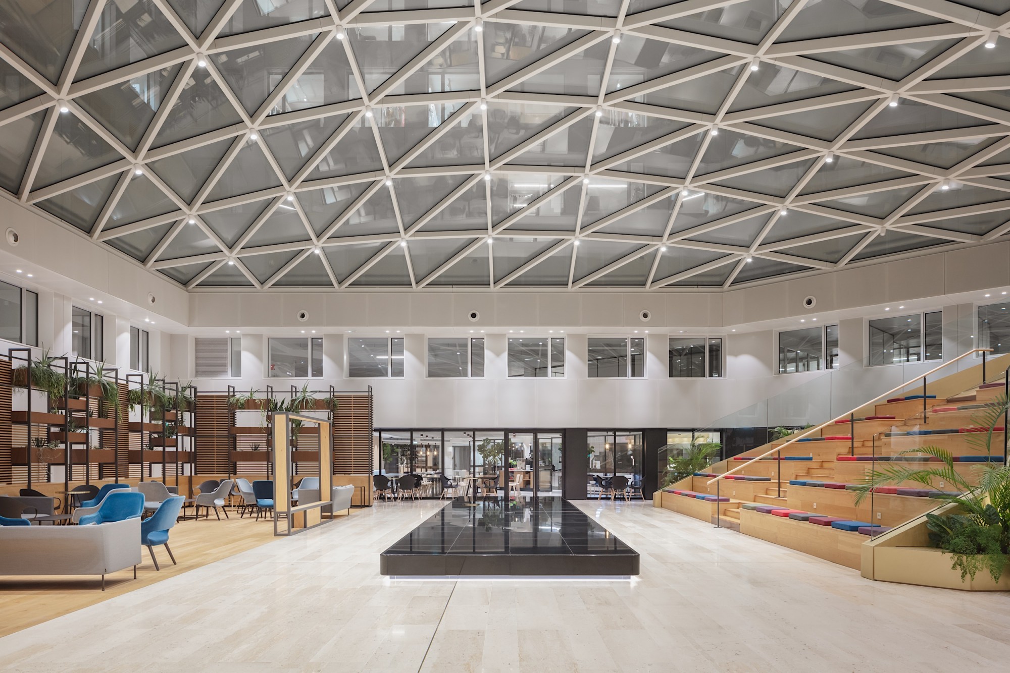 La réhabilitation des 13 000 m² de bureaux de la rue de Bercy a permis d'ouvrir ce bâtiment qui était complètement coupé de son environnement, un paradoxe compte tenu des qualités de sa situation urbaine sur le parc de Bercy, face à la Cinémathèque Française. Le RDC, occupé par un parking de l’AccorHôtels Arena, tournait le dos à la place Bernstein et au parc. Sur la rue de Bercy, le projet conserve l’entrée et le hall mais réduit le parking à une poche centrale, ceinturée de commerces ouverts sur l’extérieur. Au cœur du bâti, un atrium baigné de lumière naturelle est créé grâce à la démolition du socle (R+1). Les parcours sont fluides et ouverts entre l'entrée, l'agora, le restaurant et les étages, auxquels on accède par un grand escalier tout en transparence, non encloisonné.