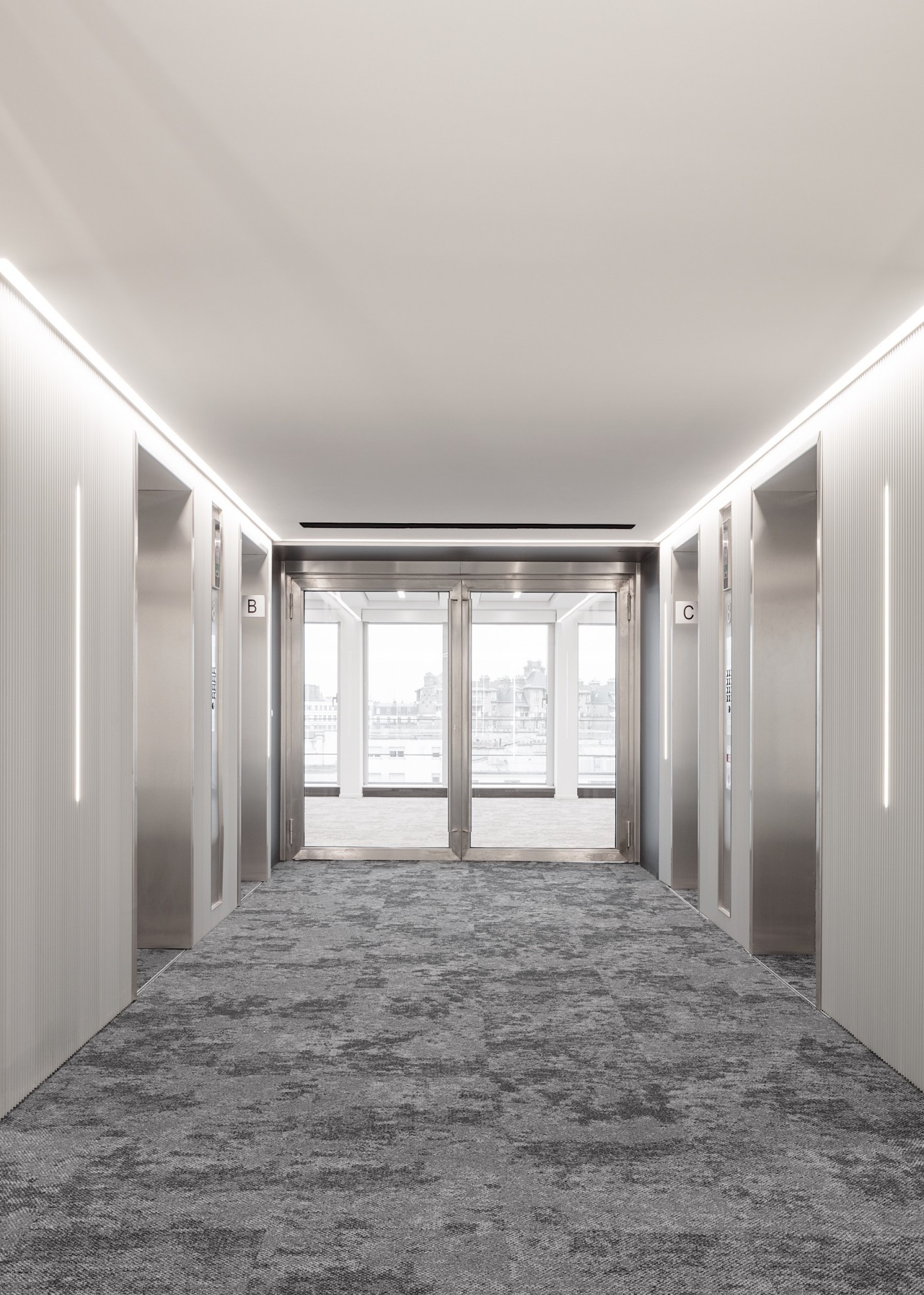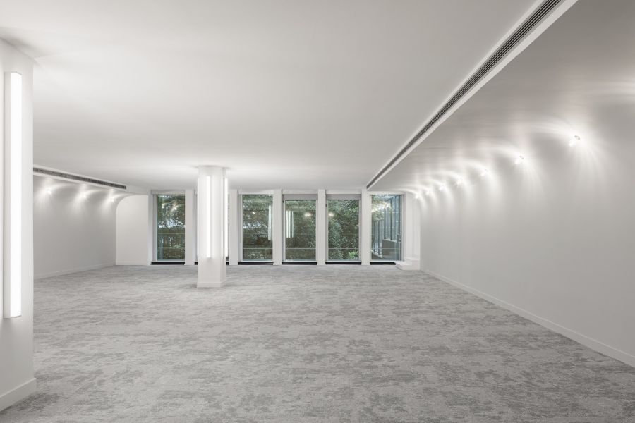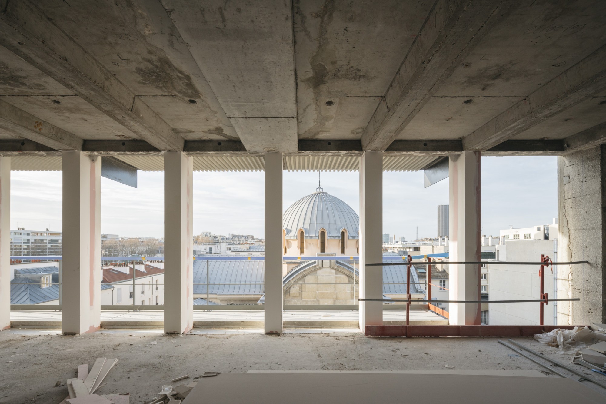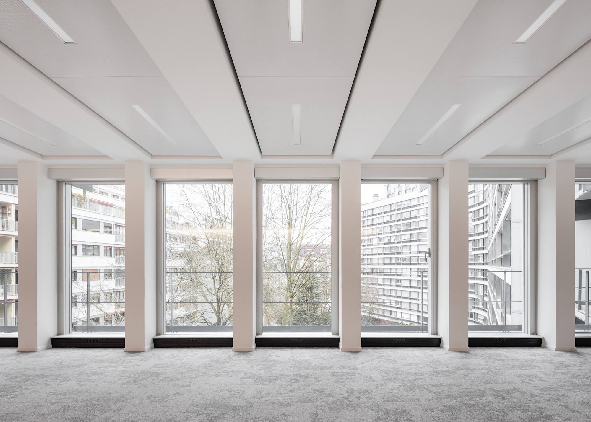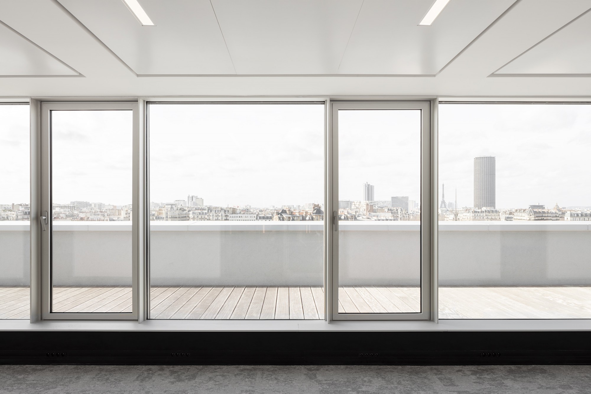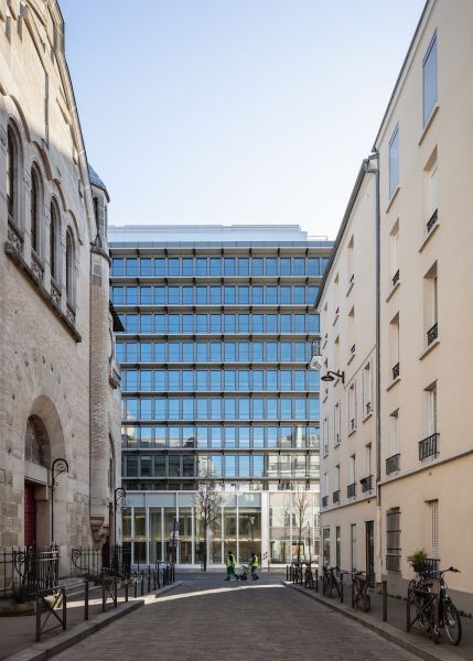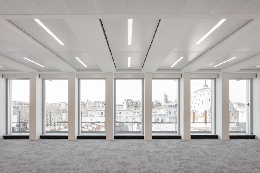 En plan, les surfaces de bureaux sont désormais des plateaux libres, flexibles et reconfigurables, développés autour d’un noyau central restructuré ; les paliers sont éclairés naturellement ; la CHC a été optimisée, passant de 150 à 50 m² par niveau. La coursive périphérique permet d’intégrer des protections solaires intérieures et d’entretenir la façade sans nacelle. À R+2, une partie des surfaces prévues en bureaux classiques devient un espace de coworking attenant à la terrasse de plein pied. La terrasse du R+11 est également libérée et agrandie, avec vue à 360° sur les toits de Paris, grâce à l'optimisation de la technique.