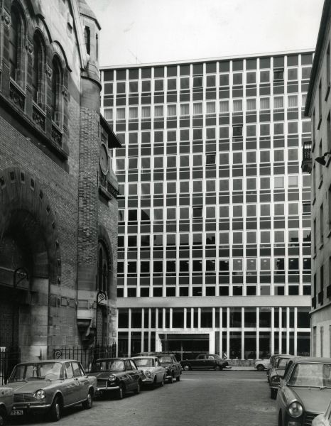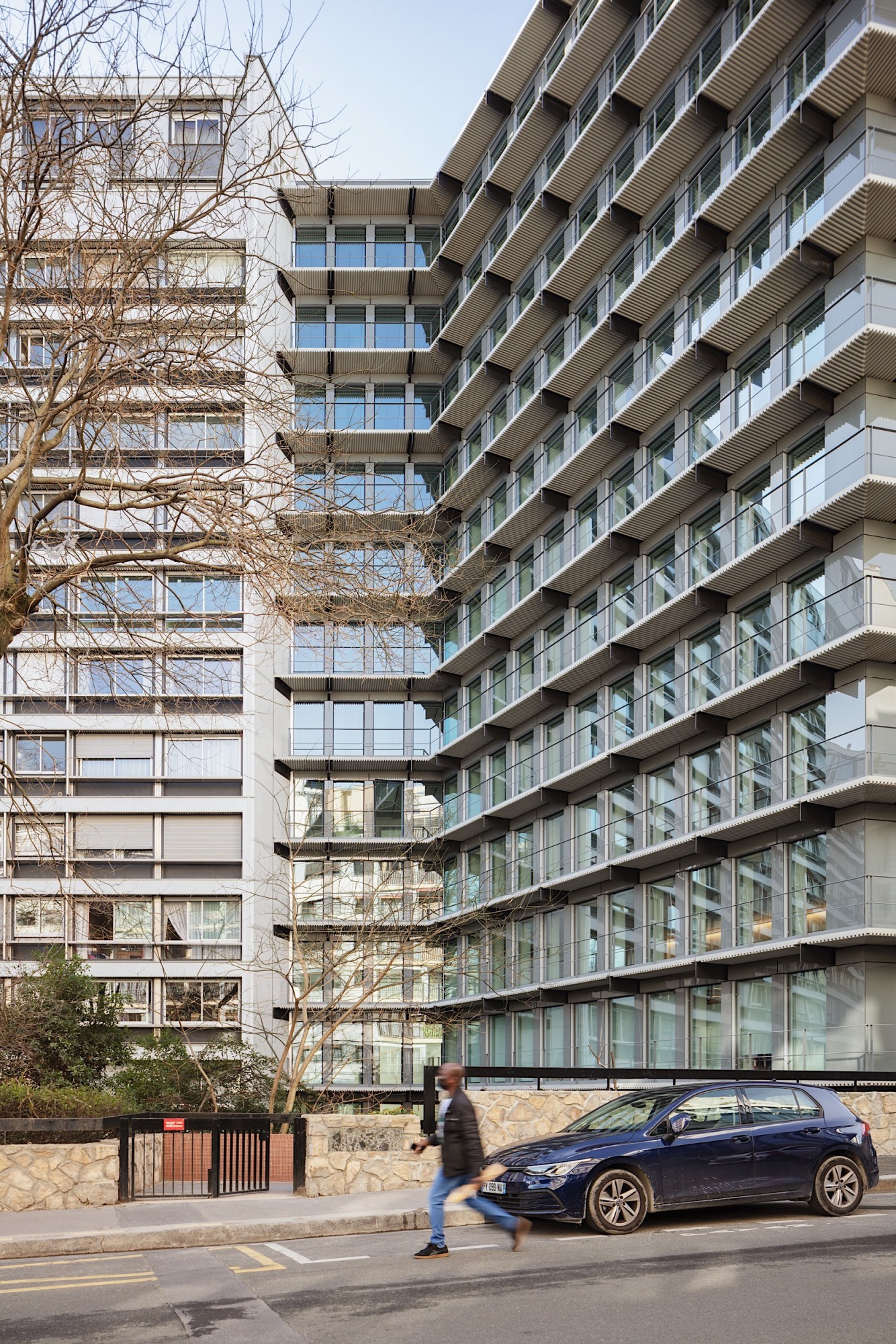 Le projet de transformation de cet immeuble tertiaire de grande hauteur saisit l’occasion d’un désamiantage pour redéfinir ses programmes et usages. La façade du socle est mise à l’échelle du bâti. Elle s’étire en double hauteur à la manière d’un écran protecteur pour le jardin japonais extérieur qui s’insère à l’angle des deux voies. Le rez-de-chaussée a été entièrement repensé. L’entrée s’inscrit dans une logique de séquence fluide, dans le prolongement du parvis, au centre du bâtiment. L’accueil est connecté à une salle de réunion avec vue sur le jardin, et à un salon qui fait la transition entre intérieur et extérieur.