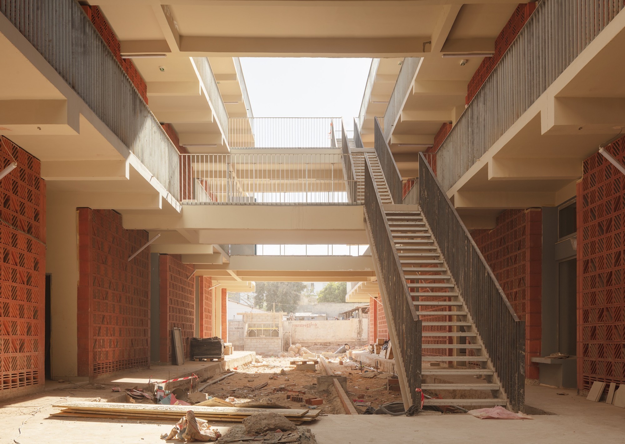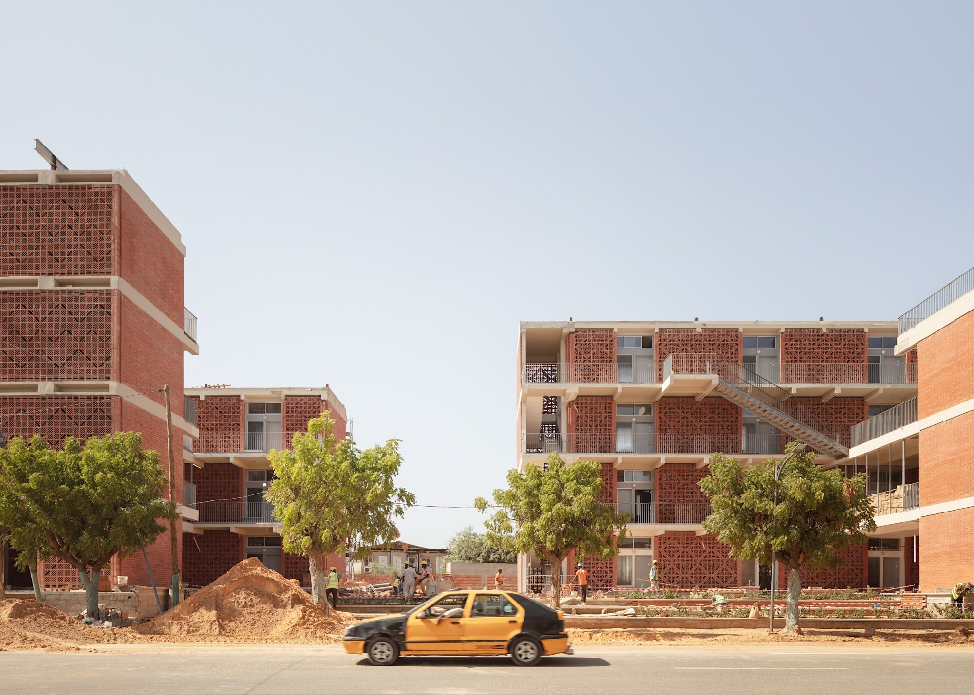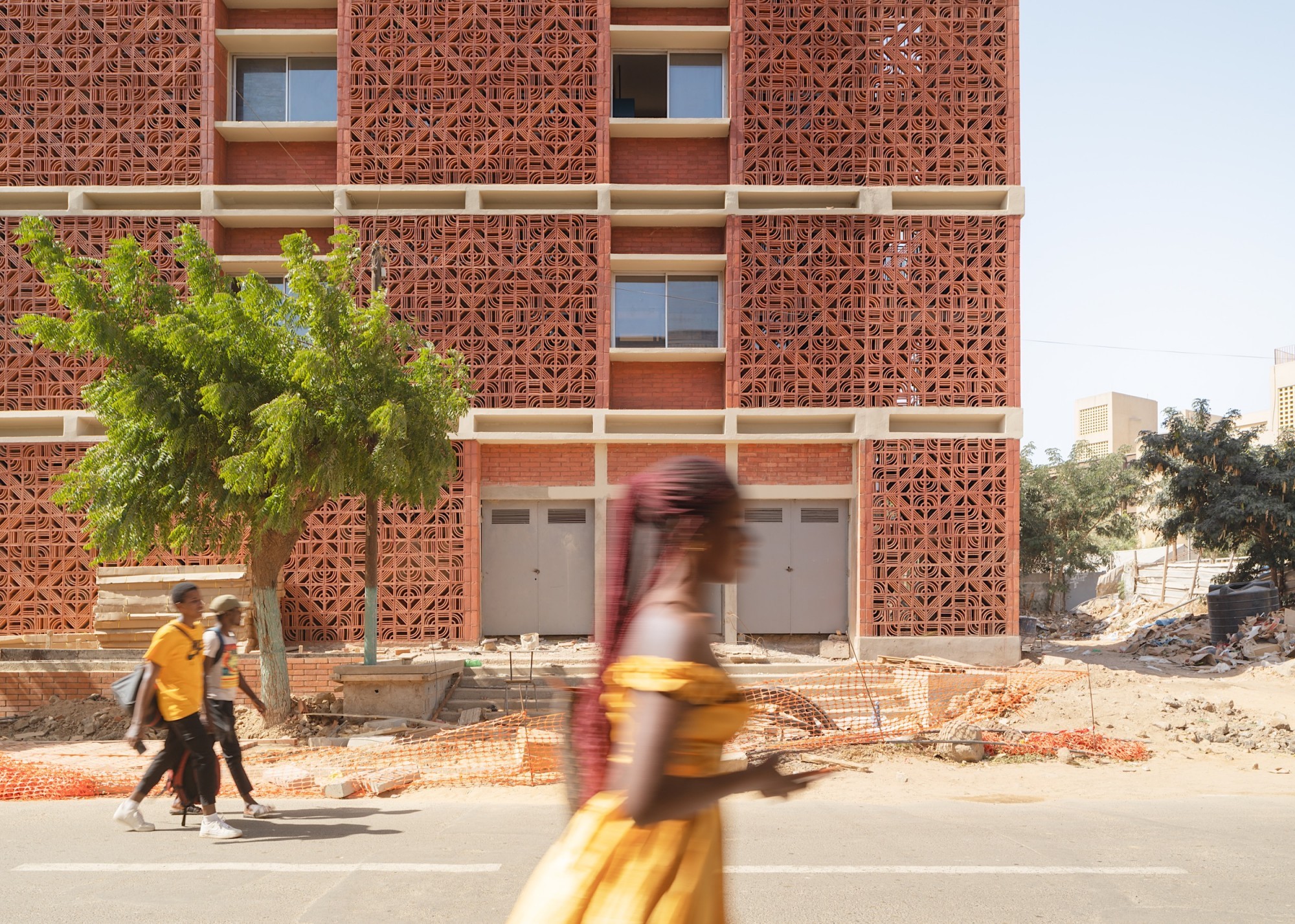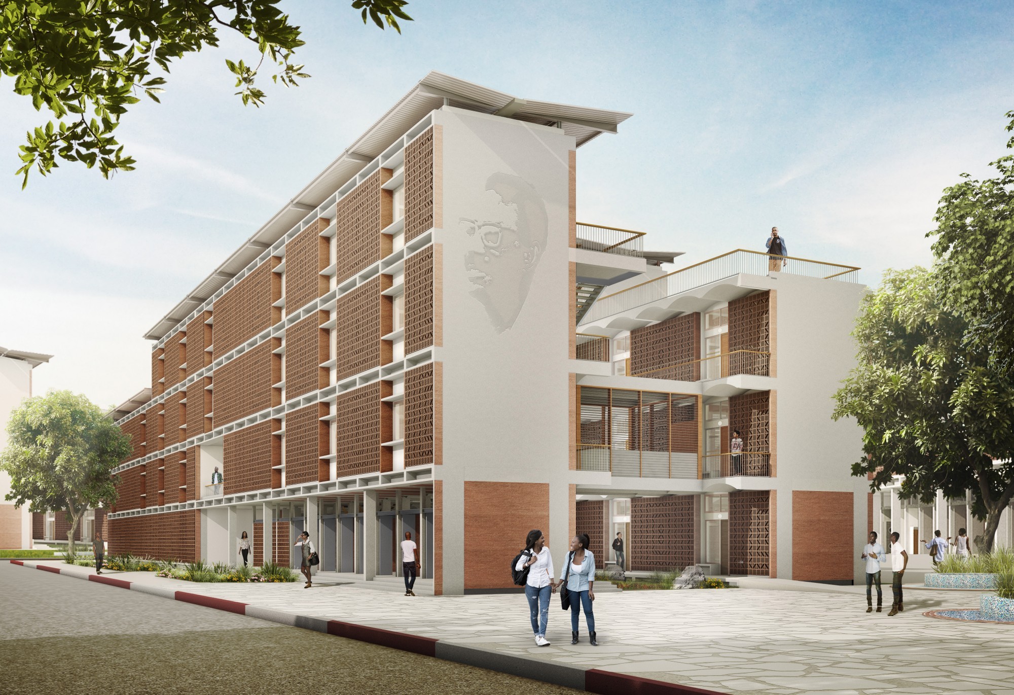 Les rez-de-chaussée actifs sont aménagés en espaces collectifs (laverie, salle d’étude, salles télé, locaux associatif, cuisines) et des commerces destinés aux étudiants. Le Campus est ouvert sur la ville, grâce à la création de nouveaux accès, de placettes publiques et d’espaces verts. Les façades, définies par la présence de la trame régulière des chambres, sont animées et identifiées par les motifs des moucharabiehs (protection solaire et intimité) différents. Ceux-ci ont été dessinés en collaboration avec l’artiste sénégalais Alun Be, auteur des mosaïques de briques qui orneront les murs pignons sur le thème des enseignements de l’UCAD.