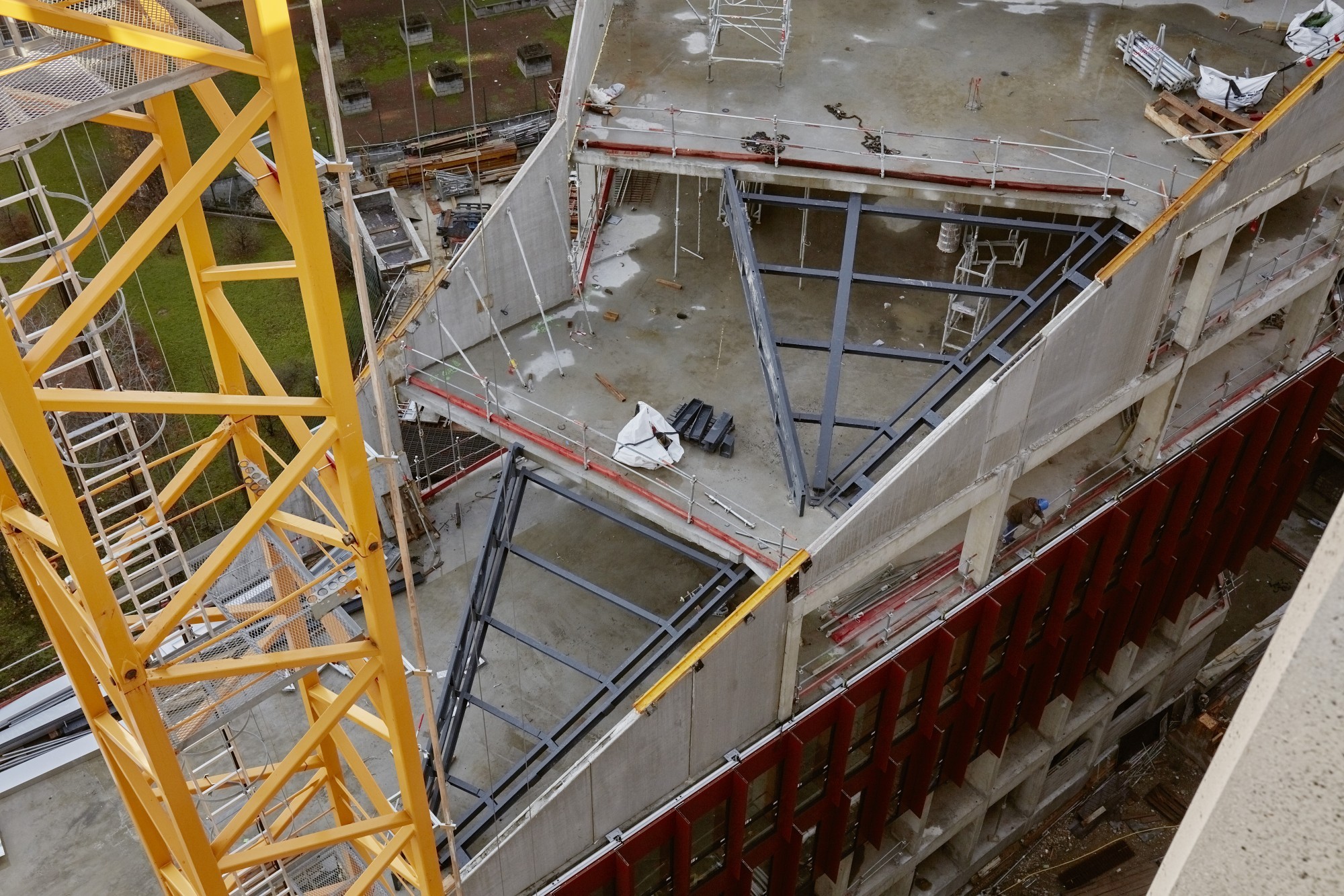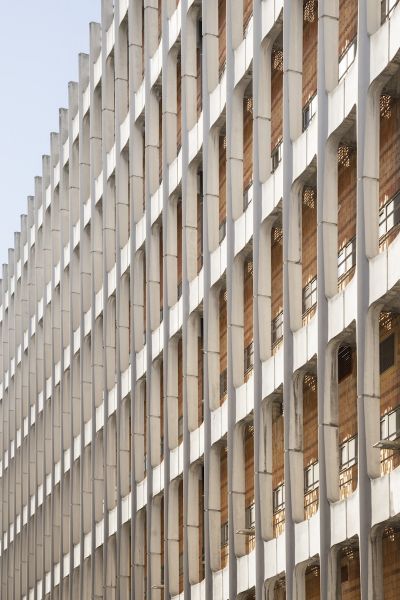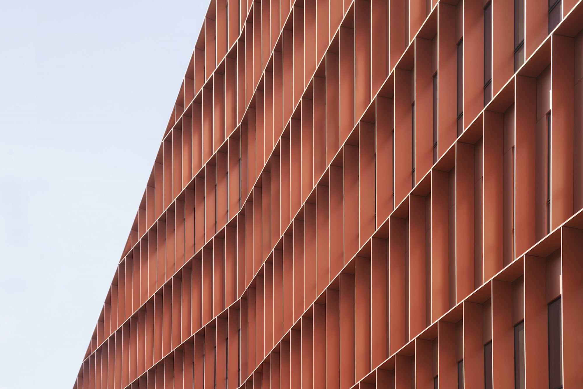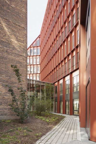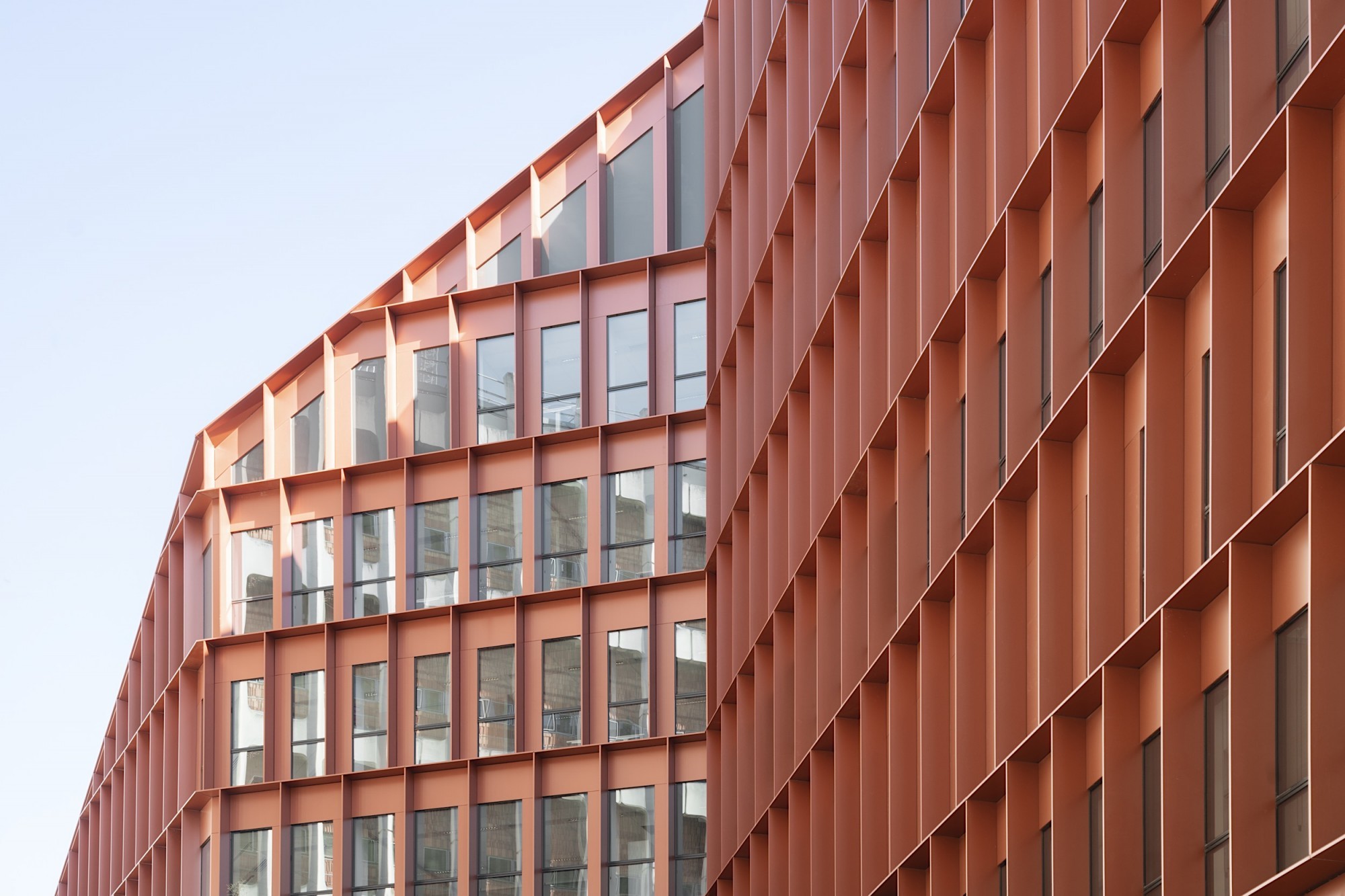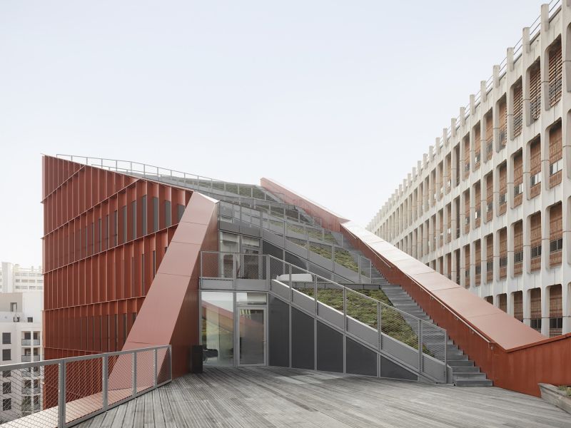 Le nouveau siège d’Orange, extension-transformation du central téléphonique Lacassagne, valorise le bâtiment industriel et redonne une cohérence urbaine à l’îlot, en décomposant le projet en deux volumes « pliés » qui viennent envelopper l’existant. Notre parti-pris à l’échelle du quartier consiste à créer de grandes continuités et une « facilité des sols » pour réduire les symptômes associés à la multiplication des opérations et à la sur-diversification de natures et de textures. Les nouveaux édifices trouvent une harmonie dans la trame homogène des façades (écho au bâtiment existant) et les pans coupés qui sculptent les volumes en dégageant de larges terrasses végétalisées pour les niveaux de bureaux. Le principe de toiture rampante a le double avantage de cadrer l’existant pour le valoriser, et de dégager des vues vers et depuis les logements situés à proximité. L’extension sud sculpte le bâtiment industriel du central technique par ses lignes brisées, le révélant dans sa dimension patrimoniale. La façade en aluminium laqué rappelle la teinte des briques du central, visibles derrière l'exosquelette en béton.