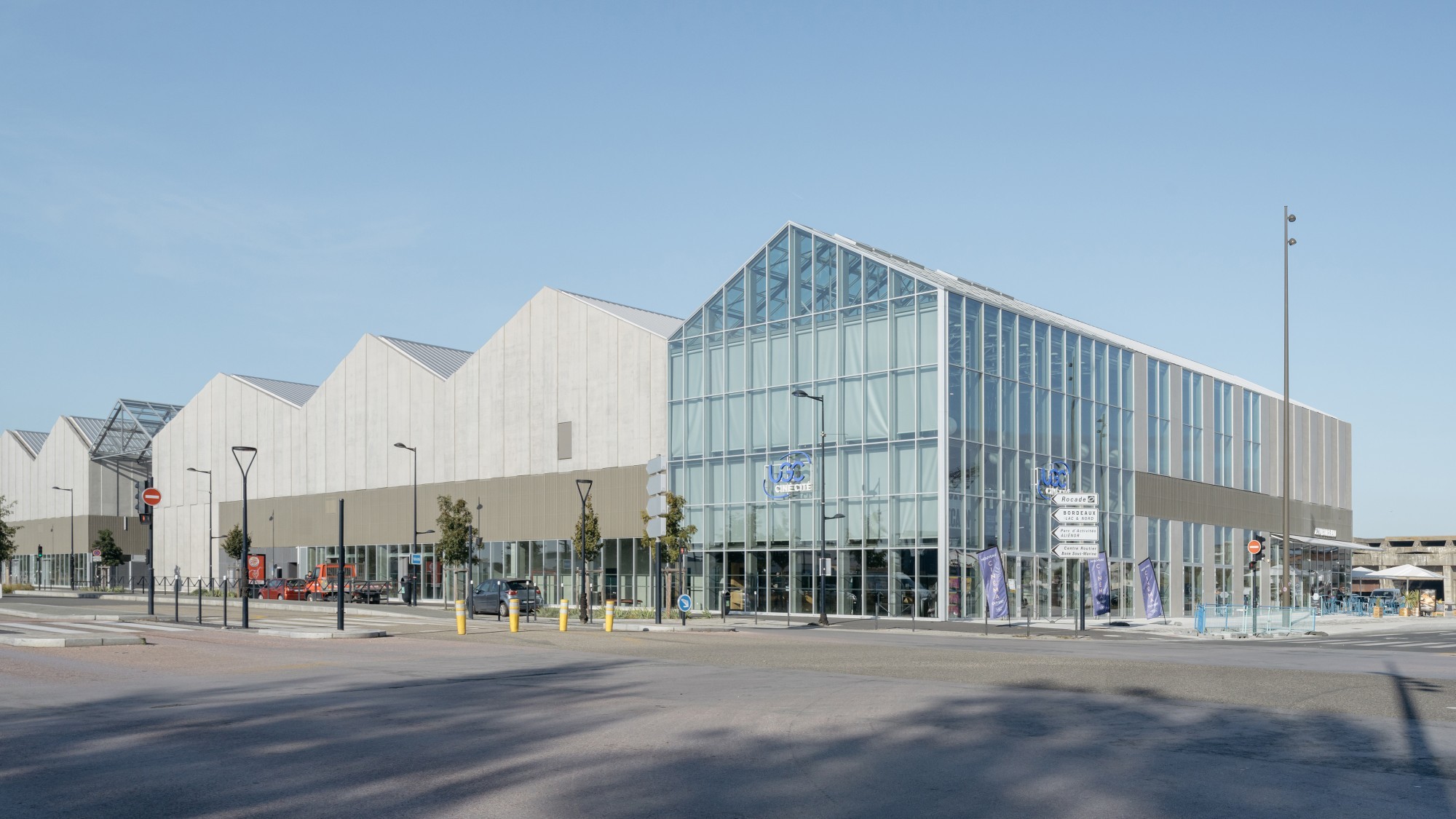 Le cinéma s’étend entre le quai et la rue Lucien Faure sur deux îlots d’environ 80 m de long par 45 m de large, séparés par une sente piétonne couverte. Son entrée fait face à la nouvelle place du Pertuis. Depuis le hall jusqu’aux salles, l’équipement est largement ouvert sur la ville. La longue circulation du premier étage, conçue comme une rue intérieure, offre des séquences de vues sur Bordeaux, sur l’eau des Bassins à flot, et participe à l’animation urbaine des façades ; les sorties de salles réparties sur l’ensemble de l’îlot ou encore la destination commerciale du RDC participent à cette recherche de dialogue entre le nouveau cinéma et son environnement. La forme, le jeu des toitures et l’organisation du bâtiment exploitent les atouts du site pour augmenter sa qualité d’usage et son bilan énergétique. Les surfaces vitrées et les systèmes de protections solaires sont adaptés à leur orientation pour optimiser le confort thermique, acoustique et visuel. L’aménagement de jardins extérieurs en surplomb du quai permet d’apporter de la lumière naturelle au centre du bâtiment, tout en créant des respirations végétales pour les occupants autant que pour les piétons qui parcourent les quais.