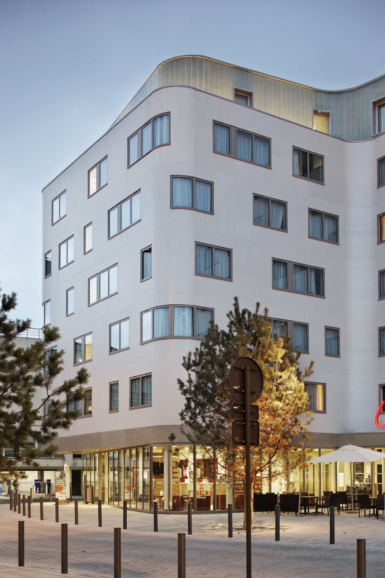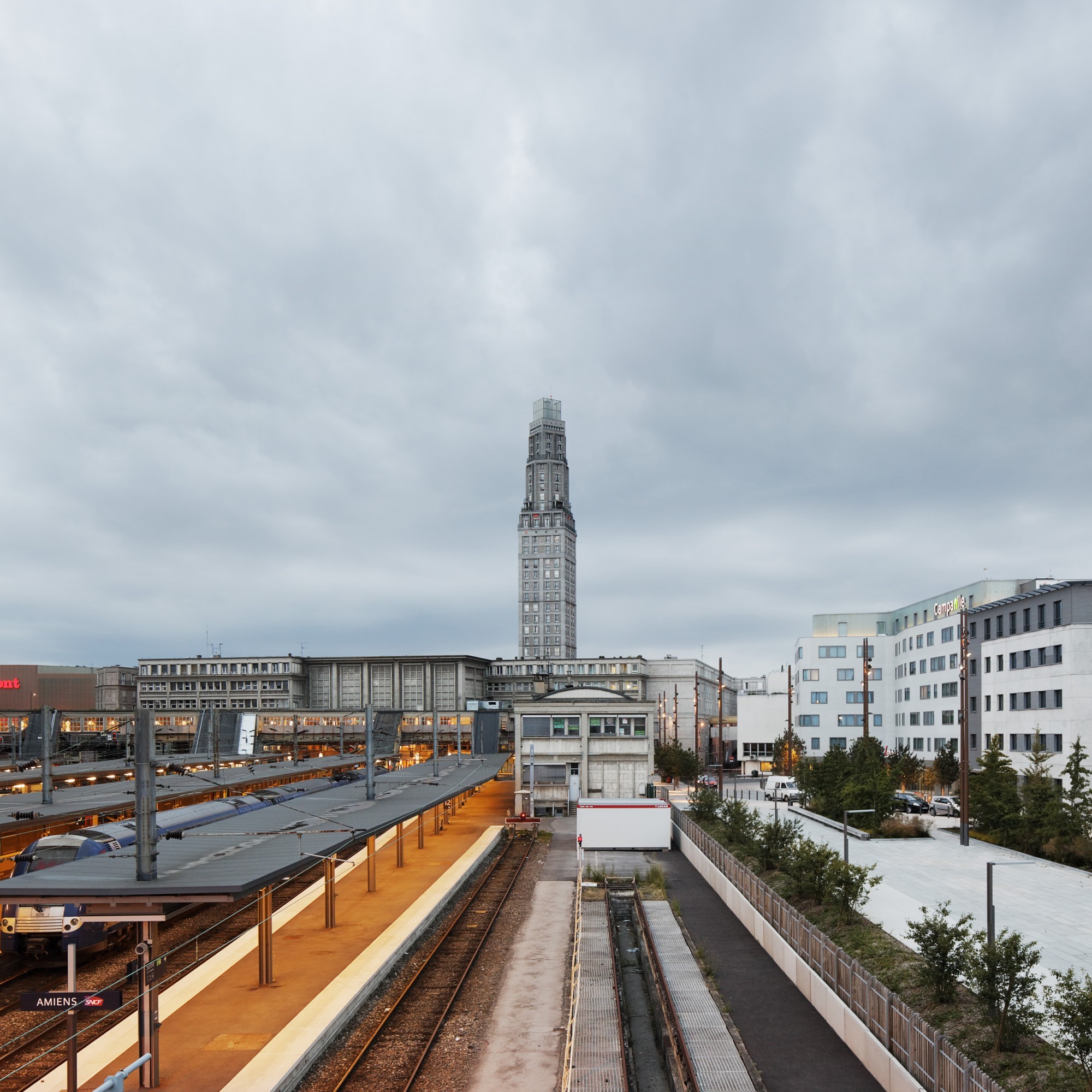 L’hôtel est par sa fonction et son architecture, le premier repère des voyageurs quittant la « Gare du Nord » par le sud. Le rez-de-chaussée, largement ouvert sur l’espace public, se veut le prolongement du parvis. Le corps principal érigé à R+5 prend la forme d’un grand voile de béton courbé et cintré sur les principaux angles afin d’adoucir la volumétrie et de faire écho aux courbes tendues des voies ferrées qui longent la place. Le béton blanc rend hommage à l’œuvre d’Auguste Perret : la gare, la place Alphonse Fiquet et la tour. Un dernier niveau d’attique traité en verre profilé et rétroéclairé souligne les courbes de la façade et renforce la présence du bâtiment la nuit, en référence aux enseignes lumineuses caractéristiques des quartiers de gares. La composition organique des ouvertures amplifie quant à elle la dynamique de la façade malgré la stricte régularité de sa trame structurelle et fonctionnelle.