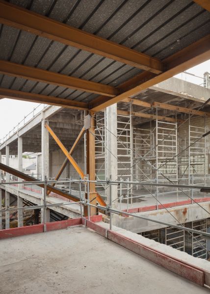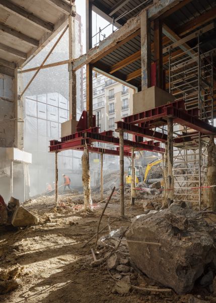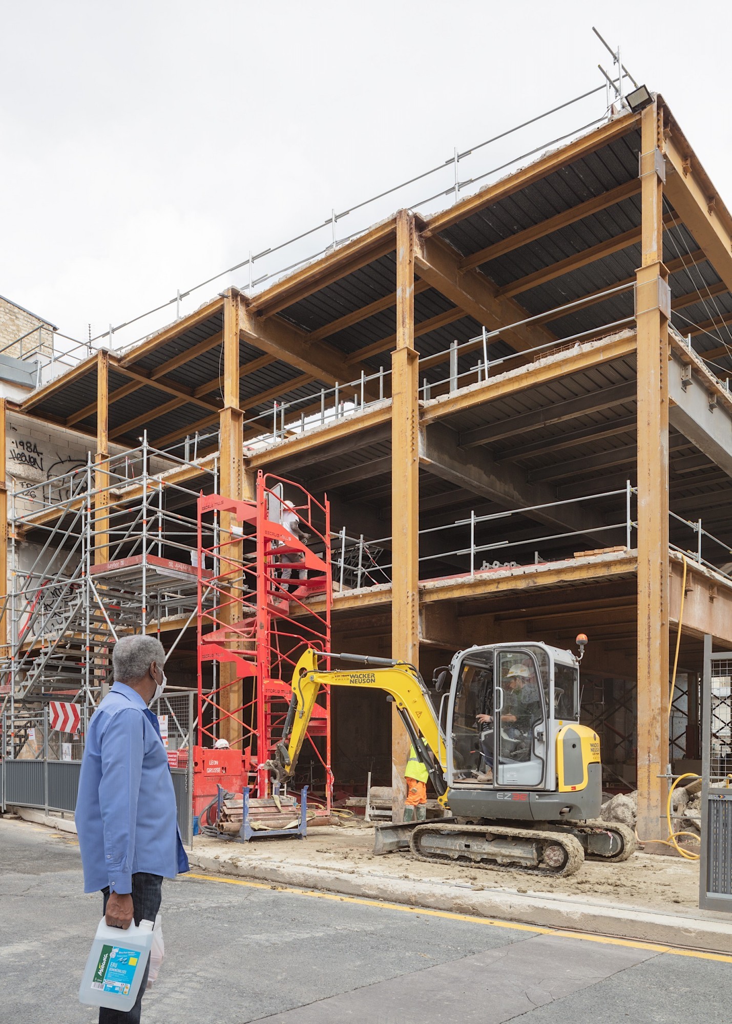 Sur rue, la façade de l’imprimerie présente des poteaux et panneaux en béton, qui dissimulent une structure en acier. Pour mettre en valeur cette pièce de patrimoine industriel ordinaire, nous proposons une réhabilitation exprimant les qualités structurelles de l’existant dans une nouvelle façade légère en acier. Une opération à faible impact carbone avec une conservation de plus de 50% des surfaces de plancher existantes et la quasi-totalité de l’emprise au sol.