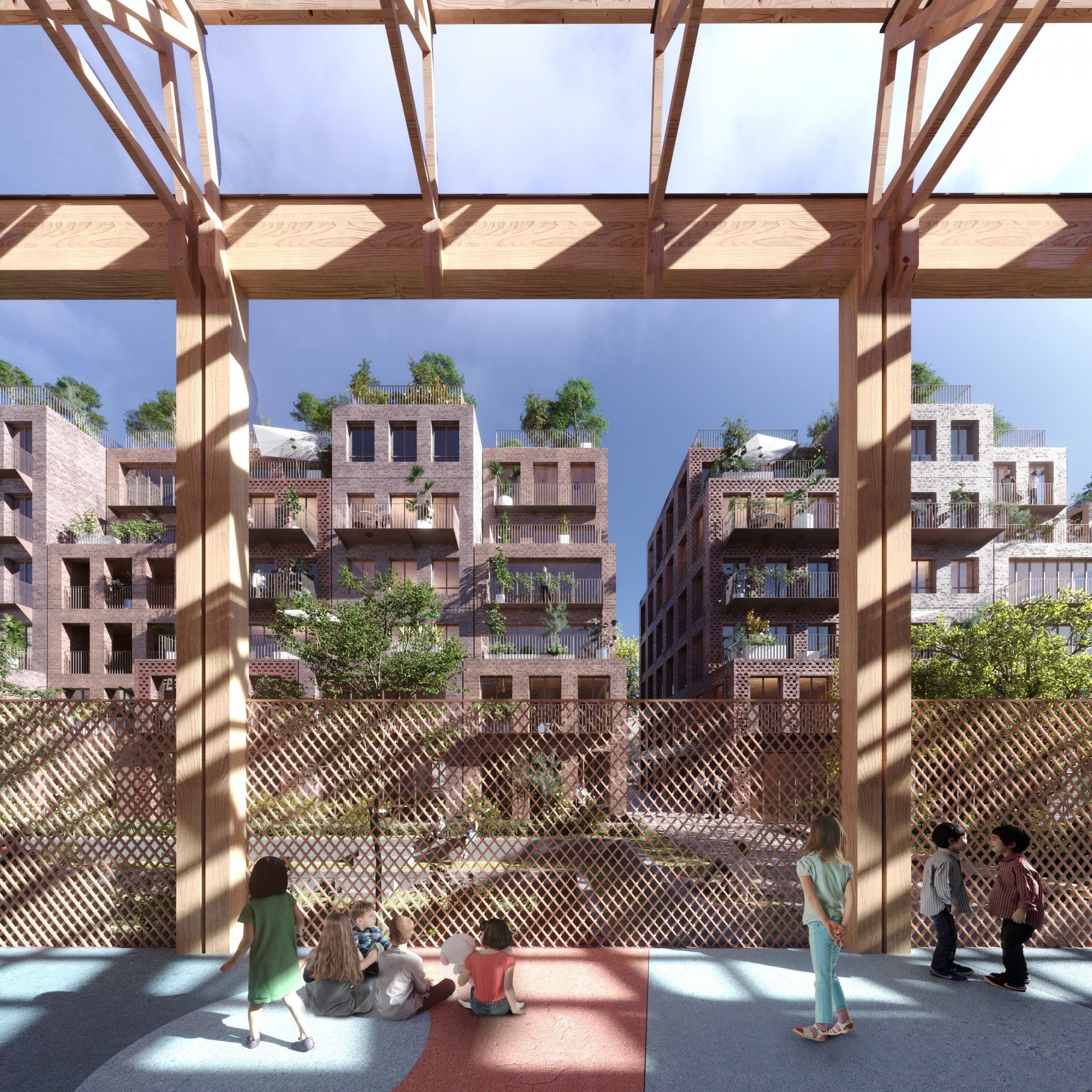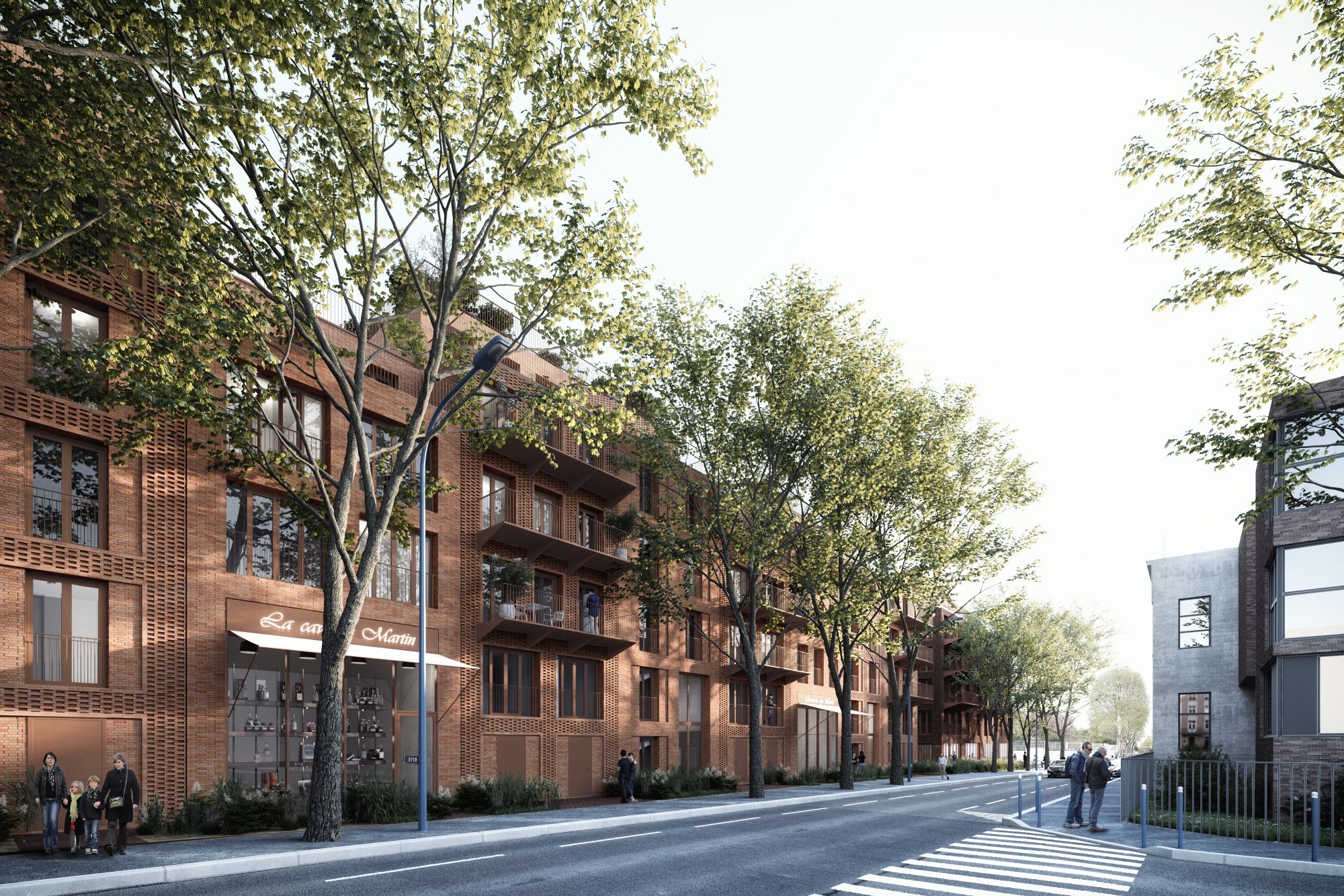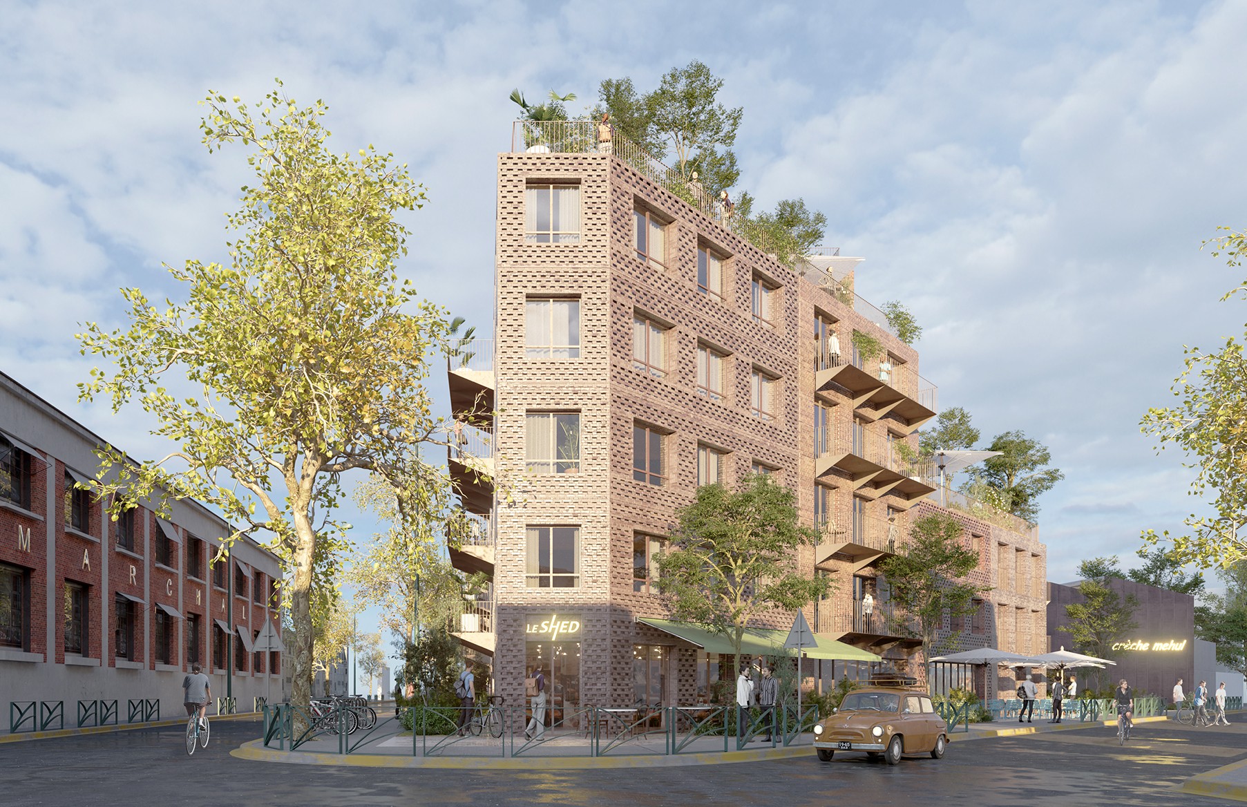 Au croisement des rues Gambetta et Paul Bert, le projet mixte lauréat sur l’îlot 6 respecte l’héritage culturel et la mixité du secteur Méhul. Le tissu urbain est caractérisé par une imbrication étroite entre usages résidentiels et industriels. Le rapport entre construction neuve et réhabilitation-transformation participe à l’équilibre recherché, notamment avec la conservation du bâti à sheds métalliques et celle, partielle, du bâti à shed béton. La densité du projet se concentre en partie nord du terrain, le long de la rue Paul Bert avec les immeubles de logements et de bureaux en R+3/4+attique. Au sud, les constructions basses de la crèche et de l’artisanat à R+1 s’inscrivent dans le prolongement de la nappe industrielle existante. Cette disposition des hauteurs assure un ensoleillement optimum des constructions et du jardin. L’ensemble des bâtiments a recours à l’usage de la brique, marqueur du passé industriel du territoire pantinois. Le petit immeuble de la crèche est en murs à ossature bois. Le revêtement du RDC est en brique pour des questions de pérennité et d'harmonie de l'îlot.