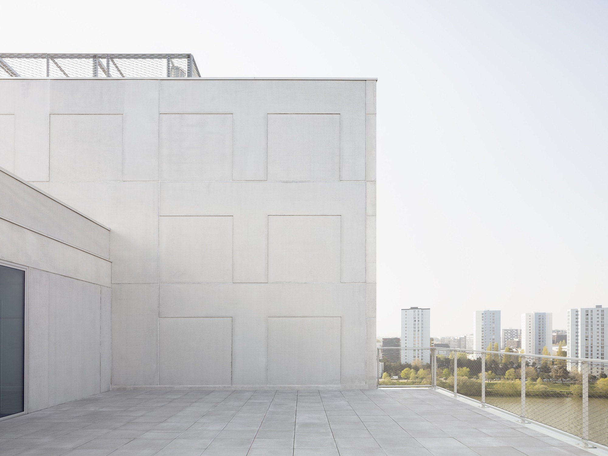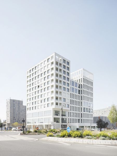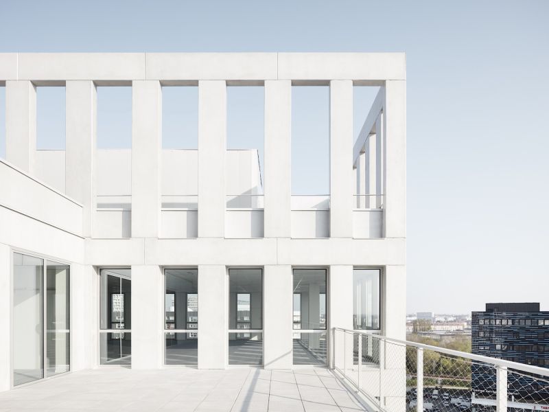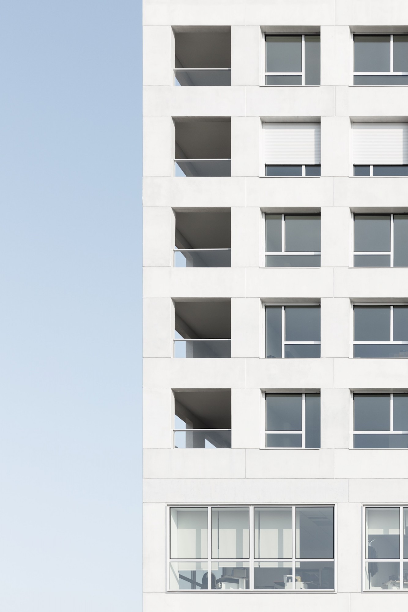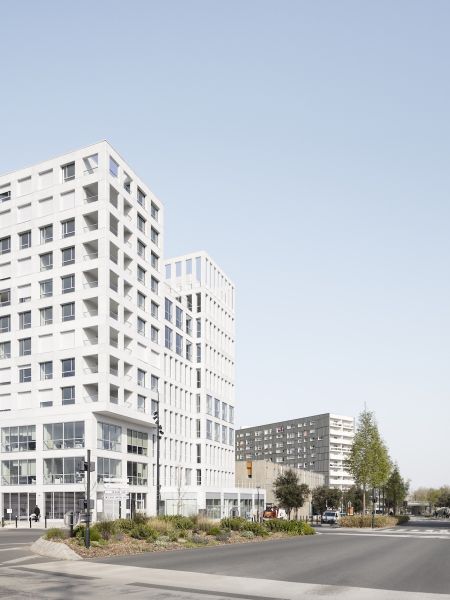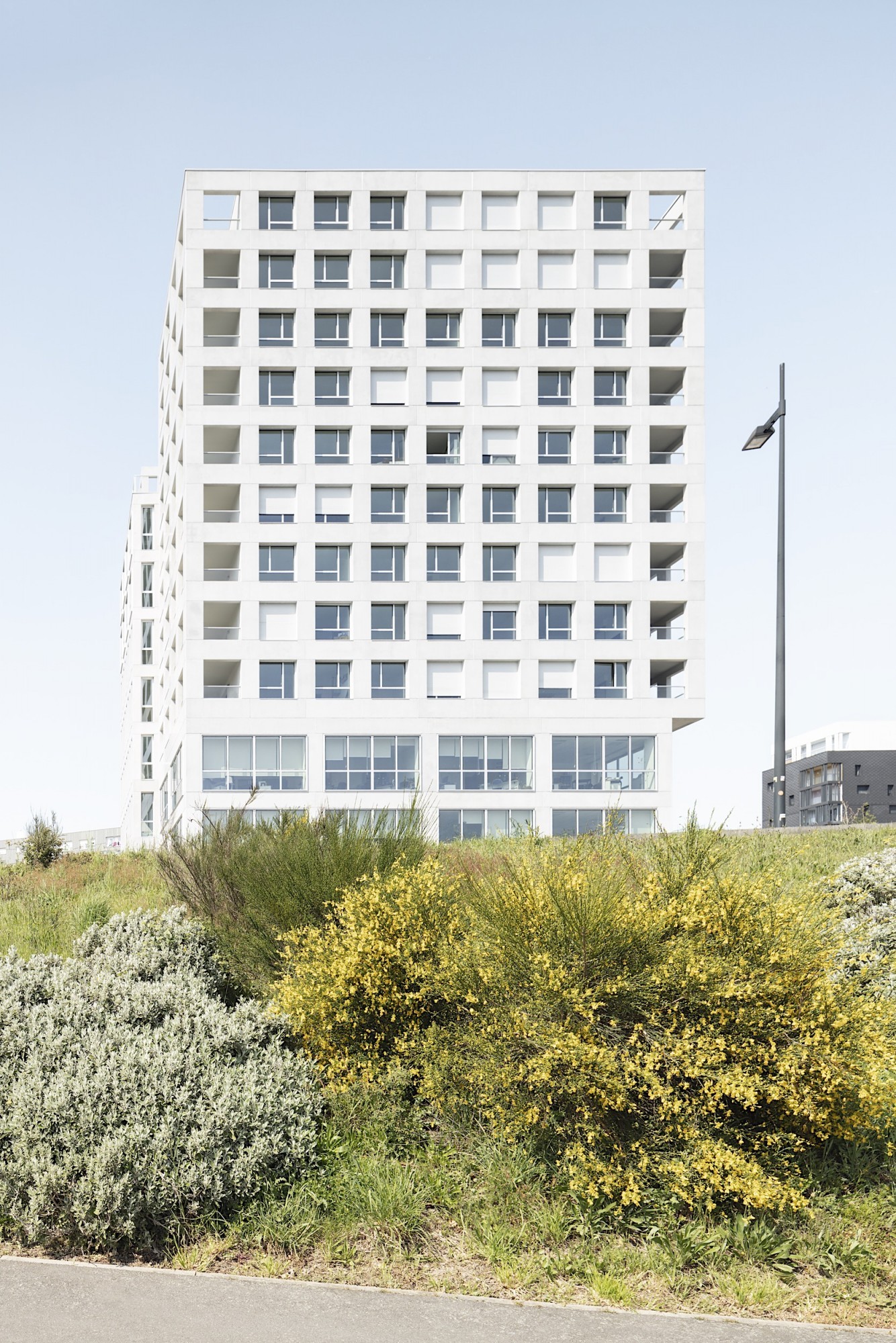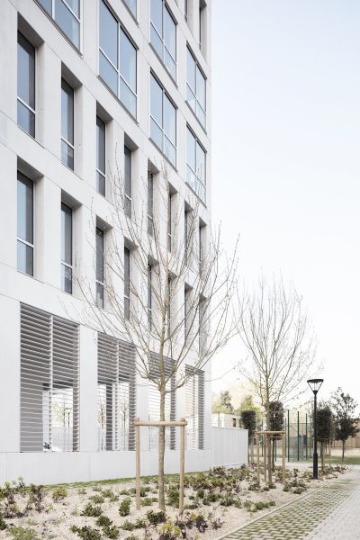 Les façades régulières sont animées par des variations de la grille sous forme d’une alternance ponctuelle de trames simples et doubles. La préfabrication des éléments en béton souligne le soin apporté à ce traitement architectural.