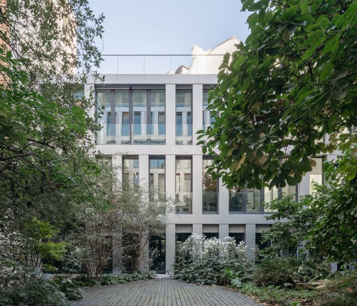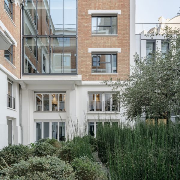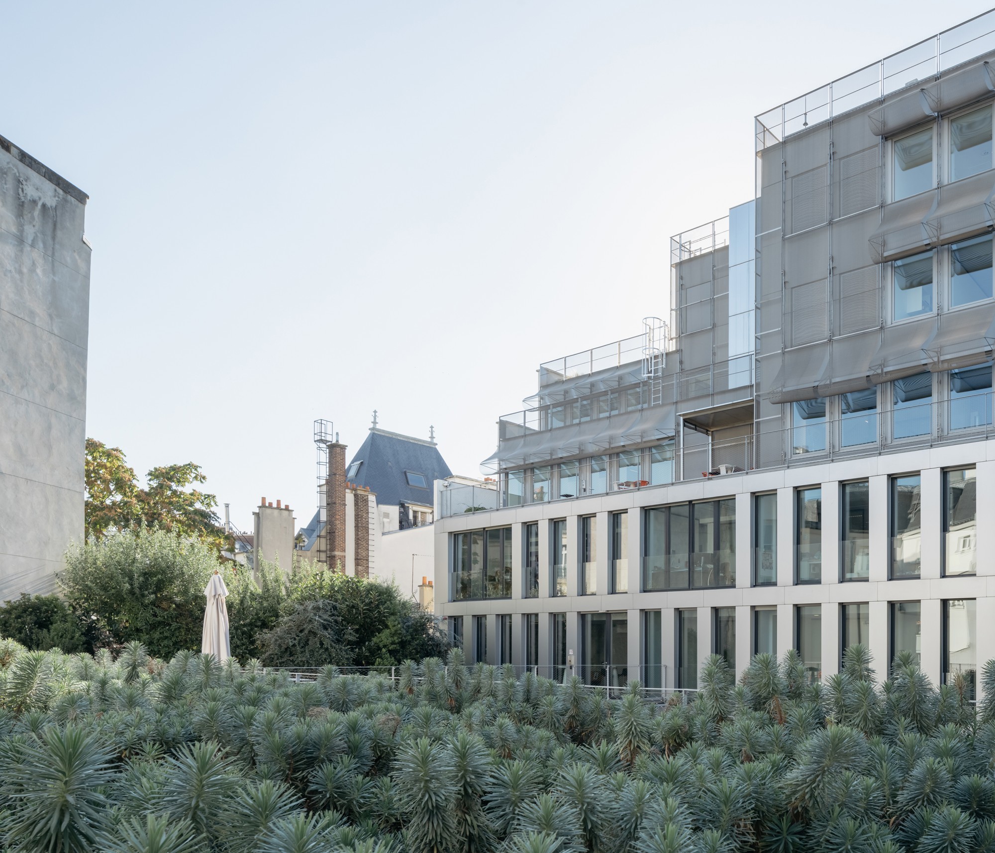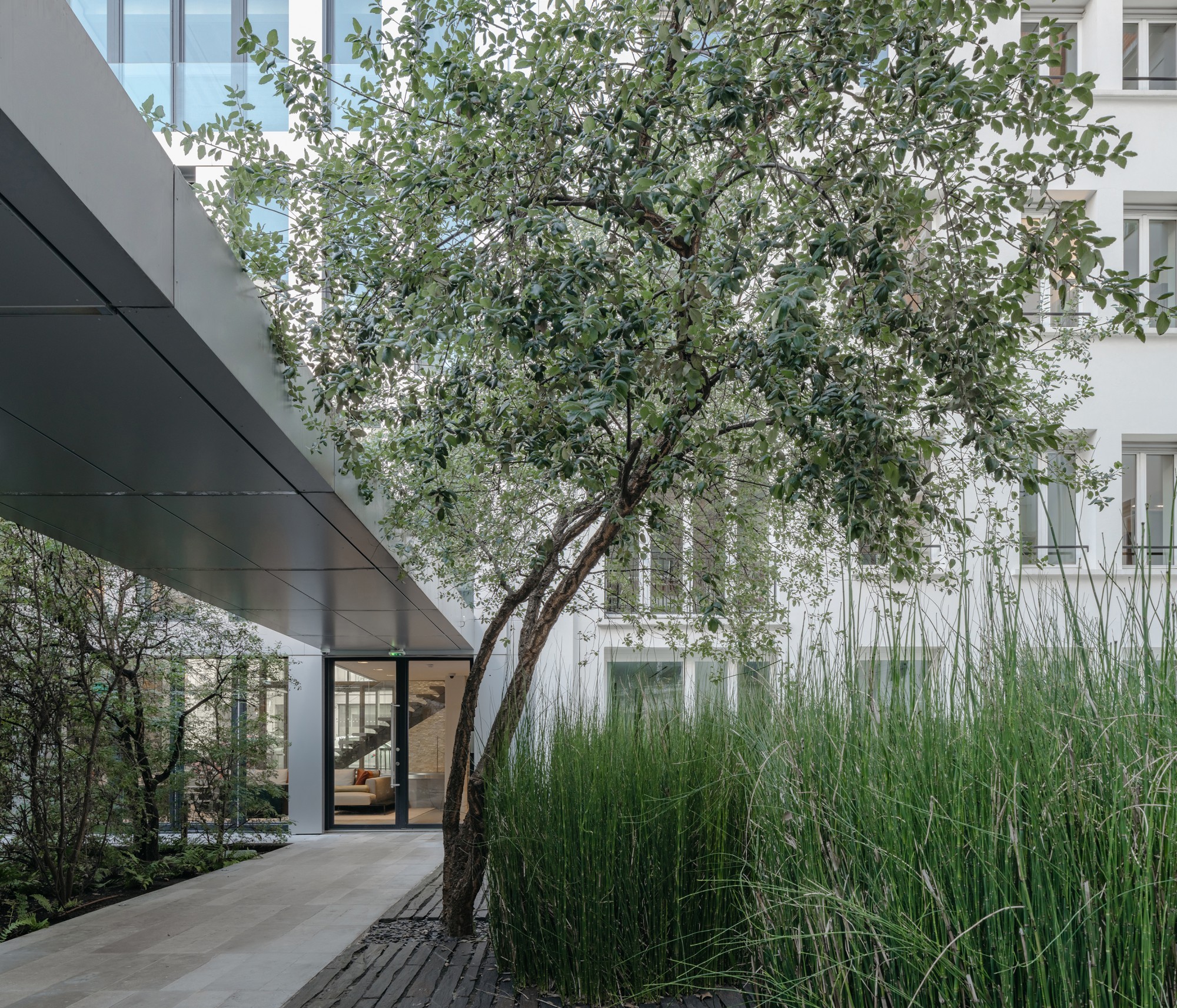 Cette restructuration donne un supplément d’âme au programme de bureaux. Le projet respecte l’histoire des immeubles existants et leur redonne les qualités urbaines souhaitées à l’origine de la construction, en les rendant plus fonctionnels, avec des circulations adaptées aux usages d’aujourd’hui et de demain. Nous choisissons de conserver l’hôtel particulier au n°5, de le réhabiliter et de le réaménager. Le n°7, qui présente peu d’intérêt patrimonial et dont les altimétries de plancher sont incompatibles avec une réunion fonctionnelle avec le n°9, est en partie démoli. Le bâtiment sur rue du n°9 est conservé. Ses ailes sur cour, mal connectées, sont démolies afin de libérer de l’espace en cœur d’îlot. Ces démolitions nous permettent de recréer une articulation des volumes sur la rue. La création d’une grande cour rectangulaire à cheval sur les trois parcelles offre une meilleure respiration vers le nord tout en marquant l’unité de l’ensemble autour d’un jardin. Enfin, les nouveaux noyaux de circulation sont conçus et placés de façon à libérer les espaces de travail, à optimiser les zones dédiées, à rationaliser les flux et à permettre une connexion entre les trois immeubles à différents niveaux.