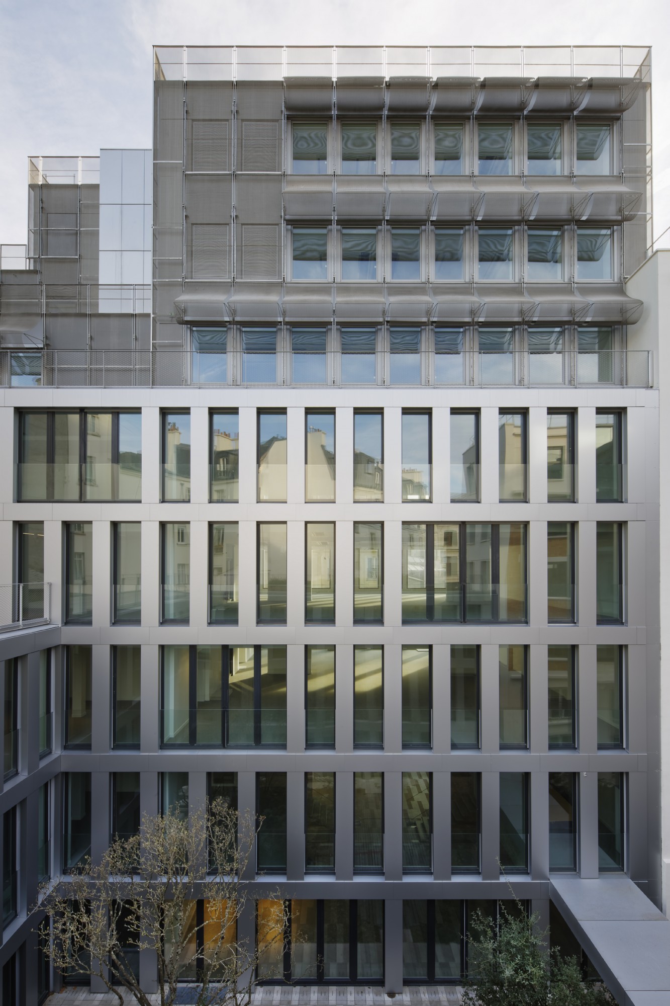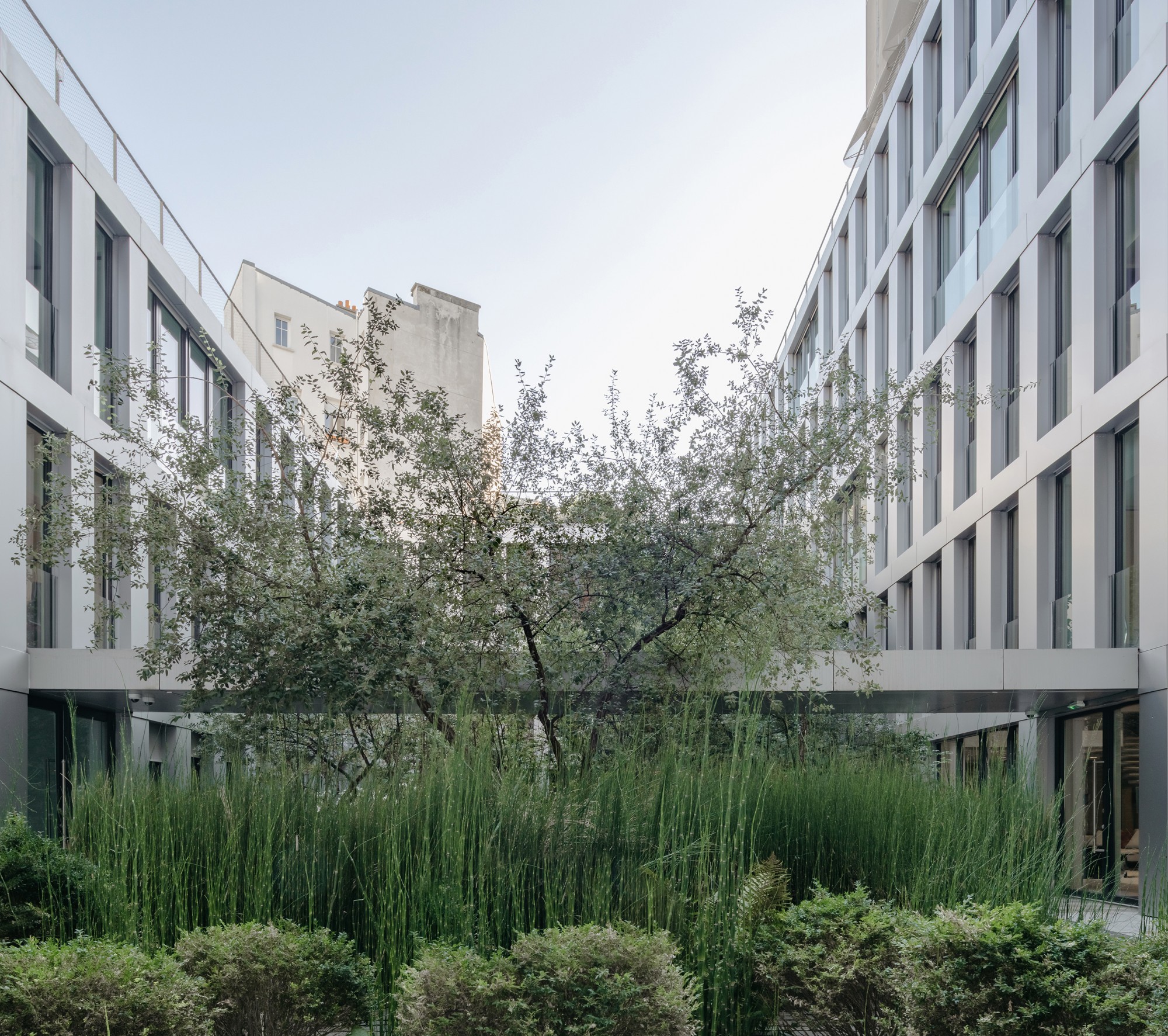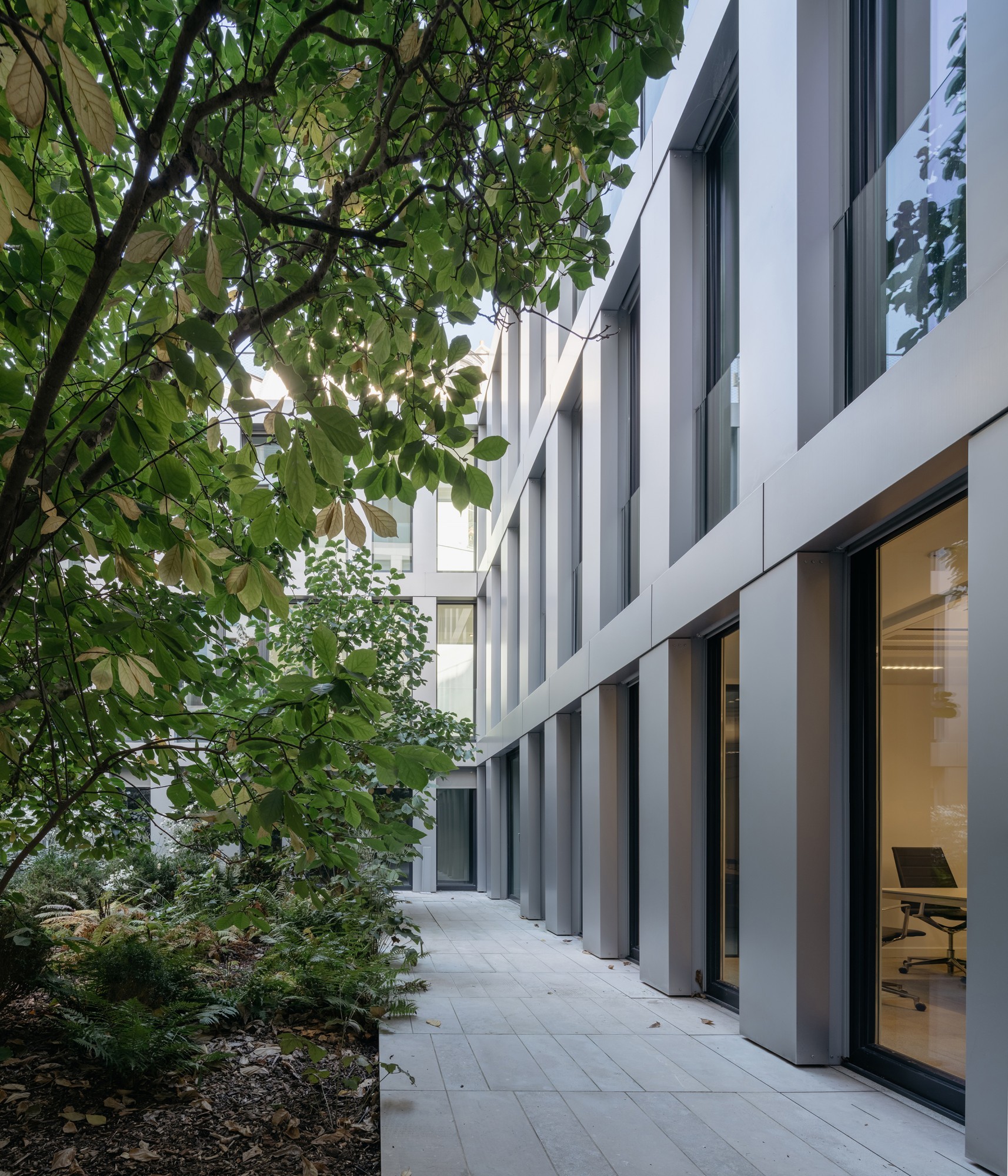 Cette restructuration donne un supplément d’âme au programme de bureaux. Le projet respecte l’histoire des immeubles existants et leur redonne les qualités urbaines souhaitées à l’origine de la construction, en les rendant plus fonctionnels, avec des circulations adaptées aux usages d’aujourd’hui et de demain. Nous choisissons de conserver l’hôtel particulier au n°5, de le réhabiliter et de le réaménager. Le n°7, qui présente peu d’intérêt patrimonial et dont les altimétries de plancher sont incompatibles avec une réunion fonctionnelle avec le n°9, est en partie démoli. Le bâtiment sur rue du n°9 est conservé. Ses ailes sur cour, mal connectées, sont démolies afin de libérer de l’espace en cœur d’îlot. Ces démolitions nous permettent de recréer une articulation des volumes sur la rue. La création d’une grande cour rectangulaire à cheval sur les trois parcelles offre une meilleure respiration vers le nord tout en marquant l’unité de l’ensemble autour d’un jardin. Enfin, les nouveaux noyaux de circulation sont conçus et placés de façon à libérer les espaces de travail, à optimiser les zones dédiées, à rationaliser les flux et à permettre une connexion entre les trois immeubles à différents niveaux.