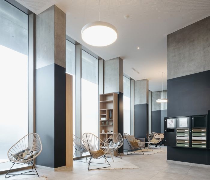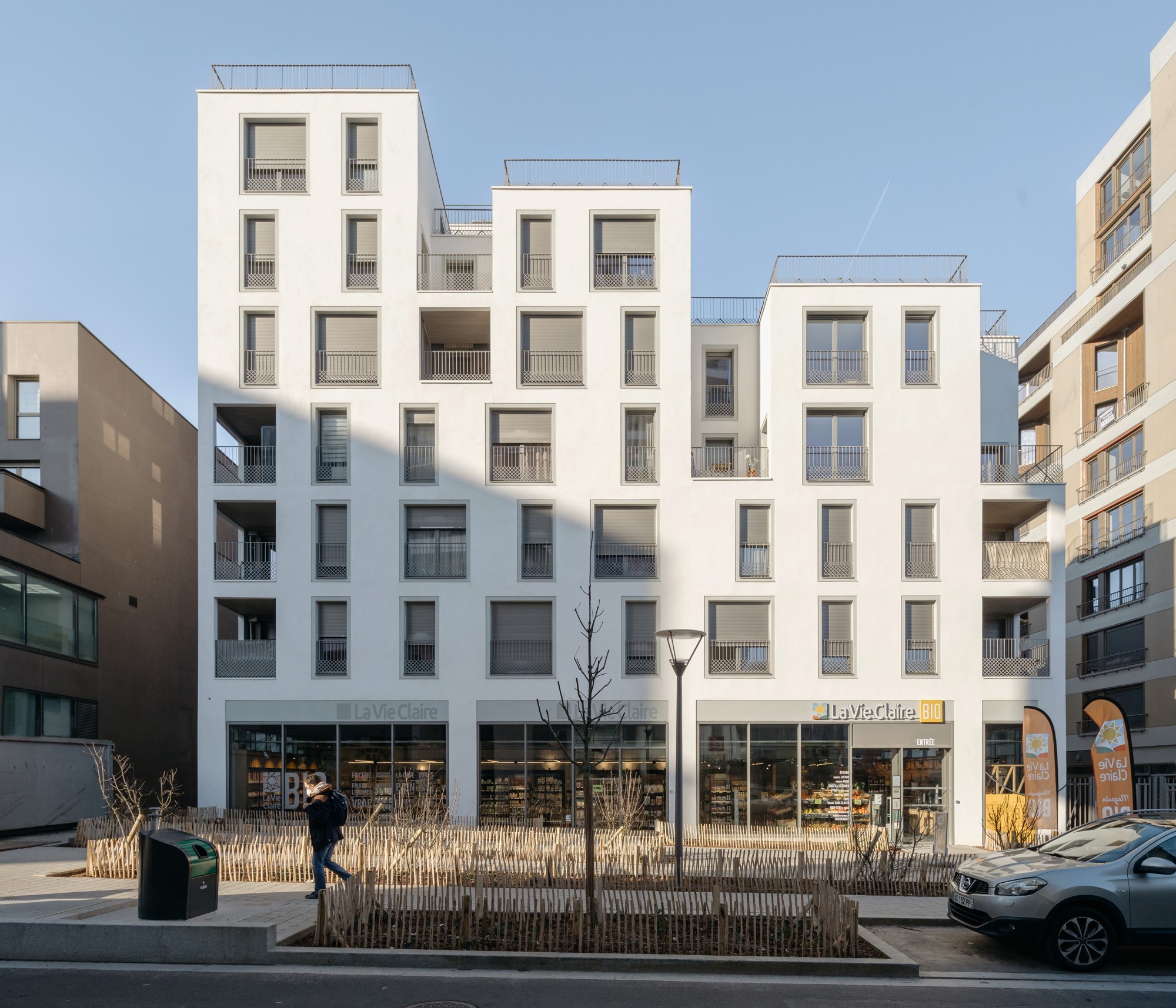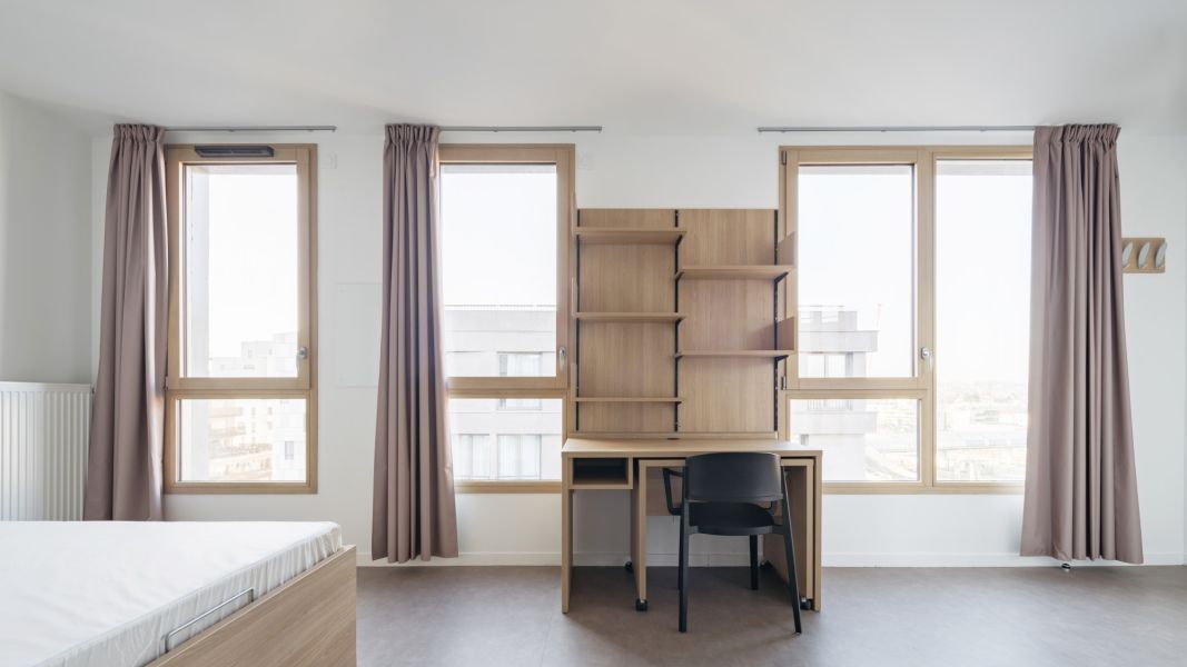 Les volumétries épannelées créent des espaces généreux : duplex, doubles hauteurs, terrasses et loggias habillées de bois. Tous les appartements ont vue sur une canopée de jardins au sol et en hauteur. Les deux résidences mutualisent leur fonctionnement, avec des circulations et services partagés à rez-de-chaussée (salle de petit déjeuner, cafétéria, laverie, salle de sport, logement du gardien) et en hauteur (grande terrasse commune au R+5). Les halls sont des espaces traversant, transparents et de grande hauteur qui expriment avec le concept paysager de perméabilité du cœur d’îlot, où se trouvent d’ailleurs les entrées des nombreux locaux vélos.