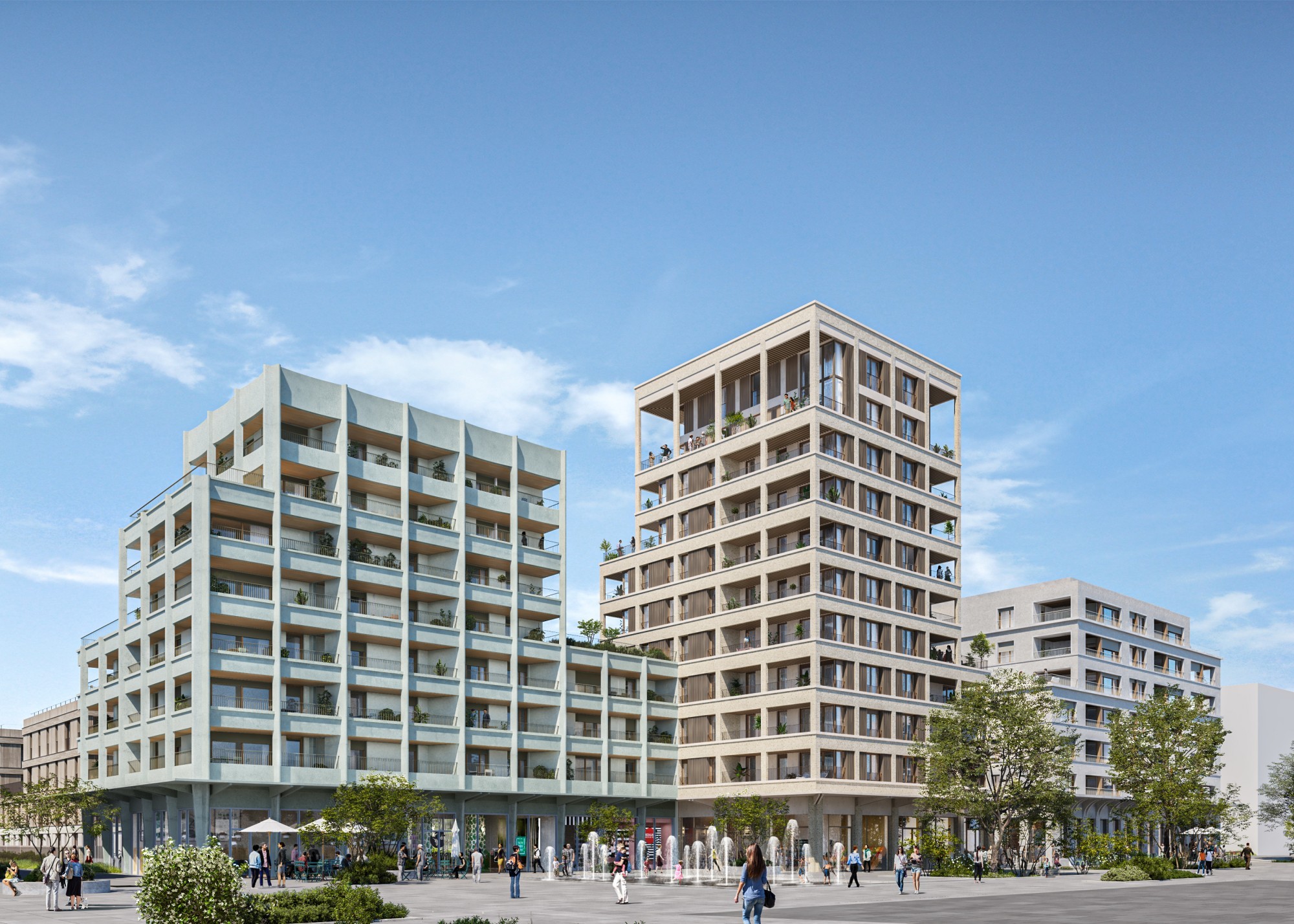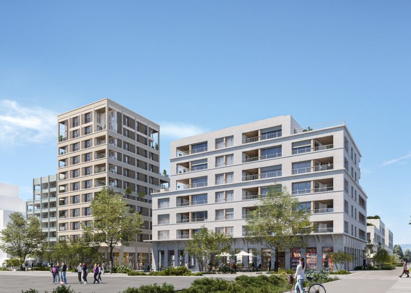 La commune d’Ambilly se trouve au cœur de la ZAC Etoile qui assure la connexion entre Annemasse et Genève. Le lot C8 développé par les architectes Atelier Martel, Cathrin Trebeljahr, Bamaa et Hardel Le Bihan, affiche une cohérence consolidée au fil d’ateliers collaboratifs avec l’urbaniste D&A et la maîtrise d’ouvrage. Pour le lot C8.1 (Hardel Le Bihan, Bamaa), le choix d’une matérialité commune déclinant béton sablé et douglas contribue à l’harmonie de l’ensemble. Nous avons aussi travaillé l’accroche des immeubles mitoyens G1 et G2 à travers des bandeaux filants et un pas d’étage identique. La principale émergence de l’îlot à R+10 répond à la flexibilité attendue par un système de grille en béton dans laquelle s’insèrent des panneaux de bois qui intègrent des fenêtres à simple ou double vantaux. Dispositif qui permettra de re-tramer les fenêtres en cas de changement d’usage.