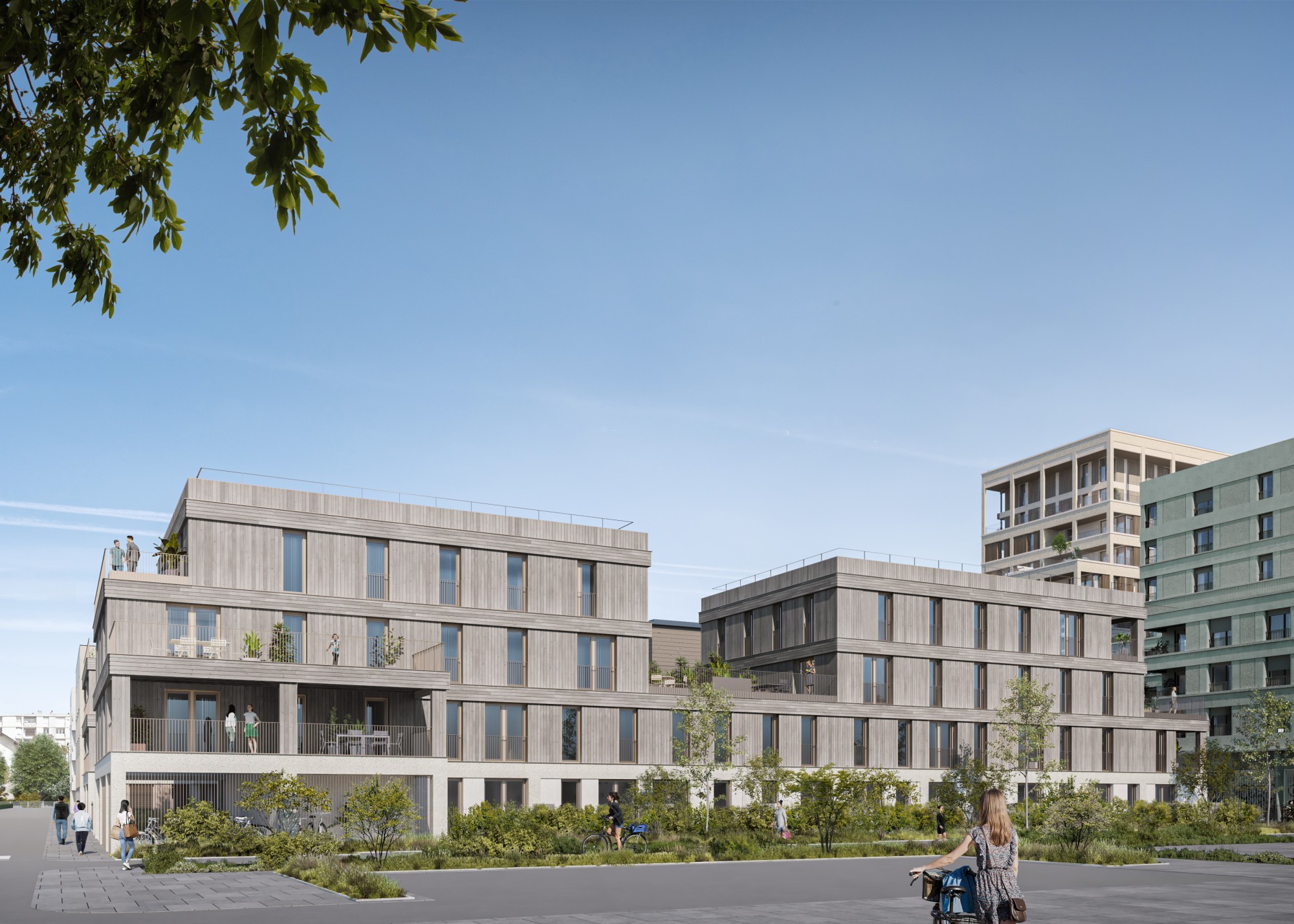 Les petits collectifs des lots E et F assurent la transition avec le tissu pavillonnaire. Immeubles de trois étages à ossature bois et façades en douglas grisé sur socle en béton sablé, ils présentent une majorité de duplex, des noyaux de circulation éclairés naturellement et des séjours ouverts sur des espaces extérieurs, jardin ou terrasse.