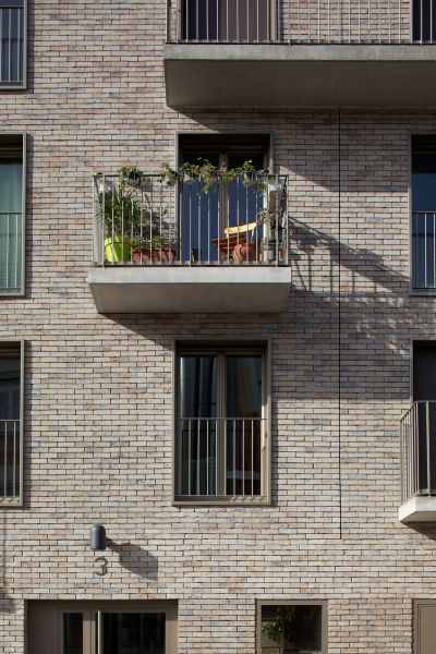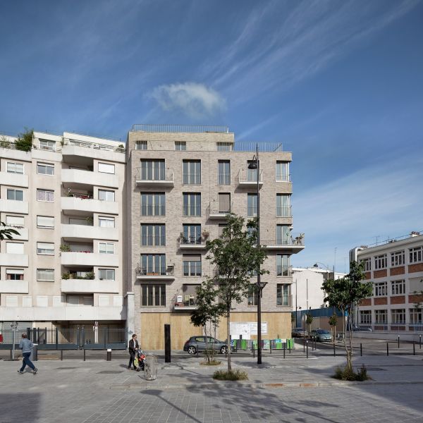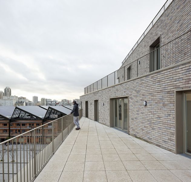 Un noyau unique de circulation vertical composé d’un escalier encloisonné et d’un ascenseur dessert le sous-sol et les six niveaux supérieurs. Les quatre premiers abritent deux petits appartements mono orientés, un deux pièces d’angle et deux T3 traversants aux extrémités. Les 5e et 6e niveaux sont concentrés sur la rue Pajol en adossement sur le pignon du 29. Leurs retraits successifs dégagent de larges terrasses accessibles.