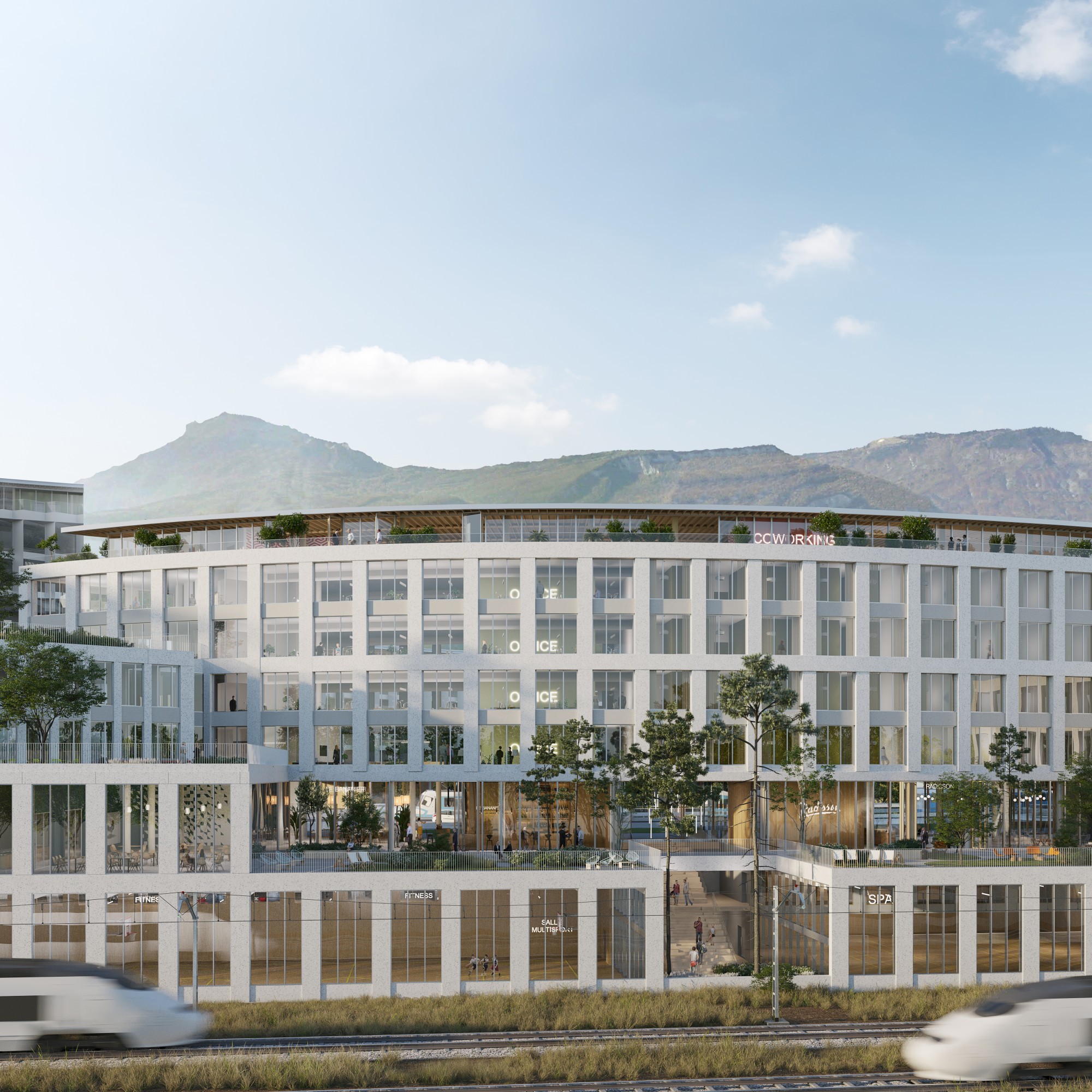 L'équipement mixte de la place Nelson Mandela, sur la presqu'île de Grenoble, est une imbrication de programmes composée de bureaux et d'un hôtel 5*, d'un restaurant intérieur-extérieur, un coworking, un spa-fitness et une piscine. La façade elliptique - imposée par le contexte urbain et le concours, sur le modèle de la façade de Christian de Portzamparc en vis-à-vis - est une contrainte qui s’ajoute à la complexité du site, à la présence du faisceau ferré SNCF d’un côté, des rails du tramway de l’autre. Le futur bâtiment offre une vue imprenable sur les cimes alpines et le grand paysage de la presqu’île.
