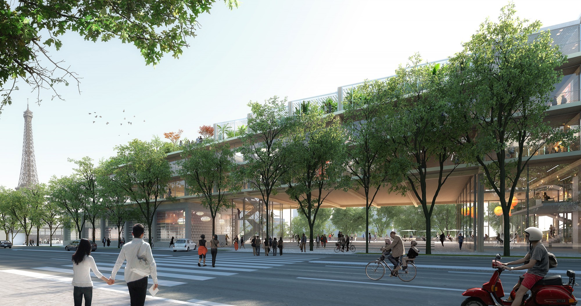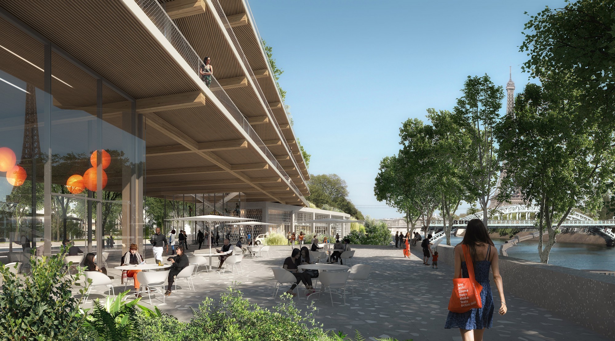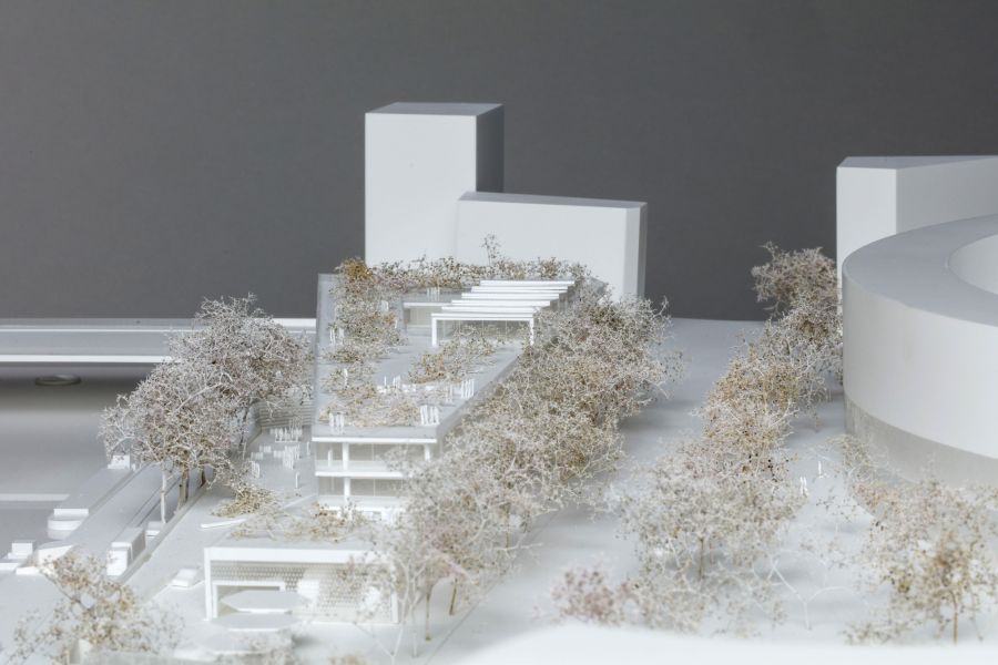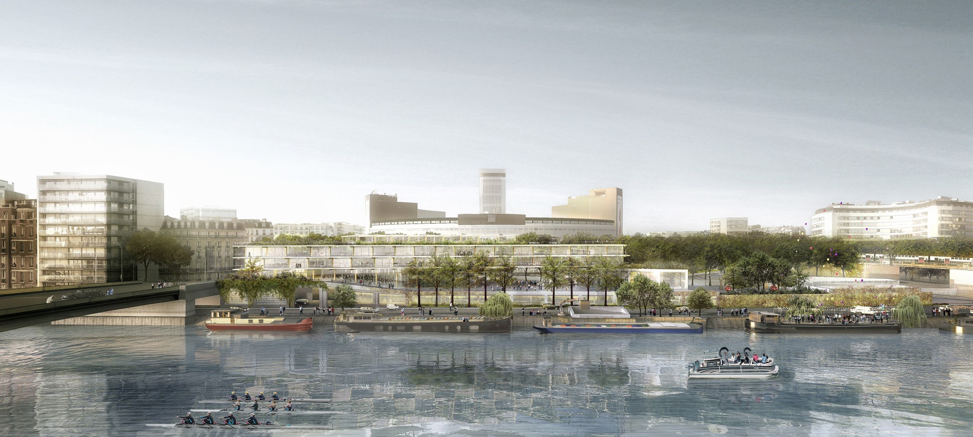 Pour s’intégrer au paysage horizontal des quais, la station multi-énergie est dessinée tout en longueur, aux pieds de la Maison de la Radio à Paris. À la façon d’un bâtiment léger sur pilotis, le pôle d’enseignement supérieur conçu par Hardel Le Bihan se compose de deux plateaux suspendus, prolongés par des balcons filants en belvédère. Ceux-ci sont surmontés d’un pavillon attique ouvert sur sa toiture jardin. Le pôle offre une façade légère et transparente, rythmée par les plis du vitrage qui dialoguent avec l’onde et multiplient les angles de vue panoramique. À l’intérieur, pour porter un nouveau paradigme éducatif basé sur l’entreprenariat, ses plateaux flexibles en ossature bois accueillent diverses formes pédagogiques, dans des espaces d’enseignement et dans un incubateur qui a vocation à assurer la transition des jeunes diplômés vers la vie active, en continuité de ces plateaux. Sa conception lui permet d’atteindre au moment de sa construction la labellisation environnementale E+/C-, la plus exigeante et conforme aux ambitions bas carbone de la Ville de Paris.
