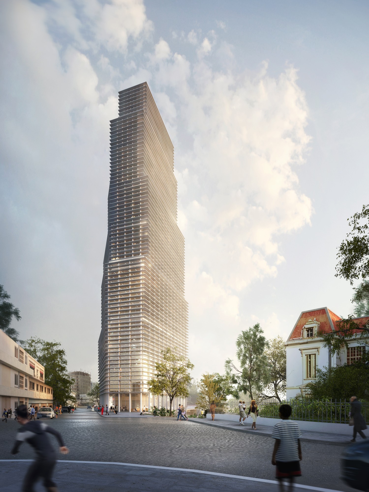 Notre proposition consiste en un bâtiment de bureaux offrant des espaces de travail confortables et lumineux aux futurs utilisateurs, des espaces ouverts sur la Ville ; mais aussi un nouveau repère urbain symbole de modernité et de respect de l’environnement. Le choix de la hauteur (110 mètres) répond à ce double objectif : l’élancement de la tour donne aux plateaux de bureaux une profondeur idéale pour l’éclairement naturel et des vues lointaines sur la presqu’île et l’océan. Il rend d’autre part le bâtiment visible depuis la corniche, le plateau et le port. Les nombreux buildings qui forment la skyline actuelle de Dakar (BCEAO, Fahd, Faycal, Kébé, Peytavin, Hôtel Indépendance…) datent pour la plupart des années 60-70. Il nous semblait pertinent qu’un bâtiment de grande hauteur, contemporain et emblématique, participe de ce panorama architectural, comme un symbole du renouveau urbain et économique de la capitale.